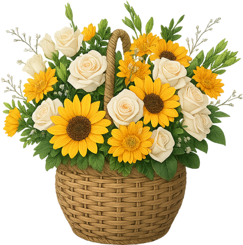 Đồ hoạ Giỏ hoa, hoa hướng dương, hoa hồng, hoa màu vàng, hoa màu trắng, giỏ mây, trang trí, quà tặng, lãng mạn, flower basket, sunflower, rose, yellow flower, white flower, wicker basket, decoration, gift, romance