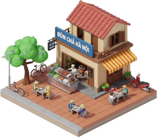 Đồ hoạ Mô hình, bún chả hà nội, quán ăn, ẩm thực, nón lá, xe máy, xe đạp, vỉa hè, hà nội, việt nam, model, bun cha ha noi, food shop, cuisine, conical hat, scooter, bicycle, sidewalk, hanoi, vietnam