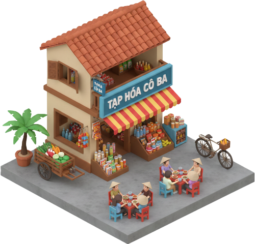 Đồ hoạ Mô hình, tạp hóa cô ba, cửa hàng tạp hóa, bách hóa, ăn uống, nón lá, xe đạp, cây dừa, vỉa hè, việt nam, model, co ba general store, convenience store, grocery, eating, conical hat, bicycle, palm tree, sidewalk, vietnam