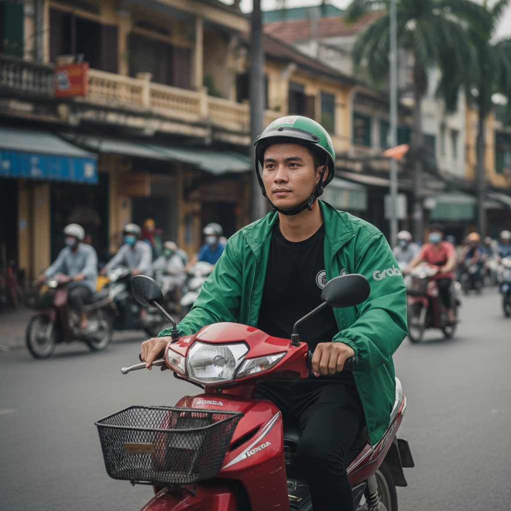 Một chàng trai việt nam, 20 tuổi, có đôi mắt đẹp, sóng mũi cao, tóc ngắn, mặc áo khoác grab, đang cưỡi xe máy wave anpha 110 .