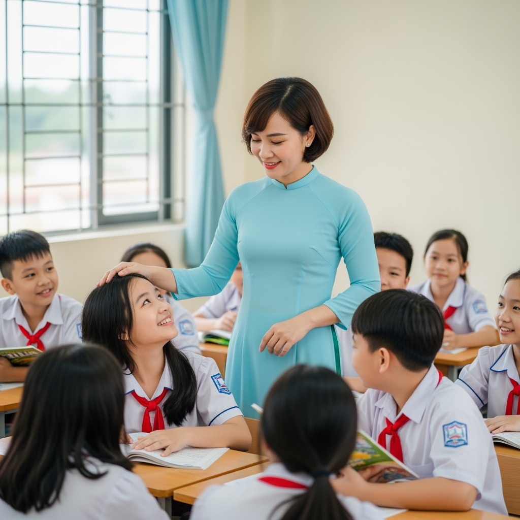 Tạo hình ảnh cô giáo xinh đẹp tóc ngắn mặc áo dài với lớp các bạn lớp 4a1 đang đứng quanh và nhìn cô. Một tay cô đữa lên xoa đầu 1 bạn nữ tóc dài xinh đẹp. Tiếng việt. Với đặc điểm Phong cách: Thực tế (Photorealistic)