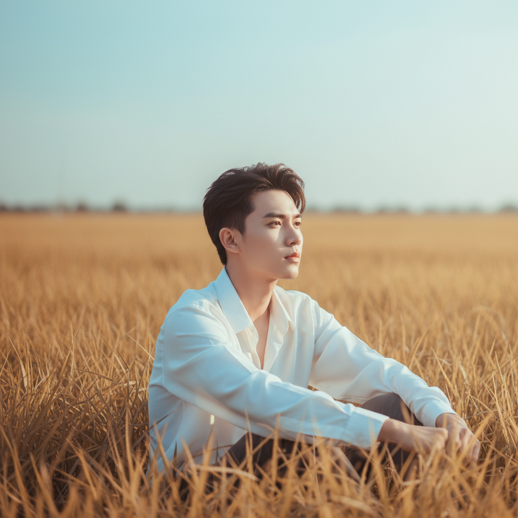 tạo hình ảnh người con trai đẹp áo trắng buồn suy tư ngồi bên đồng cỏ vàng úa và bầu trời xanh.