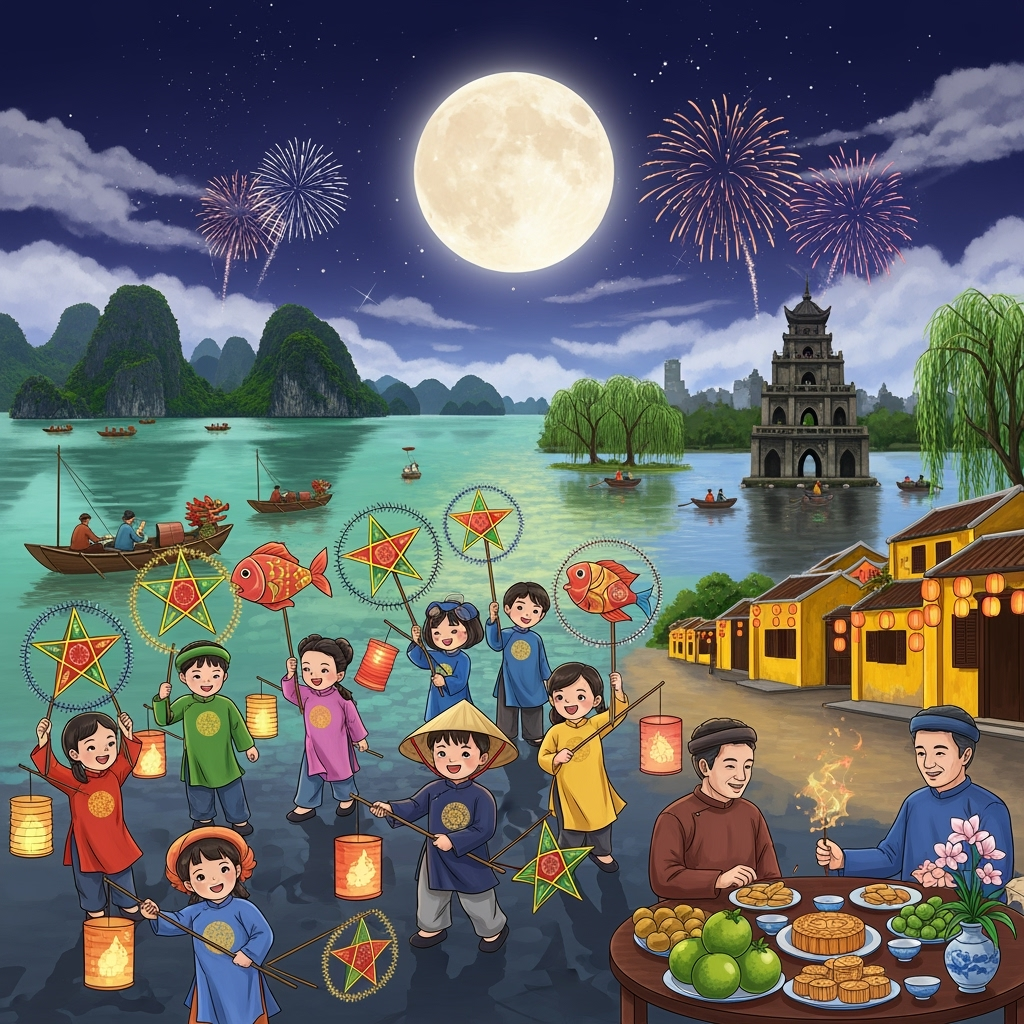 TẠO HÌNH ẢNH TRUNG THU KẾT HỢP VỚI CÁC ĐỊA DANH NỔI TIẾNG CỦA VIỆT NAM. Với đặc điểm Phong cách: Hội họa (Digital Painting)