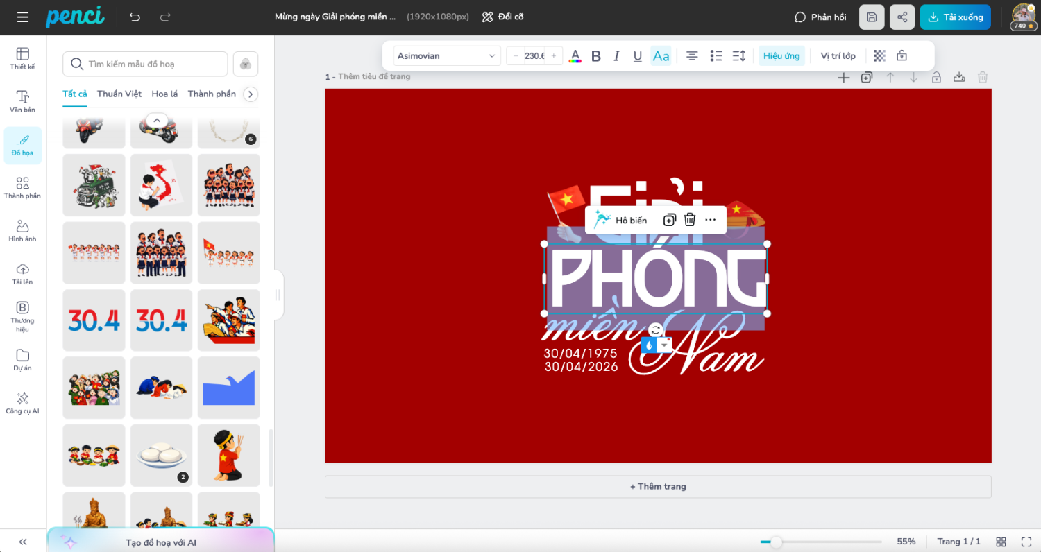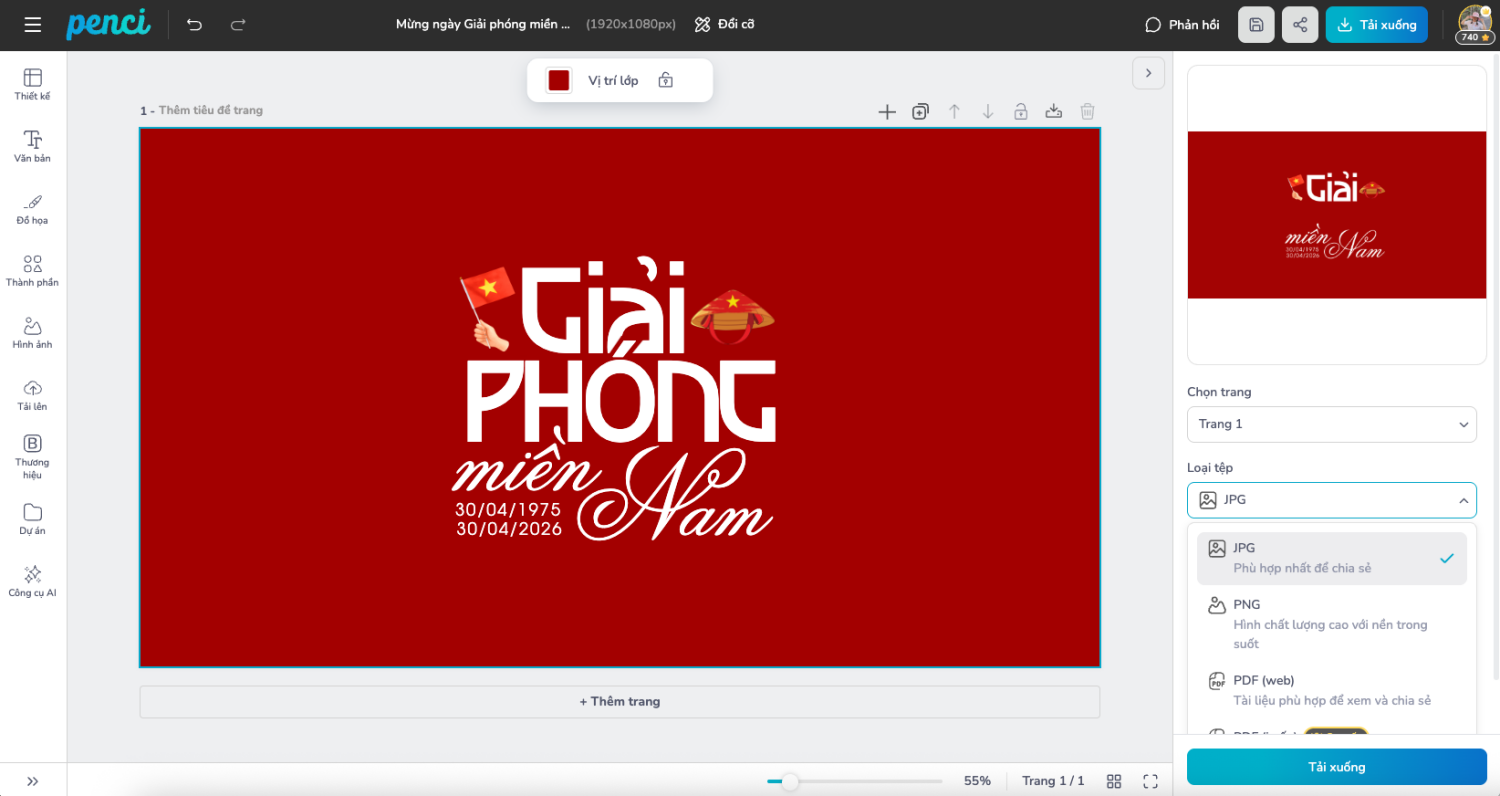 thieke thuvien Bộ hình nền 30/4 Full HD, 4K ấn tượng, tải về miễn phí và dễ dàng chỉnh sửa By admin | 09 tháng 04 năm 2026 25 đã đọc Hình nền 30/4 không chỉ là để trang trí thiết bị mà còn là cách thể hiện tinh thần tự hào dân tộc trong dịp lễ lớn. Với nhu cầu sử dụng ngày càng đa dạng, các mẫu hình nền Full HD, 2K, 4K được thiết kế tối ưu giúp hiển thị sắc nét trên cả máy tính và điện thoại. Dưới đây là bộ hình nền 30/4 đẹp, ấn tượng, miễn phí và dễ dàng chỉnh sửa online. 1. Ý nghĩa ngày 30/4 thống nhất đất nước Ngày 30/4/1975 là cột mốc lịch sử đặc biệt, đánh dấu sự kiện đất nước hoàn toàn thống nhất sau nhiều năm chia cắt. Đây không chỉ là chiến thắng về mặt quân sự, mà còn là biểu tượng của ý chí kiên cường, tinh thần đoàn kết và khát vọng độc lập của dân tộc Việt Nam. Trải qua nhiều thập kỷ, ý nghĩa của ngày 30/4 vẫn còn nguyên giá trị. Đó là dịp để mỗi người nhìn lại quá khứ, trân trọng hiện tại và ý thức rõ hơn về trách nhiệm gìn giữ, phát triển đất nước. Trong bối cảnh hiện đại, những hình thức thể hiện như sử dụng hình nền mang chủ đề yêu nước cũng trở thành một cách lan tỏa tinh thần này, nhẹ nhàng nhưng không kém phần sâu sắc. Xe tăng Quân Giải phóng tiến vào Dinh Độc Lập. Ảnh: Điện ảnh Quân đội nhân dân Tìm hiểu thêm về ngày Giải phóng miền Nam, thống nhất Đất nước. 2. Tổng hợp bộ hình nền 30/4 đẹp nhất năm 2026 Hình nền máy tính chủ đề "Tự hào Việt Nam" chào mừng ngày 30/4 Full HD, 4K sắc nét Các mẫu hình nền máy tính năm 2026 tập trung vào thông điệp thể hiện tình yêu nước. Màu đỏ và vàng vẫn là chủ đạo, nhưng được xử lý tinh tế hơn với hiệu ứng ánh sáng, chuyển màu và bố cục hiện đại. Những mẫu hình nền này có thể sử dụng cá nhân, ứng dụng trong môi trường làm việc, trình chiếu hoặc truyền thông. Hình nền 30/4 cờ đỏ Wallpaper 30/4 4K Việt Nam Hình nền 30/4 chào mừng kỉ niệm ngày Giải phóng miền Nam Wallpaper 30/4 ánh sáng vàng Hình nền 30/4 tối giản Wallpaper 30/4 typography Việt Hình nền 30/4 chiến thắng Wallpaper 30/4 nền đỏ sao vàng Hình nền máy tính yêu Việt Nam Ảnh làm nền thể hiện tình yêu nước Việt Hình nền máy tính chào mừng 30/4 Bạn muốn xem trọn bộ hình nền máy tính cho ngày 30/4? Hình nền điện thoại 30/4 yêu nước đẹp và ấn tượng Đối với điện thoại, yếu tố quan trọng nhất là sự gọn gàng và dễ nhìn. Các mẫu hình nền thường được thiết kế theo bố cục dọc, giữ khoảng trống hợp lý để không che khuất icon ứng dụng. Dù đơn giản hơn so với bản desktop, nhưng vẫn đảm bảo cảm xúc khi sử dụng. Hình nền điện thoại 30/4 đẹp Wallpaper 30/4 dọc Việt Nam Hình nền 30/4 cờ đỏ sao vàng Wallpaper 30/4 tối giản Hình nền điện thoại yêu nước Wallpaper 30/4 nền đỏ Xem thêm: Hình nền điện thoại 30/4, có thể chỉnh sửa trực tiếp 3. Cách chỉnh sửa hình nền trực tiếp bằng công cụ Penci Thay vì chỉ tải hình nền có sẵn, Penci cho phép người dùng tùy chỉnh hình nền máy tính trực tiếp online một cách đơn giản và nhanh chóng. Penci là công cụ thiết kế dành cho người Việt, cung cấp thư viện mẫu hình nền đa dạng, được thiết kế sẵn theo các độ phân giải phổ biến như Full HD, 2K và 4K. Chọn mẫu từ thư viện và bắt đầu chỉnh sửa Giao diện thiết kế của Penci trực quan, thao tác kéo thả dễ sử dụng, không yêu cầu cài đặt phần mềm hay kỹ năng thiết kế chuyên sâu. Người dùng có thể thay đổi màu sắc, chỉnh sửa nội dung chữ hoặc thông điệp cá nhân để hình nền phù hợp hơn với nhu cầu sử dụng, từ cá nhân đến doanh nghiệp. Chỉnh sửa mọi chi tiết dễ dàng bằng thao tác kéo thả Hệ thống font chữ tiếng Việt và đồ họa Thuần Việt trên Penci được chọn lọc kỹ, đảm bảo tính thẩm mỹ và phù hợp văn hóa. Sau khi hoàn thiện, người dùng có thể xuất file chất lượng cao, đúng tỉ lệ màn hình máy tính, sẵn sàng sử dụng ngay mà không lo vỡ nét hay sai kích thước. Tải hình ảnh xuống miễn phí Tóm lại Hình nền 30/4 là cách giúp người dùng thể hiện sự gắn kết với lịch sử và bản sắc dân tộc. Một thiết kế phù hợp có thể tạo cảm hứng mỗi khi mở máy, đồng thời góp phần lan tỏa tinh thần tự hào theo cách tự nhiên nhất. Trong rất nhiều lựa chọn hiện nay, điều quan trọng không phải là tải bao nhiêu mẫu, mà là chọn được hình nền phù hợp với nhu cầu và thông điệp cá nhân. Và khi có thể tự chỉnh sửa, cá nhân hóa dễ dàng, mỗi hình nền không còn là “ảnh có sẵn”, mà trở thành một dấu ấn riêng đơn giản, nhưng đủ để tạo khác biệt. Xem thêm: - Tổng hợp mẫu Thông báo nghỉ lễ Giỗ tổ Hùng Vương, Ngày 30/4 và Quốc tế Lao động 1/5 đẹp, Thuần Việt và mới nhất 2026 - Tổng hợp mẫu backdrop chào mừng lễ 30/4 - 1/5 ý nghĩa, đẹp, miễn phí và chỉnh sửa online dễ dàng - 99+ mẫu Avatar 30/4, Khung ảnh đại diện Facebook, Zalo 30/4 đẹ