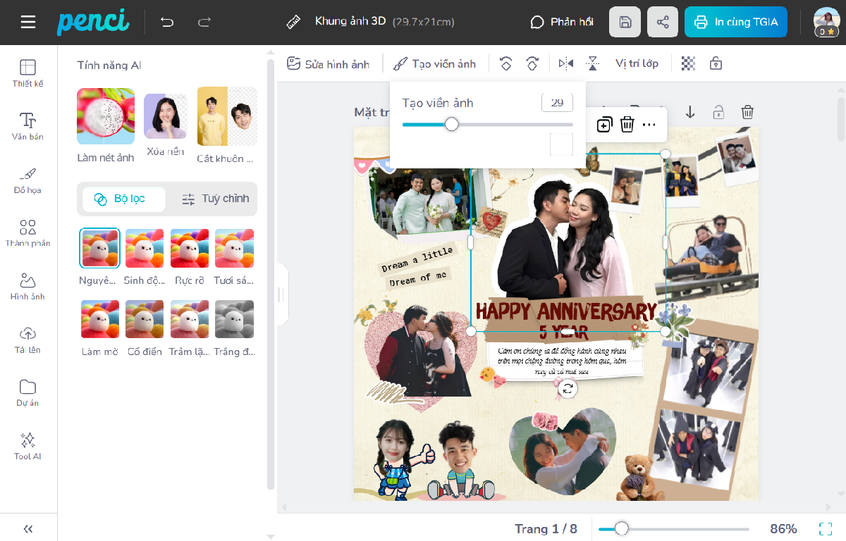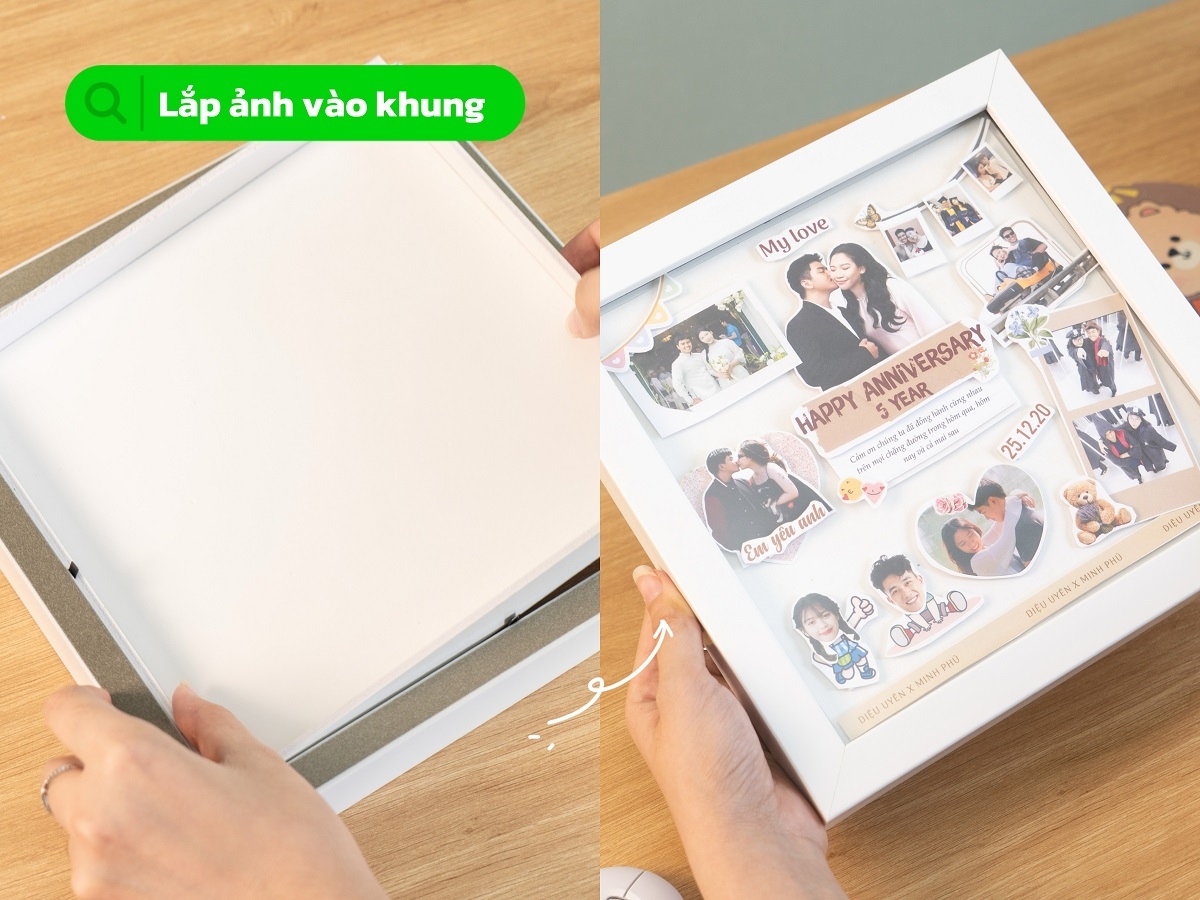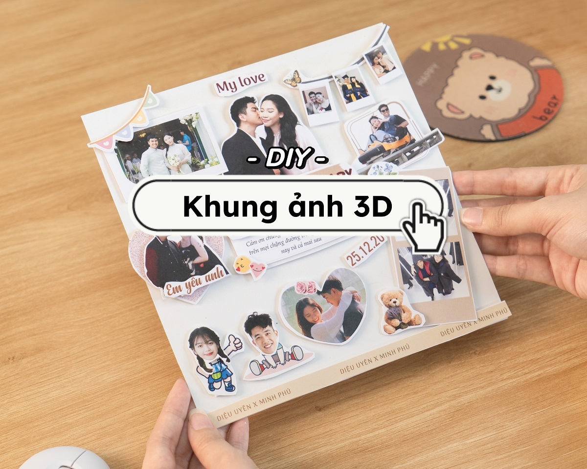 thieke thuvien Cách làm khung ảnh 3D handmade bằng ảnh in theo yêu cầu cực kỳ đơn giản, hướng dẫn chi tiết By admin | 24 tháng 10 năm 2025 8 đã đọc Bạn có bao giờ muốn lưu giữ những khoảnh khắc đặc biệt của mình theo cách thật độc đáo và ý nghĩa? Một khung ảnh 3D handmade sẽ giúp bạn làm điều đó, đây vừa là món quà tặng handmade tinh tế, vừa là vật trang trí khiến không gian thêm ấm áp. Hãy cùng Penci khám phá cách làm khung ảnh 3D handmade bằng ảnh in theo yêu cầu cực kỳ đơn giản, ai cũng có thể thực hiện được ngay tại nhà! >> Xem thêm các ý tưởng quà tặng handmade dễ làm, độc đáo, ấn tượng 1. Khung ảnh 3D là gì? Tại sao khung ảnh 3D luôn là quà tặng handmade được ưa chuộng nhất Khung ảnh 3D handmade là dạng khung hình handmade được làm thủ công bằng tay với nhiều lớp ảnh đen xen, tạo chiều sâu và hiệu ứng nổi giúp bức ảnh trở nên sống động hơn. Loại khung ảnh 3D đơn giản này thường được dùng để làm quà handmade tặng người yêu, bạn bè, vật lưu giữ ký ức hay trang trí nhà cửa. Khung ảnh 3D handmade bằng ảnh in theo yêu cầu độc đáo và ý nghĩa Tại sao bạn nên tặng khung ảnh 3D làm quà tặng handmade cho người yêu? - Thể hiện công sức và tâm huyết qua từng chi tiết thủ công khiến người nhận luôn cảm nhận được tình cảm chân thành. Đây là lý do nó hoàn hảo để làm quà handmade tặng người yêu. - Quà tặng handmade ý nghĩa dành cho gia đình, người yêu, bạn bè cho mọi dịp đều ý nghĩa - Sáng tạo không giới hạn với khả năng phối màu, thêm chi tiết và chọn phong cách riêng cho từng khung. - Mang dấu ấn cá nhân khi mỗi sản phẩm là bản độc nhất thể hiện rõ “chất riêng” của người làm. >> Tham khảo ý tưởng quà tặng handmade từ ảnh cực kỳ độc đáo 2. Cách làm khung ảnh 3D handmade đẹp đơn giản tại nhà Làm handmade khung ảnh 3D có khó không? Nếu bạn nghĩ rằng cách làm khung ảnh handmade phức tạp, hãy để Penci chứng minh điều ngược lại. Chỉ với vài dụng cụ cơ bản và những ảnh in theo yêu cầu, bạn hoàn toàn có thể tự làm khung ảnh 3D handmade đẹp mắt và ý nghĩa ngay tại nhà. 2.1 Dụng cụ cần chuẩn bị - 1 khung ảnh trống (kích thước tuỳ chọn như 20x20cm, 20x25cm, 30x40cm, 35x50cm,...) - Bìa cứng - Ảnh in theo yêu cầu - Keo dán, kéo - Phụ kiện trang trí khung ảnh handmade (nếu có): dây ruy băng, đèn led mini,... Dụng cụ cần chuẩn bị để tự làm khung ảnh 3D đơn giản tại nhà 2.2 Các bước thực hiện cách làm khung ảnh 3D handmade >> Tham khảo chi tiết ngay ở video này Bước 1: Lên ý tưởng và in ảnh theo yêu cầu Truy cập penci.vn, chọn “Cá nhân hóa” → “In ảnh” → kiểu ảnh Polaroid để bắt đầu tự thiết kế khung ảnh 3D handmade đơn giản theo phong cách riêng của bạn chỉ trong vài phút. Chọn mục “In ảnh” trong danh mục Cá nhân hóa để bắt đầu thiết kế khung ảnh 3D Để lên ý tưởng tạo khung ảnh handmade đẹp và dễ làm, bạn có thể thực hiện theo các bước sau: - Tải ảnh ý nghĩa: Chọn những bức ảnh đẹp liên quan đến chủ đề bạn chọn như ảnh gia đình, bạn bè, người yêu hoặc kỷ niệm du lịch - Sắp xếp bố cục và tạo viền nổi bật: Dùng công cụ phóng to, thu nhỏ, xoay và căn chỉnh để đặt ảnh vừa khung. Kết hợp tính năng “Tách nền” và tạo viền trắng để làm nổi bật chủ thể. - Trang trí sinh động: Tìm và thêm sticker hoặc chi tiết handmade tại mục “Đồ họa” như hoa, giấy, khung vintage, băng dính,...để tăng chiều sâu cho khung ảnh 3D. - Hoàn tất và đặt in ảnh theo yêu cầu: Khi đã hoàn thiện phần thiết kế, chỉ cần nhấn “In cùng TGIA” để đặt in trực tiếp tại Penci. Thiết kế và in ảnh polaroid theo yêu cầu để làm khung ảnh 3D *Mẹo nhỏ khi thiết kế hình in: - Tách và in riêng từng chi tiết (nhân vật, hoa, chữ...) để dễ cắt dán, xếp lớp tạo hiệu ứng nổi khối tự nhiên. - Giữ tỷ lệ ảnh và bố cục khung hài hòa để tổng thể không bị rối. Tách riêng từng chi tiết khi in để dễ cắt dán hơn Bước 2: Cắt hình và chuẩn bị khung 3D Khi nhận được ảnh in, dùng kéo cắt sát theo viền từng chi tiết. Cắt đều tay để các lớp ảnh khi ghép lại trông tự nhiên và nổi bật hơn. Cắt từng chi tiết ảnh in để tạo khung ảnh 3D handmade nổi khối Bước 3: Dán ảnh và tạo hiệu ứng 3D Để làm khung ảnh 3D trông nổi bật, bạn cần dán ảnh theo thứ tự sau: - Dán lớp nền trước (ảnh phong cảnh, background, họa tiết trang trí). - Dán ảnh trung tâm trước rồi đến các khối ảnh phụ bằng băng dính xốp 2 mặt để tạo hiệu ứng nổi khối. - Trang trí thêm các chi tiết nhỏ hơn như hoa, sticker, băng dính trang trí ở các lớp khác nhau để khung có chiều sâu. Cách dán băng dính xốp tạo hiệu ứng 3D cho khung ảnh handmade Bạn cũng có thể thêm dây đèn mini, hoa khô hoặc thiệp nhỏ để khung ảnh handmade thêm lung linh và cá tính, đặc biệt ý nghĩa khi làm quà handmade tặng người yêu. Bước 4: Hoàn thiện khung ảnh 3D handmade Sau khi dán xong, đặt phần ảnh hoàn thiện v