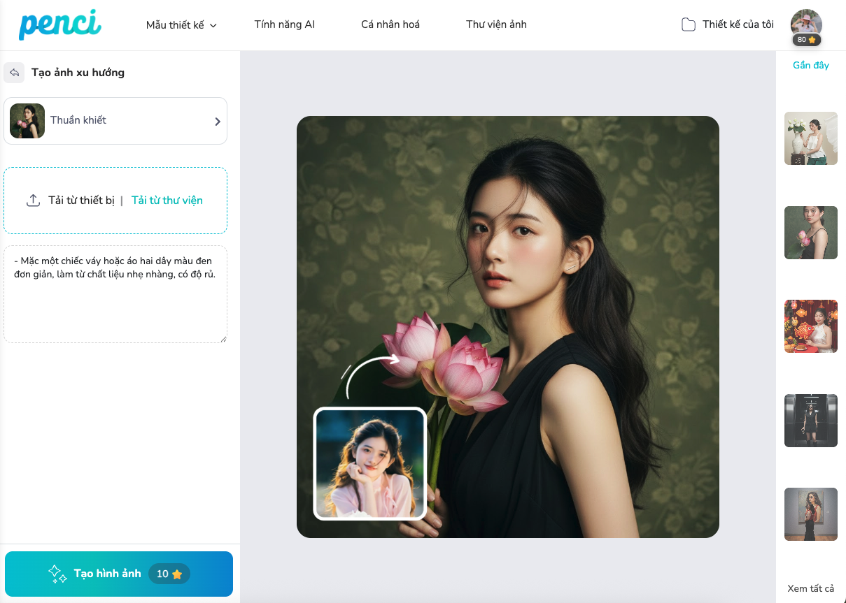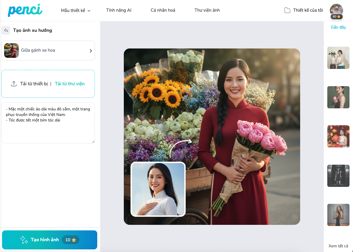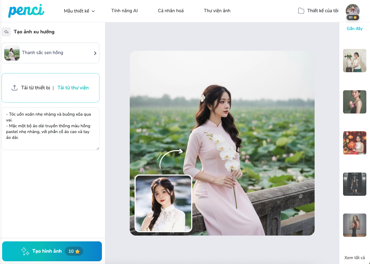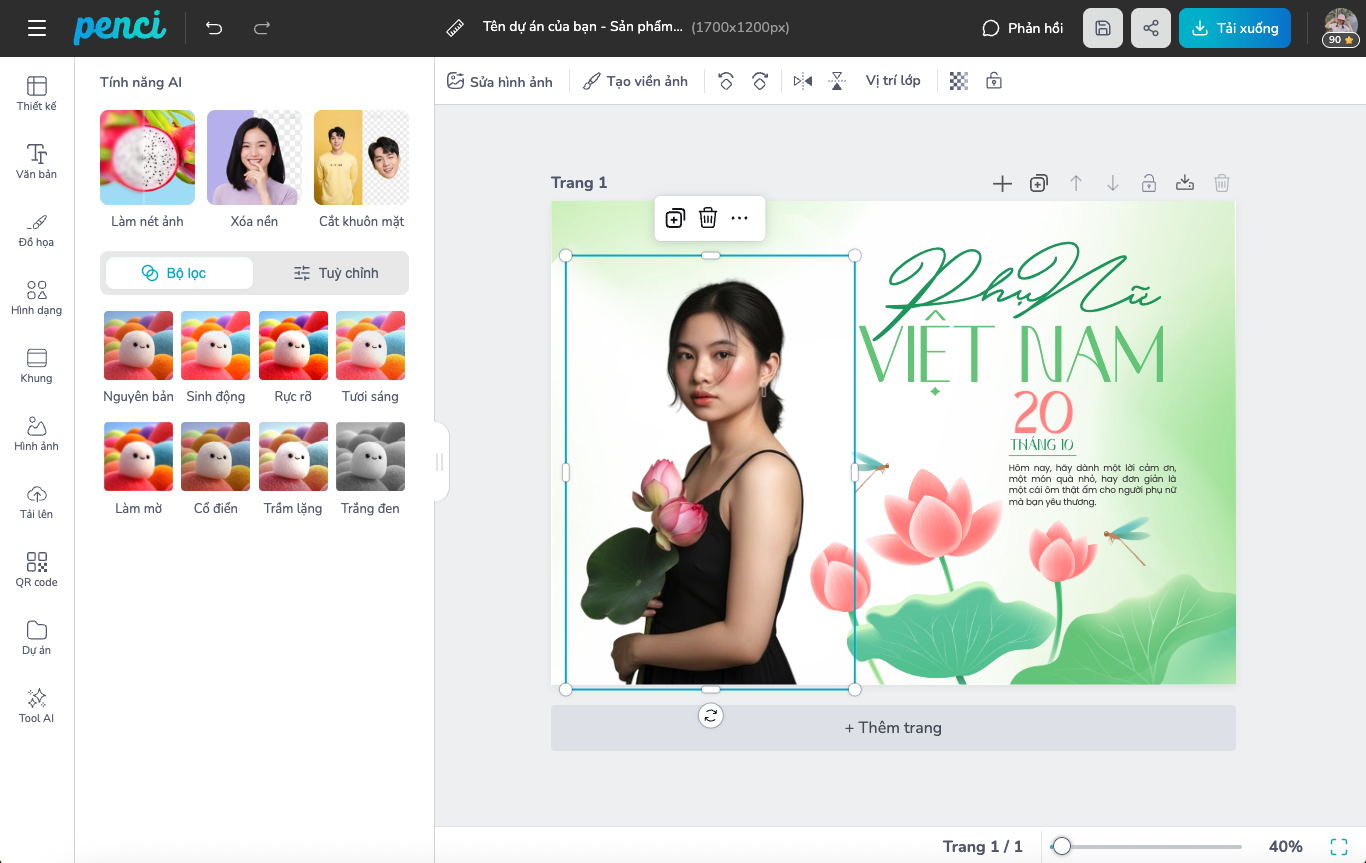 thieke thuvien Cách tạo hình ảnh, thiệp chúc mừng 20/10 chúc mừng đẹp, ý nghĩa nhất từ hình cá nhân bằng Penci AI By admin | 09 tháng 10 năm 2025 74 đã đọc Ngày Phụ nữ Việt Nam 20/10 luôn là dịp để gửi gắm yêu thương đến những người phụ nữ quanh ta từ mẹ, bà, chị đến bạn bè hay đồng nghiệp. Một lời chúc ý nghĩa luôn mang lại niềm vui, nhưng một hình ảnh được tạo riêng từ chính khuôn mặt của người nhận lại có sức lay động gấp nhiều lần. Nó không chỉ là tấm hình, mà là món quà tinh thần được cá nhân hoá vừa thân thuộc, vừa mới lạ, vừa chứa đựng cảm xúc thật. Nếu trước đây việc tạo ra những hình ảnh như vậy phải nhờ designer hoặc sử dụng công cụ AI phức tạp, thì nay bạn chỉ cần vài thao tác đơn giản trên Penci.vn - công cụ thiết kế của người Việt, thân thiện và dễ dùng. Tất cả quá trình, từ tạo ảnh đến thiết kế thiệp, đều diễn ra trên một nền tảng duy nhất, bằng tiếng Việt, và hoàn toàn miễn phí. Hãy cùng tìm hiểu chi tiết cách tạo hình ảnh 20/10 chúc mừng đẹp, ý nghĩa nhất từ hình cá nhân bằng Penci AI ngay dưới đây nhé. 1. Tạo hình ảnh 20/10 chúc mừng từ hình cá nhân bằng Penci AI 1.1 Truy cập vào Penci AI và chọn phong cách tạo ảnh Trước hết, bạn truy cập danh mục “Tính năng AI” của Penci. Đây chính là nơi bạn có thể biến ảnh thật của mình hoặc của người thân thành những khung hình nghệ thuật theo phong cách 20/10. Điểm khác biệt khi tạo hình ảnh 20/10 tại Penci AI là mọi concept tạo ảnh đều được Việt hoá từ bối cảnh, ánh sáng, đến màu sắc và cảm xúc. Khi chọn “phong cách tạo ảnh cho phụ nữ”, bạn sẽ thấy nhiều concept đã được cài sẵn câu lệnh (prompt) rất gợi cảm xúc, chẳng hạn như “Giữa cánh sen hoa”, “Thanh sắc sen hồng”, “Sắc hồng”, hay “Thuần khiết”. Đây đều là những bối cảnh được AI dựng nên với độ chi tiết cao, tôn lên vẻ đẹp của người phụ nữ Việt theo cách tinh tế và tự nhiên nhất. Truy cập vào giao diện Penci AI Chọn phong cách tạo ảnh AI cho phụ nữ [Xem thêm nhiều phong cách tạo hình ảnh 20/10 chúc mừng ngày Phụ nữ Việt Nam] 1.2 Tiến hành xử lý hình ảnh với AI Sau khi chọn được phong cách mong muốn, bạn chỉ cần tải lên một bức ảnh chân dung cá nhân của mình hoặc người nhận. Ảnh có thể là ảnh chụp bình thường bằng điện thoại, miễn là khuôn mặt rõ và đủ sáng. Hệ thống AI sẽ tự động nhận diện, giữ nguyên khuôn mặt thật và hoà vào khung cảnh concept mà bạn chọn. Nếu muốn đổi trang phục, bạn có thể nhập mô tả ngắn gọn vào ô “mô tả trang phục” ngay bên dưới. Ví dụ: “mặc áo dài đỏ truyền thống”, “mặc váy trắng cầm bó hoa hồng”, hay “mặc áo dài tím, đeo vòng ngọc trai”. Bạn không cần viết dài hay cầu kỳ vì Penci AI đã được tối ưu để hiểu ngôn ngữ tiếng Việt tự nhiên, nên chỉ vài từ là đủ. Tải ảnh lên và nhập mô tả bằng tiếng Việt để thay đổi trang phục nếu muốn 1.3 Bắt đầu tạo ảnh và nhận kết quả Sau khi hoàn tất, nhấn nút “Tạo ảnh” và chờ vài giây. Lúc này, AI sẽ xử lý và hiển thị kết quả. Điều thú vị là mỗi lần tạo, bạn sẽ nhận được vài phiên bản khác nhau, từ đó chọn tấm ưng ý nhất. Ảnh sau khi tạo có thể tải về ngay, hoặc chuyển tiếp sang chế độ “Tạo thiết kế mới từ ảnh” để biến nó thành hình ảnh hay thiệp chúc mừng hoàn chỉnh. Tạo ảnh và nhận kết quả trong vài giây [Xem thêm nhiều phong cách tạo hình ảnh 20/10 chúc mừng ngày Phụ nữ Việt Nam] 2. Cách tạo hình ảnh, thiệp chúc mừng 20/10 đẹp, ý nghĩa từ ảnh cá nhân bằng Penci AI 2.1 Đưa ảnh vào giao diện thiết kế trực quan của Penci Khi chọn "Tạo thiết kế mới từ ảnh" bảng tuỳ chỉnh kích thước thiết kế sẽ hiện ra cho bạn chọn lựa. Tại đây, bạn có thể chọn lại kích thước hiển thị sao cho phù hợp với mục đích sử dụng. Nếu muốn làm thiệp in giấy, kích thước A5 hoặc A6 là lựa chọn lý tưởng. Còn nếu bạn định đăng lên mạng xã hội, hãy chọn tỉ lệ vuông (1:1) cho bài đăng, hoặc dọc (4:5, 9:16) cho story và reel. Tuỳ chọn thông số kích thước thiết kế Khi đã có kích thước mong muốn, giờ là lúc biến nó thành thiệp chúc mừng xinh xắn, tinh tế. Ngay khi bấm nút “Bắt đầu thiết kế”, hệ thống sẽ mở trình thiết kế Penci, đây là nơi bạn có thể sáng tạo không giới hạn mà không cần biết gì về Photoshop hay Canva. Ảnh được đưa vào trình thiết kế online miễn phí Penci 2.2 Tùy chỉnh thiết kế theo ý thích Tại giao diện thiết kế, bạn có thể trang trí hình ảnh, thiệp bằng những chi tiết nhỏ xinh trong thư viện của Penci. Thanh công cụ bên trái cho phép thêm họa tiết hoa, trái tim, nơ, khung viền hay bất kỳ yếu tố nào bạn thích. Bên cạnh đó, bạn cũng có thể thêm văn bản lời chúc, chẳng hạn “Chúc mừng ngày Phụ nữ Việt Nam 20/10”, “Dành tặng người phụ nữ tuyệt vời nhất”, hay “Cảm ơn mẹ vì đã luô