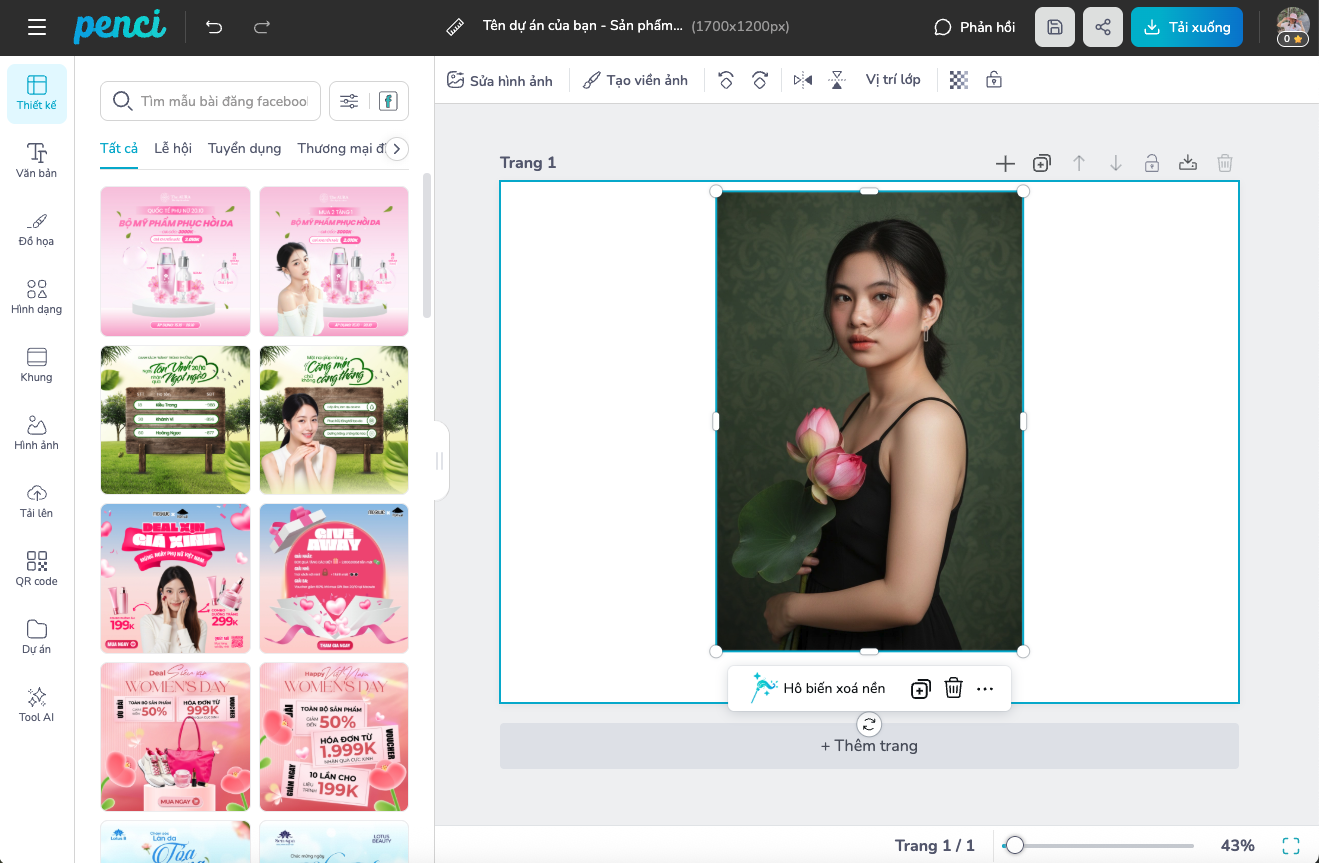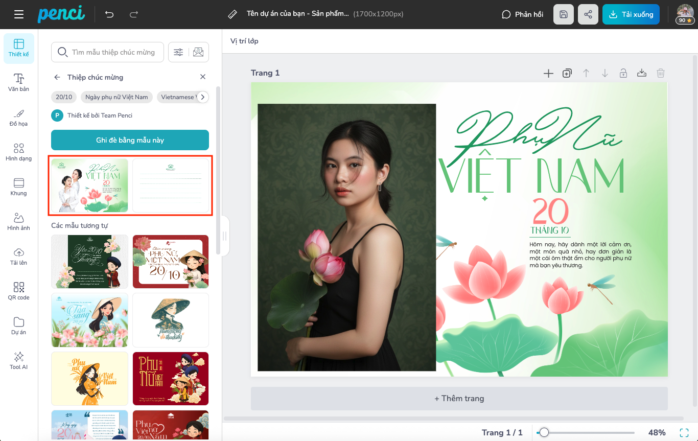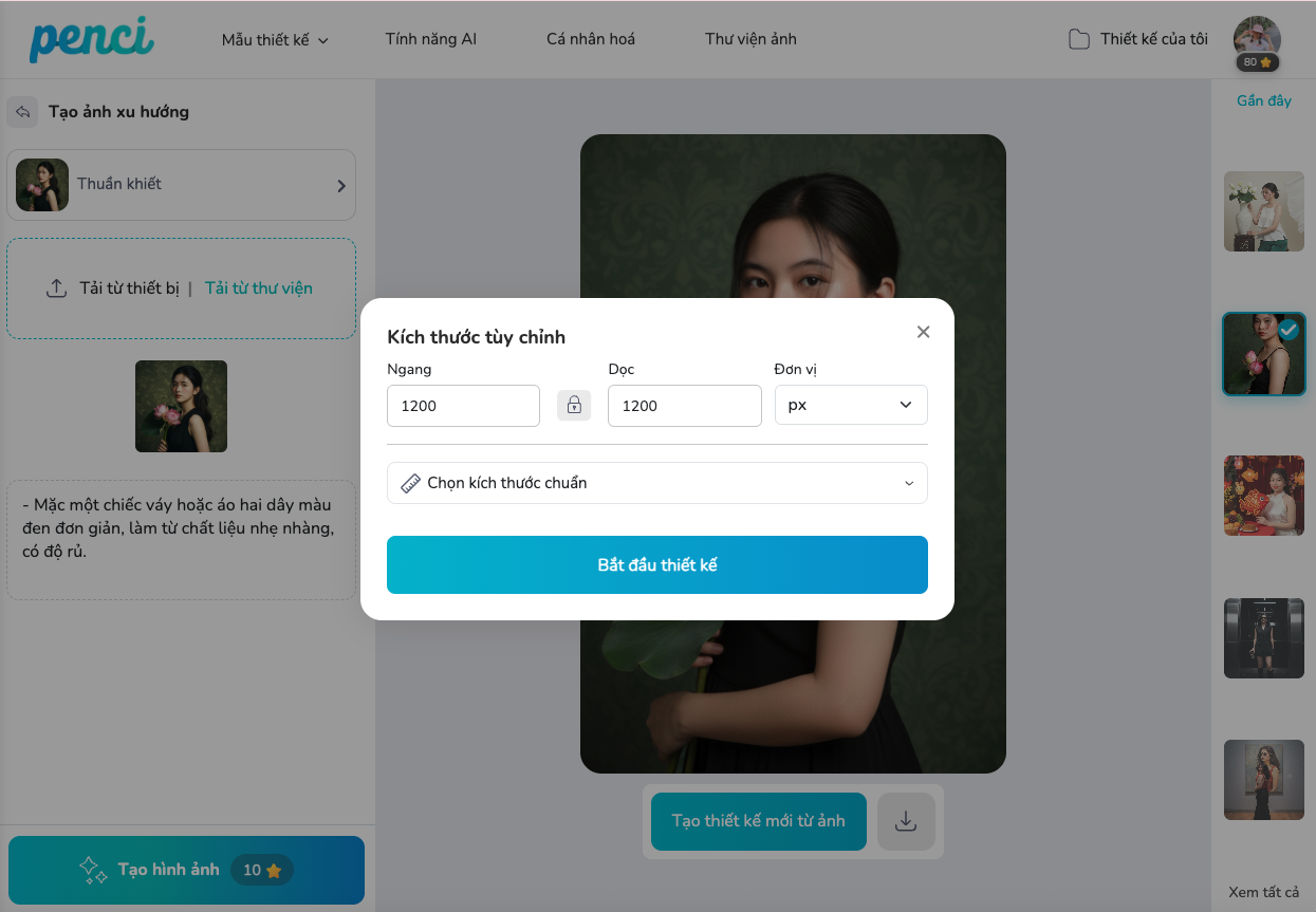 thieke thuvien Cách tạo hình ảnh, thiệp chúc mừng 20/10 chúc mừng đẹp, ý nghĩa nhất từ hình cá nhân bằng Penci AI By admin | 09 tháng 10 năm 2025 74 đã đọc Ngày Phụ nữ Việt Nam 20/10 luôn là dịp để gửi gắm yêu thương đến những người phụ nữ quanh ta từ mẹ, bà, chị đến bạn bè hay đồng nghiệp. Một lời chúc ý nghĩa luôn mang lại niềm vui, nhưng một hình ảnh được tạo riêng từ chính khuôn mặt của người nhận lại có sức lay động gấp nhiều lần. Nó không chỉ là tấm hình, mà là món quà tinh thần được cá nhân hoá vừa thân thuộc, vừa mới lạ, vừa chứa đựng cảm xúc thật. Nếu trước đây việc tạo ra những hình ảnh như vậy phải nhờ designer hoặc sử dụng công cụ AI phức tạp, thì nay bạn chỉ cần vài thao tác đơn giản trên Penci.vn - công cụ thiết kế của người Việt, thân thiện và dễ dùng. Tất cả quá trình, từ tạo ảnh đến thiết kế thiệp, đều diễn ra trên một nền tảng duy nhất, bằng tiếng Việt, và hoàn toàn miễn phí. Hãy cùng tìm hiểu chi tiết cách tạo hình ảnh 20/10 chúc mừng đẹp, ý nghĩa nhất từ hình cá nhân bằng Penci AI ngay dưới đây nhé. 1. Tạo hình ảnh 20/10 chúc mừng từ hình cá nhân bằng Penci AI 1.1 Truy cập vào Penci AI và chọn phong cách tạo ảnh Trước hết, bạn truy cập danh mục “Tính năng AI” của Penci. Đây chính là nơi bạn có thể biến ảnh thật của mình hoặc của người thân thành những khung hình nghệ thuật theo phong cách 20/10. Điểm khác biệt khi tạo hình ảnh 20/10 tại Penci AI là mọi concept tạo ảnh đều được Việt hoá từ bối cảnh, ánh sáng, đến màu sắc và cảm xúc. Khi chọn “phong cách tạo ảnh cho phụ nữ”, bạn sẽ thấy nhiều concept đã được cài sẵn câu lệnh (prompt) rất gợi cảm xúc, chẳng hạn như “Giữa cánh sen hoa”, “Thanh sắc sen hồng”, “Sắc hồng”, hay “Thuần khiết”. Đây đều là những bối cảnh được AI dựng nên với độ chi tiết cao, tôn lên vẻ đẹp của người phụ nữ Việt theo cách tinh tế và tự nhiên nhất. Truy cập vào giao diện Penci AI Chọn phong cách tạo ảnh AI cho phụ nữ [Xem thêm nhiều phong cách tạo hình ảnh 20/10 chúc mừng ngày Phụ nữ Việt Nam] 1.2 Tiến hành xử lý hình ảnh với AI Sau khi chọn được phong cách mong muốn, bạn chỉ cần tải lên một bức ảnh chân dung cá nhân của mình hoặc người nhận. Ảnh có thể là ảnh chụp bình thường bằng điện thoại, miễn là khuôn mặt rõ và đủ sáng. Hệ thống AI sẽ tự động nhận diện, giữ nguyên khuôn mặt thật và hoà vào khung cảnh concept mà bạn chọn. Nếu muốn đổi trang phục, bạn có thể nhập mô tả ngắn gọn vào ô “mô tả trang phục” ngay bên dưới. Ví dụ: “mặc áo dài đỏ truyền thống”, “mặc váy trắng cầm bó hoa hồng”, hay “mặc áo dài tím, đeo vòng ngọc trai”. Bạn không cần viết dài hay cầu kỳ vì Penci AI đã được tối ưu để hiểu ngôn ngữ tiếng Việt tự nhiên, nên chỉ vài từ là đủ. Tải ảnh lên và nhập mô tả bằng tiếng Việt để thay đổi trang phục nếu muốn 1.3 Bắt đầu tạo ảnh và nhận kết quả Sau khi hoàn tất, nhấn nút “Tạo ảnh” và chờ vài giây. Lúc này, AI sẽ xử lý và hiển thị kết quả. Điều thú vị là mỗi lần tạo, bạn sẽ nhận được vài phiên bản khác nhau, từ đó chọn tấm ưng ý nhất. Ảnh sau khi tạo có thể tải về ngay, hoặc chuyển tiếp sang chế độ “Tạo thiết kế mới từ ảnh” để biến nó thành hình ảnh hay thiệp chúc mừng hoàn chỉnh. Tạo ảnh và nhận kết quả trong vài giây [Xem thêm nhiều phong cách tạo hình ảnh 20/10 chúc mừng ngày Phụ nữ Việt Nam] 2. Cách tạo hình ảnh, thiệp chúc mừng 20/10 đẹp, ý nghĩa từ ảnh cá nhân bằng Penci AI 2.1 Đưa ảnh vào giao diện thiết kế trực quan của Penci Khi chọn "Tạo thiết kế mới từ ảnh" bảng tuỳ chỉnh kích thước thiết kế sẽ hiện ra cho bạn chọn lựa. Tại đây, bạn có thể chọn lại kích thước hiển thị sao cho phù hợp với mục đích sử dụng. Nếu muốn làm thiệp in giấy, kích thước A5 hoặc A6 là lựa chọn lý tưởng. Còn nếu bạn định đăng lên mạng xã hội, hãy chọn tỉ lệ vuông (1:1) cho bài đăng, hoặc dọc (4:5, 9:16) cho story và reel. Tuỳ chọn thông số kích thước thiết kế Khi đã có kích thước mong muốn, giờ là lúc biến nó thành thiệp chúc mừng xinh xắn, tinh tế. Ngay khi bấm nút “Bắt đầu thiết kế”, hệ thống sẽ mở trình thiết kế Penci, đây là nơi bạn có thể sáng tạo không giới hạn mà không cần biết gì về Photoshop hay Canva. Ảnh được đưa vào trình thiết kế online miễn phí Penci 2.2 Tùy chỉnh thiết kế theo ý thích Tại giao diện thiết kế, bạn có thể trang trí hình ảnh, thiệp bằng những chi tiết nhỏ xinh trong thư viện của Penci. Thanh công cụ bên trái cho phép thêm họa tiết hoa, trái tim, nơ, khung viền hay bất kỳ yếu tố nào bạn thích. Bên cạnh đó, bạn cũng có thể thêm văn bản lời chúc, chẳng hạn “Chúc mừng ngày Phụ nữ Việt Nam 20/10”, “Dành tặng người phụ nữ tuyệt vời nhất”, hay “Cảm ơn mẹ vì đã luô