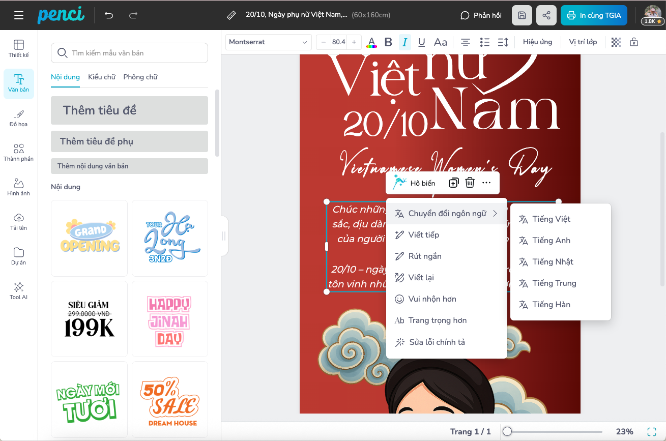 thieke thuvien Gợi ý mẫu Standee, cờ phướn ngày Phụ nữ 20/10 đẹp, miễn phí dành cho nhà bán hàng By admin | 15 tháng 10 năm 2025 6 đã đọc Ngày Phụ nữ Việt Nam 20/10 là thời điểm vàng để các nhà bán hàng, cửa tiệm hay doanh nghiệp nhỏ tạo chiến dịch tri ân và thu hút khách hàng nữ. Và trong số những công cụ truyền thông hiệu quả nhất, standee 20/10 và cờ phướn ngày phụ nữ luôn chiếm vị trí hàng đầu. Dù là cửa hàng thời trang, tiệm café, spa, nhà hàng hay showroom sản phẩm, một thiết kế standee hoặc cờ phướn đẹp sẽ biến không gian trở nên sinh động, tạo ấn tượng và truyền tải thông điệp tri ân đến khách hàng. Trên nền tảng Penci.vn - công cụ thiết kế online miễn phí của người Việt, bạn có thể tự tay tạo ra thiết kế standee, cờ phướn 20/10 miễn phí chỉ trong vài phút. Không cần kỹ năng thiết kế, không phải tải phần mềm, chỉ cần chọn mẫu, tùy chỉnh nội dung, thêm logo hoặc hình ảnh và đặt in trực tiếp. Sử dụng mẫu này 1. Vì sao nhà bán hàng cần chuẩn bị standee, cờ phướn cho ngày Phụ nữ Việt Nam 20/10 Nếu như những ngày lễ khác thường tập trung vào quảng bá khuyến mãi hoặc ra mắt sản phẩm mới, thì ngày 20/10 lại là cơ hội đặc biệt để thương hiệu thể hiện sự trân trọng với khách hàng nữ, đây là nhóm chiếm tỷ lệ lớn trong mọi lĩnh vực tiêu dùng. Một standee hoặc cờ phướn được thiết kế đẹp mắt, thông điệp rõ ràng không chỉ là công cụ trang trí, mà còn là “người đại diện thầm lặng” cho thương hiệu. Nó giúp: Tạo không khí lễ hội, thu hút sự chú ý: Không gian trưng bày có standee, cờ phướn sẽ nổi bật hơn hẳn, dễ khiến khách hàng dừng chân và ghé xem. Tăng độ nhận diện thương hiệu: Logo, slogan, màu sắc đặc trưng của cửa hàng được lặp lại trên ấn phẩm giúp khách hàng ghi nhớ lâu hơn. Truyền tải thông điệp tri ân: Một câu chúc đơn giản nhưng được trình bày tinh tế có thể khiến khách hàng cảm nhận được sự chân thành từ thương hiệu. Kết hợp quảng bá khuyến mãi: Thêm thông tin về ưu đãi hoặc mini game 20/10 ngay trên standee, cờ phướn giúp chiến dịch bán hàng trở nên hiệu quả hơn. Vì vậy, đầu tư cho ấn phẩm truyền thông như standee và cờ phướn 20/10 không chỉ là “làm cho đẹp”, mà là chiến lược giúp bạn chạm đến cảm xúc khách hàng và tăng doanh thu dịp lễ. 2. Mẫu thiết kế Standee 20/10 đẹp giúp thu hút khách hàng Một thiết kế standee 20/10 đẹp không chỉ cần bắt mắt, mà còn phải hài hòa giữa thông điệp, bố cục và màu sắc thương hiệu. Bộ sưu tập mẫu standee trên Penci.vn được đội ngũ họa sĩ Việt sáng tạo theo xu hướng hiện đại: sử dụng gam hồng phấn, pastel, be nhẹ hoặc đỏ đô sang trọng,... những tông màu đại diện cho sự dịu dàng nhưng đầy sức mạnh của người phụ nữ Việt. Các mẫu standee 20/10 được chia thành nhiều phong cách: sang trọng cho spa, mỹ phẩm; tươi trẻ cho cửa hàng quà tặng; chuyên nghiệp cho doanh nghiệp hoặc showroom. Tất cả đều có thể tùy chỉnh nội dung, thêm logo, hình ảnh hoặc QR code liên kết đến fanpage hay website của bạn. Dưới đây là một số mẫu nổi bật trên Penci, tất cả đều có thể sử dụng và tùy chỉnh miễn phí: Sử dụng mẫu này Sử dụng mẫu này Sử dụng mẫu này Sử dụng mẫu này Sử dụng mẫu này Sử dụng mẫu này Xem thêm: Thư viện Mẫu thiết kế Standee 20/10 đẹp, miễn phí 3. Mẫu thiết kế cờ phướn 20/10 ấn tượng, độc đáo Cờ phướn (loại cờ hình chữ nhật, thường được treo dọc trên các cột, cây, hoặc tường) là lựa chọn hoàn hảo để tăng độ phủ thương hiệu và lan tỏa không khí 20/10 tại khu vực cửa hàng, trung tâm thương mại hay mặt tiền đường. Một mẫu cờ phướn ấn tượng có thể khiến người đi đường dừng lại vài giây đủ để đọc thông điệp hoặc ghi nhớ hình ảnh thương hiệu. Penci cung cấp nhiều mẫu Cờ phướn 20/10 với kích thước chuẩn in 0.6x2.2m và có sẵn layout thiết kế theo hướng dọc với hình dáng cánh buồm, chữ nhật hoặc giọt nước. Bạn có thể chọn mẫu phù hợp với phong cách thương hiệu, thay đổi hình ảnh nhân vật, câu chúc, hoặc chèn chương trình khuyến mãi trực tiếp. Penci gợi ý bạn tùy chỉnh một số mẫu dưới đây: Sử dụng mẫu này Sử dụng mẫu này Sử dụng mẫu này Sử dụng mẫu này Sử dụng mẫu này Xem thêm: Thư viện mẫu thiết kế cờ phướn 20/10 ấn tượng, độc đáo 4. Thiết kế Standee, Cờ phướn trực tuyến trên Penci miễn phí và dễ dàng Không cần phải thuê thiết kế ngoài hay chờ đợi file in, Penci.vn cho phép bạn tự thiết kế standee, cờ phướn online chỉ trong vài phút và hoàn toàn miễn phí. Giao diện kéo thả trực quan giúp bất kỳ ai cũng có thể sử dụng, dù không biết Photoshop hay Illustrator. Khi truy cập Penci.vn, bạn chỉ cần: Chọn danh mục “Standee” hoặc “Cờ phướn” trong thư viện ấn phẩm. Lựa chọn mẫu yêu thích từ hàng trăm thiết kế sẵn. Tùy chỉnh nội dung và màu sắc theo thươ