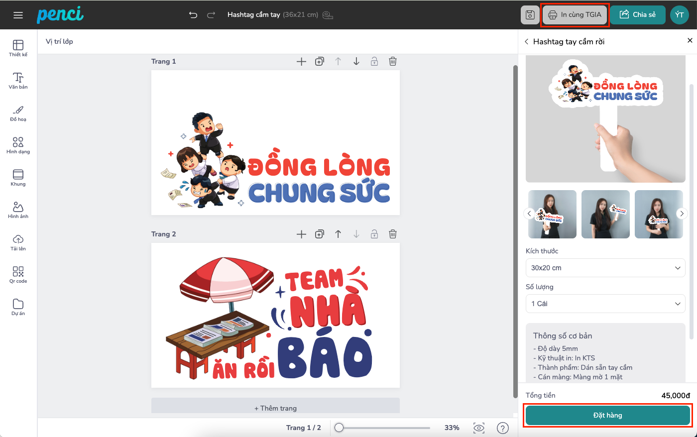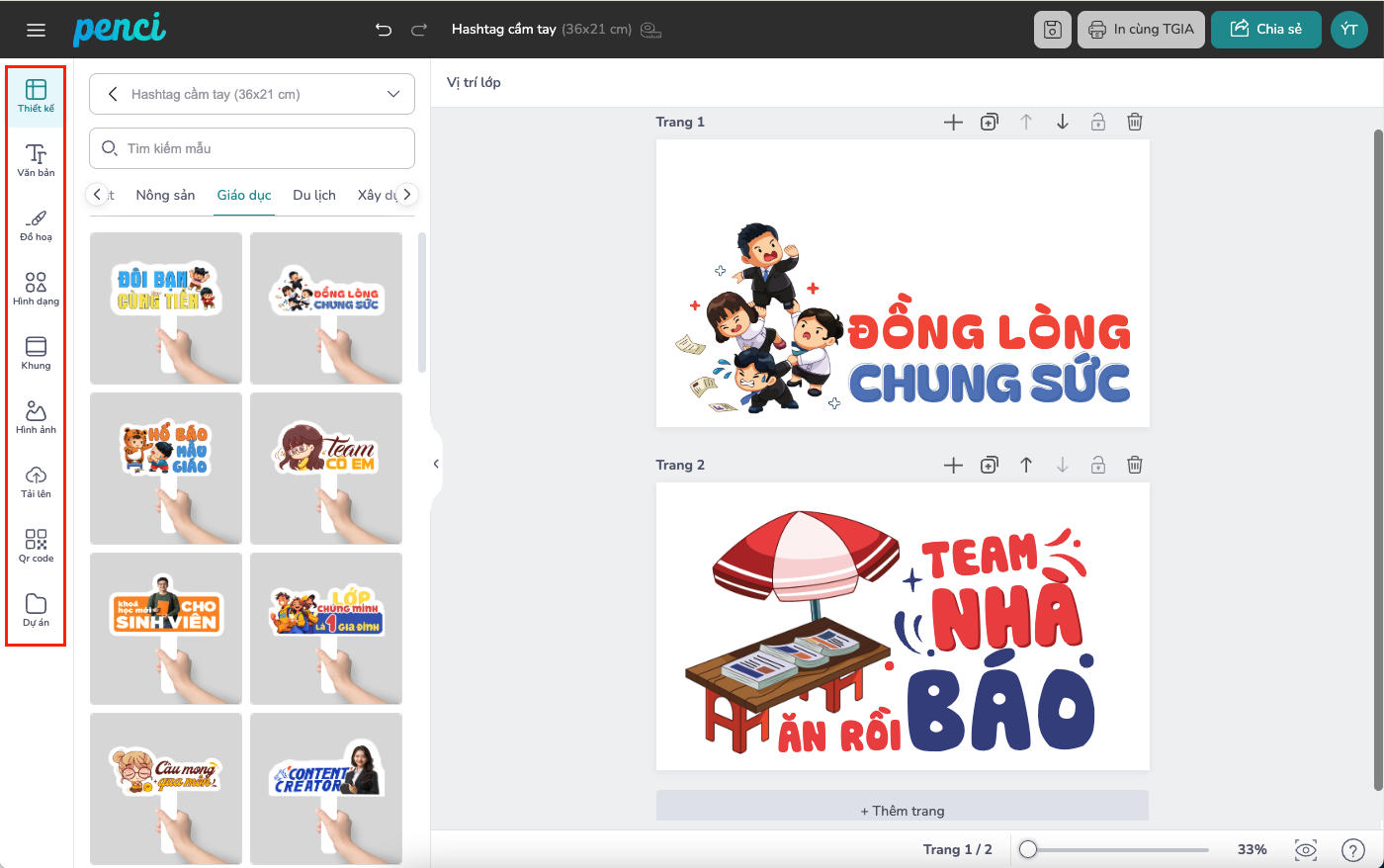 thieke thuvien Hướng dẫn tự thiết kế hashtag cầm tay nhanh chóng bằng Penci By admin | 25 tháng 04 năm 2025 312 đã đọc 1. Tự thiết kế Hashtag Cầm Tay có dễ không? - Tự thiết kế giúp tăng tính cá nhân hóa Khi tự tay thiết kế, bạn có thể toàn quyền sáng tạo để tạo ra ấn phẩm phù hợp và hoàn hảo với thông điệp lẫn phong cách của sự kiện. Với Penci, bạn có thể tùy chỉnh mọi chi tiết, từ nội dung chữ, hình ảnh, đến cả màu sắc chỉ bằng thao tác kéo thả, đảm bảo Hashtag của bạn luôn nổi bật và đặc biệt hơn. - Tự thiết kế giúp tiết kiệm thời gian và chi phí Thay vì thuê designer chuyên nghiệp hoặc nhờ đến các dịch vụ thiết kế - in ấn phức tạp, bạn chỉ cần 3 phút để hoàn thành thiết kế Hashtag Cầm Tay trên Penci. Với gần 100.000 mẫu có sẵn, bạn sẽ tiết kiệm đáng kể thời gian lẫn chi phí, đồng thời vẫn đảm bảo sản phẩm đạt chuẩn chất lượng bạn mong muốn đó. - Tự thiết kế tạo trải nghiệm sáng tạo và độc đáo Quá trình tự thiết kế là cơ hội tuyệt vời để bạn thử sức sáng tạo với những ý tưởng độc đáo của riêng mình. Với giao diện thân thiện cùng với các mẫu thiết kế đậm chất Việt sẽ khiến “tác phẩm” của bạn trở nên thú vị hơn bao giờ hết. (Tham khảo các mẫu hashtag đẹp cho ngày cưới) Khám phá ngay: Đặc điểm của Hashtag cầm tay 2. Một số mẹo để thiết kế Hashtag Cầm Tay đẹp và chuyên nghiệp Trước khi bắt đầu thiết kế hashtag cầm tay, bạn cần chọn từ khóa hoặc cụm từ phù hợp với chủ đề sự kiện và chuẩn bị hình ảnh, logo để tăng tính nhận diện. Một số mẹo để thiết kế Hashtag Cầm Tay: - Sử dụng từ khóa ngắn gọn, dễ nhớ: Các từ khóa trên Hashtag cần được nổi bật và dễ đọc như #TeamBáo2025, #Quẩyhếtmình giúp thông điệp dễ dàng được truyền tải nhanh chóng và dễ thu hút người xem hơn. - Tận dụng màu sắc: Có thể chọn các màu sắc tương phản giữa nền và chữ để Hashtag của bạn có sức hút rõ nét, đặc biệt khi được kèm theo trong các bức ảnh sự kiện. - Thêm yếu tố đồ họa sáng tạo: Các icon, hình minh họa hoặc sticker sẽ khiến Hashtag lẫn người cầm tay thêm phần thú vị và tỏa sáng. 3. Hướng dẫn tự thiết kế Hashtag Cầm Tay bằng Penci Bước 1: Đăng ký hoặc đăng nhập tài khoản Penci - Truy cập vào website công cụ thiết kế miễn phí Penci: https://penci.vn/ - Nhấn vào nút “Đăng nhập” hoặc "Đăng ký" ở góc phải phía trên. - Điền thông tin cần thiết (như email và mật khẩu để đăng nhập thông qua Google; hoặc bạn có thể đăng nhập qua Zalo với mã QR vô cùng tiện lợi). - Sau đó, bạn chọn "Tạo thiết kế" và bắt đầu thôi (Truy cập vào công cụ thiết kế miễn phí online Penci) (Đăng nhập hoặc đăng ký Penci bằng tài khoản Google hoặc Zalo để các dự án được lưu trữ) Bước 2: Tìm kiếm sản phẩm cần thiết kế, in ấn Tại thư viện mẫu thiết kế miễn phí online của Penci bạn có 2 cách để tìm kiếm sản phẩm cần in ấn: - Bạn chọn "Hashtag" trong phần "Danh mục". - Gõ tên sản phẩm "Hashtag" vào ô tìm kiếm. (Chọn danh mục sản phẩm bạn cần in ấn để sử dụng thư viện mẫu miễn phí) Bước 3: Sử dụng thư viện mẫu thiết kế Hashtag cầm tay có sẵn của Penci Tại đây, bạn hoàn toàn có thể lựa chọn và sử dụng miễn phí các mẫu Hashtag mà bạn thích. Sau đó, chọn bạn chọn mẫu và “Sử dụng mẫu này”. Hoặc nếu bạn ưa thích sự sáng tạo, muốn cá nhân hoá sản phẩm theo trí tưởng tượng của mình, chọn "Tạo Hashtag cầm tay mới" (Chọn mẫu yêu thích để tùy chỉnh hoặc tự “Tạo hashtag cầm tay mới”) (Sử dụng và tùy chỉnh mẫu theo ý của bạn) Bước 4: Tự thiết kế theo ý thích Với giao diện kéo - thả thân thiện, bạn có thể dễ dàng thay đổi từng chi tiết chỉ bằng vài cú click chuột. - Thay đổi nội dung chữ, thêm từ khóa hay cả slogan nổi bật. - Tải logo hoặc ảnh mà bạn muốn có trên thiết kế lên. - Điều chỉnh màu sắc sao cho phù hợp với phong cách và màu chủ đạo của sự kiện. (Giao diện thiết kế hashtag trực quan) Bước 5: Kiểm tra và tải xuống hoặc đặt in thiết kế ngay Nhấn nút "Chia sẻ", chọn “Sao chép liên kết” để gửi cho bạn bè hoặc đồng nghiệp cùng sửa hoặc tạo thêm thiết kế. Bạn chưa cần in ngay, bạn có thể nhấn "Lưu lại thiết kế" để lần sau tiếp tục chỉnh sửa hoặc đặt in. Nếu muốn in ngay, hãy nhấn “In cùng TGIA”. Với giao diện thông minh của Penci sẽ giúp bạn xem demo thành phẩm trước khi đặt in. Sau đó, kiểm tra các thông số in và số lượng cần thiết xong, bạn chọn "đặt hàng nhé. Chỉ cần trong 1 ngày, bạn sẽ có ngay Hashtag Cầm Tay ưng ý. (Có thể xem trước demo thành phẩm trước khi in) Với sự hỗ trợ đắc lực từ “công cụ” Penci, việc tự thiết kế Hashtag Cầm Tay dành riêng cho bạn sẽ trở nên đơn giản và tiện lợi hơn. Chỉ trong vòng 2 phút, chính bạn có thể tạo ra sản phẩm độc đáo và thuần Việt từ những mẫu đầy sáng tạo. H