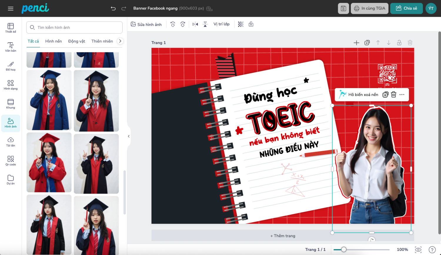 thieke thuvien Hướng dẫn tự thiết kế mẫu banner Facebook chỉ trong vài phút với Penci By admin | 02 tháng 05 năm 2025 361 đã đọc 1. Tự thiết kế banner đăng Facebook có nhanh và dễ dàng không? Hoàn toàn có thể khi bạn sử dụng Penci - công cụ thiết kế online miễn phí, với kho đồ hoạ thuần Việt, dành riêng cho người Việt. Không cần biết Photoshop bạn vẫn có thể tạo ra những mẫu banner Facebook đẹp mắt chỉ sau vài phút thao tác. (Banner Facebook ngang với chủ đề Giáo dục được tạo ra từ Penci) Thư viện mẫu banner Facebook phong phú, chuẩn kích thước ngang hoặc vuông: Penci cung cấp hàng trăm thiết kế có sẵn với tỷ lệ hiển thị đúng chuẩn Facebook. Các banner với nhiều chủ đề cho sự kiện, khai trương, giảm giá đến tuyển dụng, sinh nhật,... Font chữ Việt hóa không lỗi dấu: Toàn bộ font trong thư viện đều đã được Việt hóa, đảm bảo thẩm mỹ và thuận tiện khi nhập nội dung có dấu tiếng Việt. Thiết kế dễ dàng, thao tác kéo thả trực quan: Bạn có thể tự tay chỉnh sửa chữ, thay đổi hình ảnh, đổi màu chỉ bằng vài cú nhấp chuột mà không cần kỹ năng thiết kế chuyên sâu. Thiết kế trực tiếp trên website Penci, không cần cài đặt: Dù bạn dùng laptop hay điện thoại, chỉ cần mở Penci là có thể bắt đầu thiết kế hoặc chỉnh sửa dự án đã lưu trước đó ngay. In ấn tiện lợi, tích hợp trong giao diện thiết kế: Sau khi hoàn tất banner, bạn có thể đặt in trực tiếp mà không cần tải file về hay đi tìm chỗ in riêng. 2. Các bước tự thiết kế banner Facebook với Penci Bước 1: Đăng nhập hoặc Đăng ký tài khoản Bạn cần Đăng nhập/đăng ký tài khoản để sử dụng các mẫu thiết kế và đồ hoạ miễn phí → Vào mục “Tạo thiết kế” → Chọn Banner Facebook tại thanh tìm kiếm hoặc “Danh mục”. (Đăng nhập vào Penci để sử dụng miễn phí kho thư viện mẫu) Gợi ý: Penci đã căn chỉnh sẵn kích thước cho mẫu Banner Facebook ngang (900 x 603 px) và mẫu Banner Facebook dọc (603 x 900 px) chuẩn, bạn không cần phải nhớ thông số và tự chỉnh tay. Bước 2: Chọn mẫu bạn thích Chọn từ hàng trăm mẫu thiết kế sẵn có trong thư viện. Từ dịp lễ Tết, khai trương, sale đến tuyển dụng, sự kiện. Bạn cũng có thể bắt đầu từ một mẫu trắng nếu thích tự sáng tạo. (Vô vàn mẫu thiết kế Banner Facebook ở thư viện) Gợi ý: Chọn mẫu theo tone màu hoặc phong cách thương hiệu của bạn (sắc màu, chuyên nghiệp, vintage,...) Bước 3: Chỉnh sửa nội dung, thêm hiệu ứng cực dễ Nhấp vào khối văn bản để đổi chữ, font, màu sắc Thêm sticker, khung, biểu tượng từ thư viện đồ họa phong phú đậm chất Việt. Kéo thả để di chuyển, thay đổi kích cỡ, xoay mọi thứ dễ dàng. (Sử dụng tính năng soạn nội dung bằng AI để Penci gợi ý câu slogan hoặc tiêu đề cho banner của bạn) Bước 4: Tùy chỉnh hình ảnh với công cụ AI xoá nền Xóa nền ảnh chỉ với 1 cú nhấp chuột để làm nổi bật sản phẩm hoặc nhân vật chính. Nhấp vào hình ảnh để thay ảnh của bạn hoặc chọn ảnh từ thư viện ảnh Việt Nam của Penci. (“Hô biến xoá nền” để tách đối tượng chính trong hình ảnh) Bước 5: Tải về để sử dụng Hoàn tất thiết kế, bạn nhấn “Tải xuống” và bắt đầu tuỳ chọn: Chọn số trang để tải về hoặc có thể tải về tất cả các trang Chọn định dạng ảnh PNG/JPG chất lượng cao hoặc là định dạng file PDF chế độ xem Sau đó “Tải xuống”. Hoặc bạn có thể “Lưu lại thiết kế” để sau tái sử dụng, chỉnh sửa hoặc đặt in nhé. (Tải xuống mẫu thiết kế Banner để đăng Facebook) Với Penci, bạn không chỉ tiết kiệm thời gian mà còn không cần phần mềm phức tạp, không cần kỹ năng thiết kế, chỉ cần vài phút, bạn đã có banner cực xịn để đăng lên Facebook. Nếu bạn cần thêm hướng dẫn hoặc muốn tìm hiểu cách dùng các tính năng AI trong Penci để tạo ảnh, soạn nội dung, thì hãy theo dõi chúng mình để nhận thêm mẹo thiết kế nhé! Penci - Công cụ thiết kế của người Việt, dành cho người Việt Đã sao chép