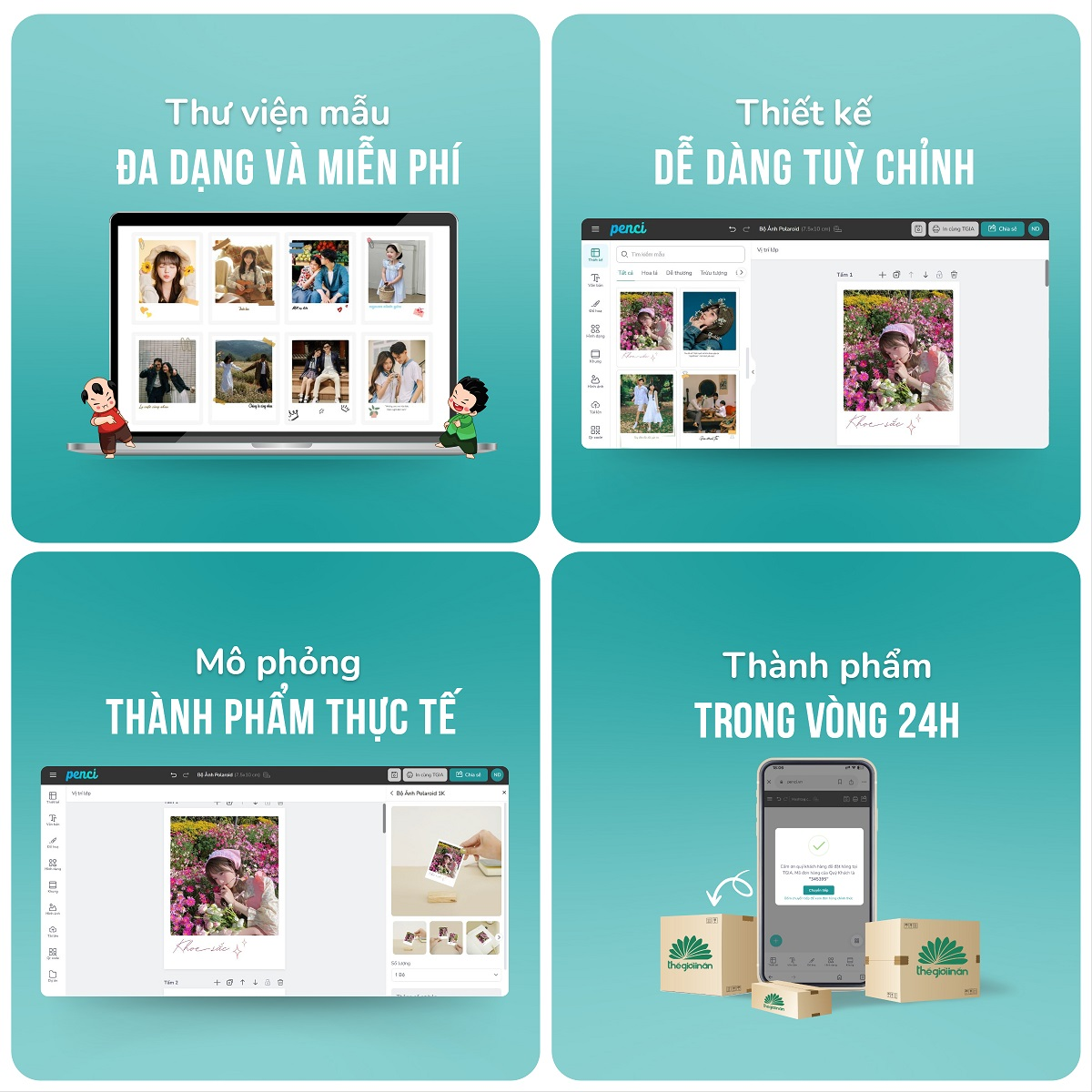 thieke thuvien In ảnh theo yêu cầu, in ảnh làm quà tặng: Tự thiết kế & in ảnh đẹp, rõ nét, giao tận nhà toàn quốc tại Penci By admin | 22 tháng 10 năm 2025 28 đã đọc In ảnh theo yêu cầu với nhiều kích thước, hình ảnh sắc nét và bền màu cho mọi dịp từ cưới hỏi, sinh nhật đến kỷ niệm gia đình, công ty cực kỳ nhanh chóng và đơn giản. Với dịch vụ in ảnh theo yêu cầu tại Penci, bạn có thể tự thiết kế và đặt in ảnh online đẹp, in ảnh màu rõ nét nhận hàng tận nơi chỉ trong vài ngày. >> Tham khảo thêm gợi ý combo quà tặng cá nhân hóa và tự làm đơn giản tặng mẹ, vợ, người yêu cực kỳ đơn giản 1/ Top các loại ảnh in theo yêu cầu đẹp & được yêu thích nhất tại Penci In ảnh theo yêu cầu tại Penci cho phép bạn tự chọn hình, chỉnh sửa, thêm chữ hoặc sticker và in ảnh online sắc nét theo kích thước và phong cách riêng. Không cần đến tiệm in truyền thống, giờ đây bạn có thể in ảnh online trực tiếp tại penci.vn, thao tác nhanh, dễ tùy chỉnh và nhận hàng tận nơi chỉ sau vài ngày. Penci mang đến nhiều lựa chọn in ảnh phong phú giúp bạn in ảnh nhanh, in ảnh giá rẻ mà vẫn đảm bảo chất lượng rõ nét, bền màu phù hợp cho mọi nhu cầu In ảnh theo yêu cầu nhanh, đẹp và rõ nét tại penci.vn 1.1 In ảnh Polaroid Ảnh Polaroid là lựa chọn được giới trẻ yêu thích khi in ảnh làm quà tặng. Kiểu ảnh nhỏ gọn, có viền trắng cổ điển, cực phù hợp để làm scrapbook, trang trí bàn học hay nhà cửa. Bạn có thể tham khảo các mẫu frame ảnh polaroid đẹp, hot trend miễn phí tại Penci. Dù bạn thích phong cách Hàn Quốc, vintage hay tối giản, chỉ vài phút là có thể tự thiết kế và in bộ ảnh Polaroid cá nhân hóa theo yêu cầu đơn giản tại Penci với màu sắc chân thực, giấy dày đẹp và chất lượng in ảnh rõ nét >> In bộ ảnh polaroid chất lượng và cá nhân hóa theo ý thích tại đây Ảnh Polaroid nhỏ xinh in theo yêu cầu làm quà tặng 1.2 In ảnh Photobooth Xu hướng “chụp photobooth” đang phủ sóng khắp mạng xã hội. Và tại Penci, bạn có thể in ảnh theo yêu cầu ngay trên nền tảng online, tự thiết kế frame ảnh photobooth theo phong cách riêng chỉ với vài thao tác đơn giản hoặc tham khảo ngay các mẫu frame photobooth hot trend được đội ngũ Penci thiết kế riêng. Kiểu in ảnh màu này này rất được ưa chuộng để in ảnh làm quà tặng bạn bè, người yêu, hoặc lưu giữ những khoảnh khắc ngọt ngào trong các dịp sinh nhật, lễ kỷ niệm và chuyến đi đáng nhớ. >> In bộ ảnh photobooth hot trend với chi phí tiết kiệm ngay tại đây Ảnh Photobooth cá nhân hóa, phong cách trẻ trung 1.3 In ảnh Classic In ảnh Classic là kiểu ảnh tràn viền truyền thống được nhiều người yêu thích để lưu giữ trong album, khung ảnh hoặc sổ kỷ niệm. Đây là dạng ảnh rời, kích thước linh hoạt, được in trên giấy ảnh Sapphire cao cấp giúp bám mực tốt, bề mặt sáng bóng, mịn mượt cho chất lượng ảnh chuyên nghiệp. Tại Penci, bạn có thể in ảnh theo yêu cầu TPHCM và toàn quốc, tùy chọn số lượng từ vài tấm đến hàng trăm tấm. Dịch vụ in ảnh online nhanh, in ảnh đẹp, rõ nét giúp bạn dễ dàng lưu giữ những khoảnh khắc ý nghĩa từ ảnh gia đình, ảnh cưới đến những tấm hình đời thường đầy cảm xúc. >> In ảnh classic đơn giản ngay tại đây Ảnh Classic chất lượng in sắc nét, giữ màu lâu giúp lưu giữ mọi khoảnh khắc 1.4 In ảnh Nam Châm dẻo Bạn muốn lưu giữ kỷ niệm theo cách mới lạ? Hãy thử in ảnh nam châm chỉ cần dán lên tủ lạnh, bảng ghi chú hay bất kỳ góc nhỏ nào bằng kim loại. Ảnh được in bằng công nghệ tiên tiến gồm 3 lớp: nam châm, giấy ảnh cao cấp và 1 lớp màng phủ bảo vệ bề mặt ảnh cho ra ảnh in rõ nét và bền đẹp theo thời gian. Đây là kiểu in ảnh cá nhân hóa đang rất được yêu thích để tặng bạn bè, người thân, hoặc trang trí góc học tập, làm việc. >> In ảnh nam châm dẻo tại đây Ảnh nam châm in theo yêu cầu, trang trí tủ lạnh độc đáo Ngoài in ảnh, bạn có thể khám phá thêm các dòng sản phẩm thiết kế quà tặng cá nhân hóa khác như áo thun, ly sứ, photobook, túi canvas hay lịch để bàn in ảnh cá nhân ngay tại Penci.vn 2/ Hướng dẫn cách in ảnh theo yêu cầu nhanh chóng, đơn giản tại penci.vn Với Penci, bạn có thể tự thiết kế và đặt in ảnh online ngay tại nhà, cá nhân hóa theo phong cách riêng và nhận hàng tận nơi sau vài ngày chỉ với 3 bước sau đây: Bước 1: Truy cập Penci.vn và chọn loại ảnh bạn muốn in Vào trang penci.vn, tại danh mục “Cá nhân hóa” chọn “In ảnh” để chọn loại ảnh phù hợp như ảnh polaroid, photobooth, classic hoặc ảnh nam châm. Bạn cũng có thể truy cập nhanh qua các đường link sản phẩm được gợi ý ở phần trên. Chọn loại ảnh mà bạn muốn in tại mục "In ảnh" Bước 2: Tùy chỉnh thiết kế cá nhân hóa Bạn có thể chọn ảnh để in đơn giản hoặc tự thiết kế ảnh in đa dạng hơn như chọn mẫu layout, thêm ảnh, để lại lời nhắn, ký tên hoặc dán sticker để bức ảnh trở nên sinh động và