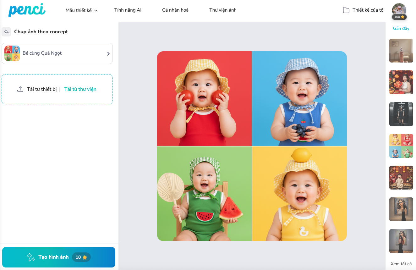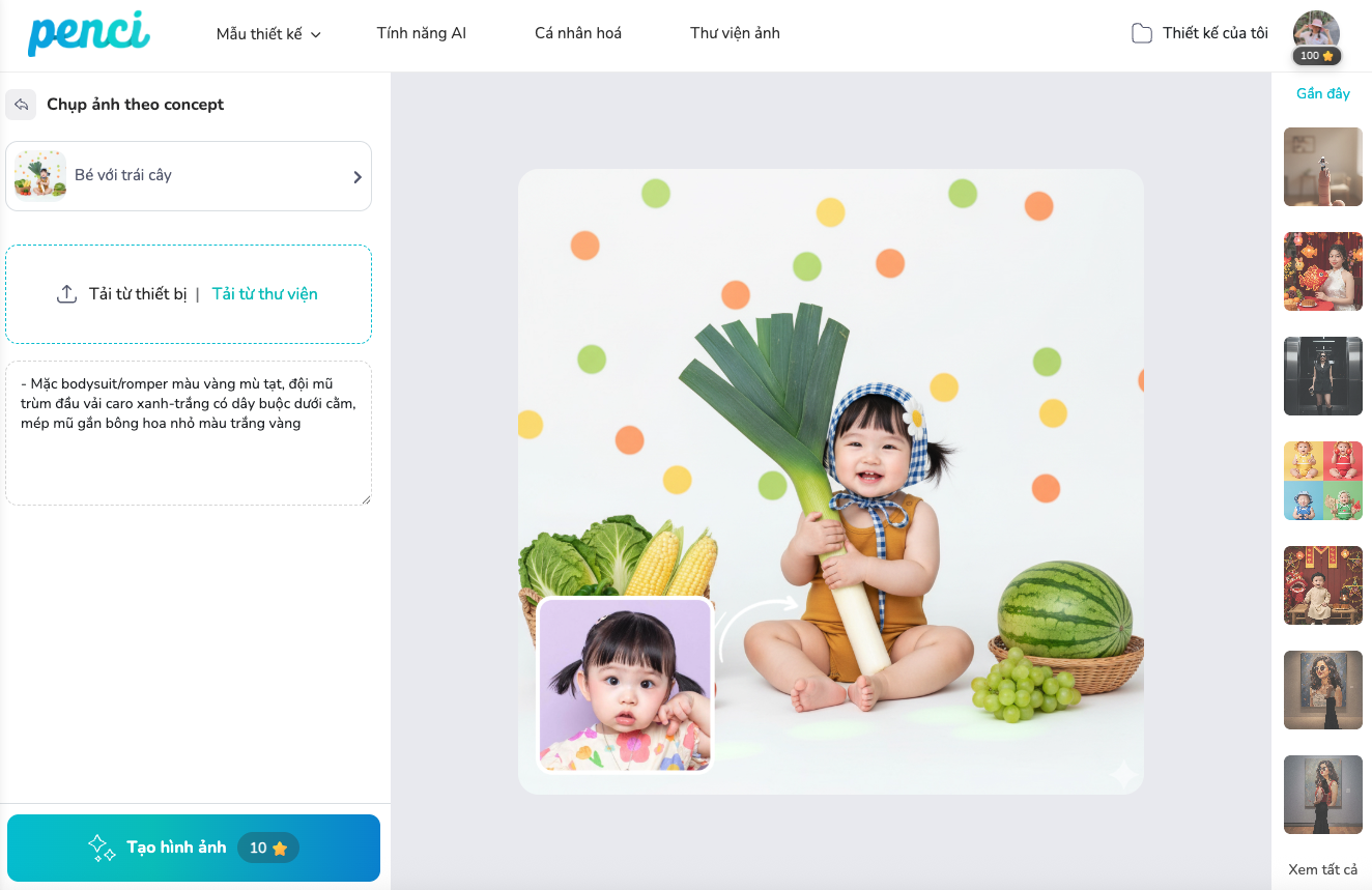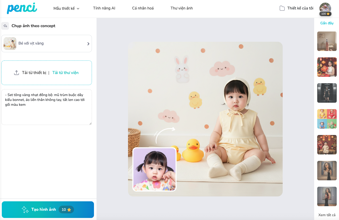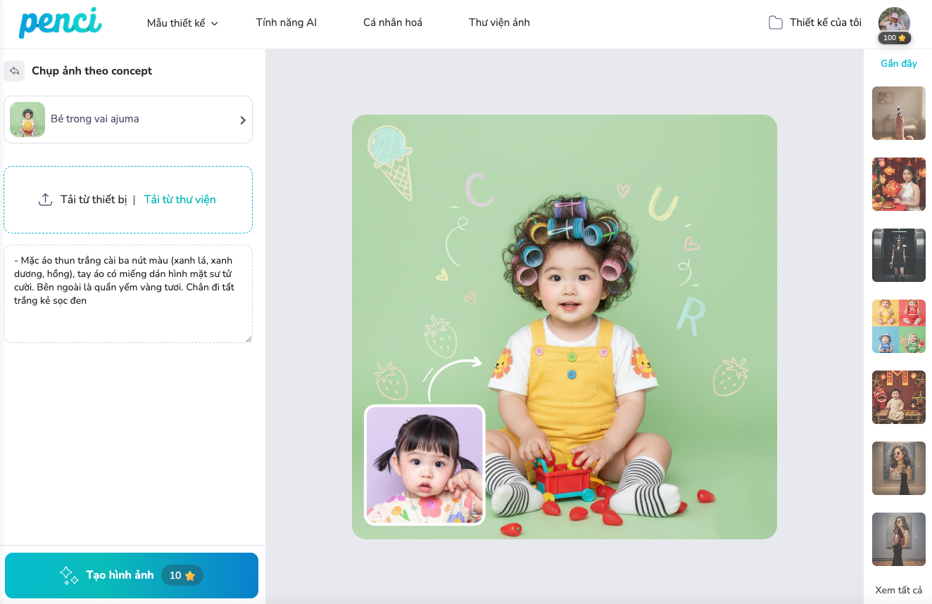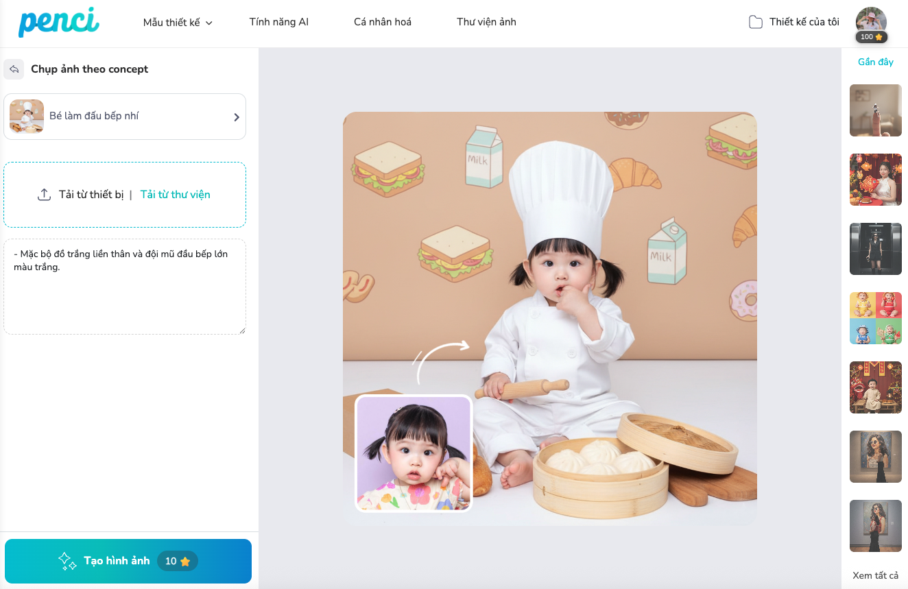 thieke thuvien Tạo ảnh cho bé bằng AI, xu hướng mới cho bố mẹ sáng tạo kỷ niệm By admin | 07 tháng 10 năm 2025 45 đã đọc Trong thời đại công nghệ 5.0, việc lưu giữ khoảnh khắc đáng yêu của con không chỉ gói gọn trong những bức ảnh chụp thông thường. Với công cụ tạo ảnh cho bé bằng AI trên Penci, bố mẹ có thể biến tấm ảnh đời thường thành concept chụp studio chuyên nghiệp, độc đáo và đầy sáng tạo. Đặc biệt, mọi phong cách đã được cài đặt sẵn prompt câu lệnh, bố mẹ không cần phải viết câu lệnh phức tạp. Chỉ cần truy cập vào AI Tools Penci, chọn phong cách rồi tải ảnh bé lên, nhập mô tả (nếu có) và nhận kết quả chỉ sau vài giây. 1. Vì sao nên thử tạo ảnh cho bé bằng AI? Trong vài năm trở lại đây, ảnh AI không chỉ là xu hướng cho người lớn mà còn trở thành lựa chọn thú vị cho các bậc phụ huynh muốn lưu giữ khoảnh khắc tuổi thơ của con. Nếu như trước đây bạn phải dẫn bé ra studio, chuẩn bị trang phục, trang điểm và chụp hàng trăm kiểu để chọn ra vài tấm đẹp, thì nay chỉ cần một bức ảnh chân dung đơn giản là đã có thể tạo ra hàng chục concept độc đáo. Hình ảnh bé được tạo từ Penci AI Một vài điểm cộng nổi bật: Tiết kiệm chi phí: Chỉ bằng vài thao tác, bạn có bộ ảnh “chuẩn studio” mà không cần thuê ekip chuyên nghiệp. An toàn, tiện lợi: Bé không phải di chuyển, không bị mệt khi chụp lâu, bố mẹ có thể chủ động chỉnh sửa nhiều lần. Đa dạng phong cách: Từ sinh nhật lung linh, thời trang cá tính cho tới những concept hài hước như “bé trong máy giặt”, tất cả đều có sẵn để thử nghiệm. Ứng dụng linh hoạt: Ảnh AI không chỉ để ngắm mà còn có thể in thành thiệp mừng sinh nhật, photobook, lịch treo tường, hoặc đơn giản là làm avatar, ảnh bìa Facebook. So với ảnh chụp truyền thống, ảnh AI có lợi thế ở sự sáng tạo không giới hạn. Bạn có thể cho bé “đứng cạnh chú vịt vàng đáng yêu” hay “hóa thân thành đầu bếp nhí trong căn bếp xinh xắn” những concept mà bé yêu khó lòng phối hợp cùng studio để thực hiện. Với Penci AI, mọi thao tác đã được đơn giản hóa. Các câu lệnh (prompt) đều được cài đặt sẵn, bố mẹ chỉ cần tải ảnh bé lên, nhập thêm một số chi tiết như trang phục hay nhân vật yêu thích nếu muốn, và nhấn “Tạo ảnh”. Chỉ sau 10 giây, bộ ảnh mới đã sẵn sàng để lưu giữ hoặc chia sẻ cùng bạn bè. 2. Gợi ý các phong cách tạo ảnh cho bé bằng AI thông minh tích hợp tại Penci.vn Bố mẹ cùng tham khảo các phong cách tạo ảnh với AI dưới đây để tạo nên bộ sưu tập ảnh kỷ niệm tuyệt đẹp cho bé yêu nha. Tạo ảnh chụp sinh nhật bé gái Với phong cách này, ảnh của bé sẽ được ghép vào concept sinh nhật lung linh, có bánh kem lớn, số tuổi nổi bật trong không gian studio sang trọng. Bố mẹ chỉ cần nhập mô tả về trang phục, cử chỉ của bé và số tuổi trên bánh kem, sau đó nhấn tạo ảnh. Kết quả sẽ mang lại bộ ảnh kỷ niệm sinh nhật độc đáo, như được chụp tại studio chuyên nghiệp. 👉 Bắt đầu Tạo ảnh chụp sinh nhật bé gái Tạo ảnh bé cùng quả ngọt Nếu bạn muốn những bức hình đơn giản nhưng đáng yêu, hãy thử phong cách này. AI sẽ tự động tạo 4 bức ảnh bé cùng 4 loại quả khác nhau với màu nền tương ứng. Bố mẹ không cần nhập mô tả, chỉ cần tải ảnh bé lên là có ngay loạt ảnh rực rỡ, ngọt ngào. 👉 Bắt đầu Tạo ảnh bé cùng quả ngọt Tạo ảnh bé làm đầu bếp nhí Hãy để bé trở thành một đầu bếp nhí dễ thương. Chỉ cần nhập mô tả trang phục (ví dụ: áo bếp, mũ bếp), công cụ sẽ ghép bé vào khung bếp với đồ ăn xinh xắn đầy màu sắc. Đây sẽ là concept tuyệt vời cho bố mẹ muốn tạo kỷ niệm vui nhộn. 👉 Bắt đầu Tạo ảnh bé làm đầu bếp nhí Tạo ảnh bé với vịt vàng Ảnh bé sẽ được ghép vào bối cảnh có những chú vịt vàng đáng yêu. Bố mẹ có thể nhập mô tả trang phục để làm cho ảnh thêm hài hòa, sinh động. 👉 Bắt đầu Tạo ảnh bé với vịt vàng Tạo ảnh bé với trái cây Nếu bạn muốn bé xuất hiện trong khung cảnh vui tươi, nhiều màu sắc, hãy chọn concept bé cùng trái cây. Chỉ cần nhập mô tả trang phục, AI sẽ tự động tạo nên những bức ảnh sống động, dễ thương. 👉 Bắt đầu Tạo ảnh bé với trái cây Tạo ảnh bé thời trang Chanel Cho bé thử hóa thân thành fashionista nhí với phong cách thời trang sang trọng. Bố mẹ chỉ cần nhập mô tả trang phục, AI sẽ ghép ảnh bé vào concept thời trang Chanel độc đáo và cá tính. 👉 Bắt đầu Tạo ảnh bé thời trang Chanel Tạo ảnh bé trong vai Ajuma Phong cách này mang lại sự hài hước và đáng yêu khi bé được hóa thân thành Ajuma Hàn Quốc. Chỉ cần nhập mô tả trang phục, công cụ sẽ tạo ngay loạt ảnh thú vị, khiến bố mẹ không khỏi bật cười. 👉 Bắt đầu Tạo ảnh bé trong vai Ajuma Tạo ảnh bé trong máy giặt Một concept độc đáo và đầy sáng tạo: bé xuất hiện trong chiếc máy giặt với nhiều chi tiết