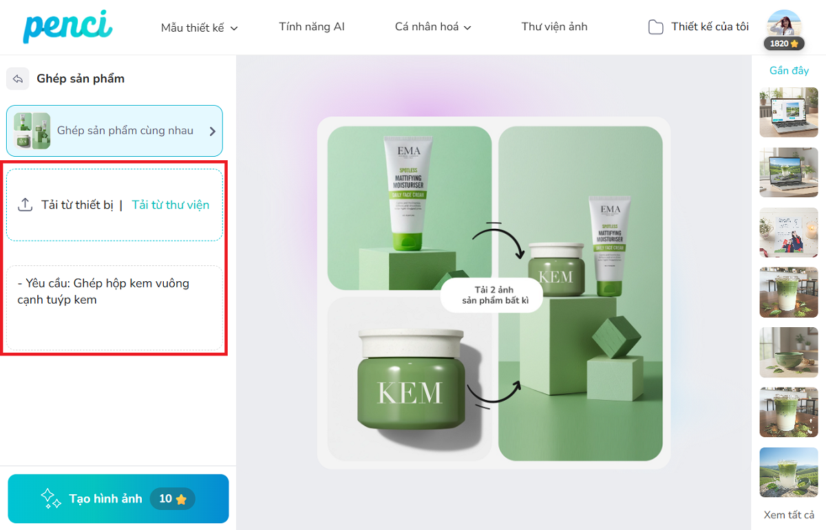 thieke thuvien Tổng hợp các tool AI tạo ảnh sản phẩm đẹp, chuyên nghiệp, miễn phí và tối ưu nhất cho kinh doanh online cùng Penci By admin | 03 tháng 11 năm 2025 9 đã đọc Trong kỷ nguyên số, hình ảnh chính là “ngôn ngữ” giúp sản phẩm thu hút khách hàng chỉ trong 3 giây đầu tiên. Nếu trước đây bạn phải tốn thời gian và chi phí cho việc chụp ảnh, thuê studio hay thiết kế hậu kỳ, thì giờ đây việc tạo ảnh sản phẩm bằng AI đã thay đổi hoàn toàn cuộc chơi. Với sự hỗ trợ của hàng loạt tool AI tạo ảnh sản phẩm như Penci, bạn có thể dễ dàng tạo ảnh sản phẩm online, chỉnh ảnh sản phẩm chuyên nghiệp, đổi nền sản phẩm bằng AI và chụp ảnh sản phẩm với AI chỉ trong chưa đầy 30 giây vừa nhanh, đẹp, tiết kiệm và tối ưu cho kinh doanh online. >> Gợi ý xu hướng quà tặng cá nhân hóa dành cho cá nhân và doanh nghiệp ý nghĩa 1/ Tạo ảnh AI là gì? Tại sao bạn nên tạo ảnh sản phẩm bằng AI với Penci Tạo ảnh AI (AI Image Generation) là quá trình bạn chỉ cần nhập mô tả ngắn gọn (prompt) và trí tuệ nhân tạo sẽ tự động tạo ra hình ảnh sản phẩm hoàn chỉnh, chuyên nghiệp. Các tool AI tạo ảnh sản phẩm ngày nay không chỉ dừng lại ở việc tạo ảnh mới, mà còn có thể đổi nền sản phẩm bằng AI, ghép người vào ảnh, gắn logo thương hiệu, hoặc thêm hiệu ứng sản phẩm AI cực kỳ chân thực. Chính vì vậy, công cụ AI miễn phí đang trở thành trợ thủ đắc lực cho người bán hàng online và các shop nhỏ lẻ muốn tiết kiệm chi phí chụp ảnh. Công cụ AI tạo ảnh sản phẩm đẹp và chuyên nghiệp không khác gì chụp ở studio Penci là công cụ thiết kế online dành cho người Việt có tích hợp công nghệ AI tạo ảnh sản phẩm miễn phí, cho phép bạn dễ dàng tự tay tạo ảnh sản phẩm chuyên nghiệp chỉ trong vài phút mà không cần biết thiết kế. Bạn chỉ cần nhập vài mô tả ngắn như “ly matcha đặt giữa đồi trà xanh” hay “áo thun treo trên sào đồ trong không gian tối giản”, hệ thống AI tạo ảnh sản phẩm của Penci sẽ tự động sinh ra hình ảnh với bố cục, ánh sáng và phong cách phù hợp đúng theo mô tả của bạn. >> Xem thêm cách tạo ảnh AI online miễn phí từ văn bản thành hình ảnh đơn giản *Tại sao nên chọn tạo ảnh sản phẩm tại Penci? - Hoàn toàn MIỄN PHÍ: Penci là công cụ AI miễn phí giúp bạn tạo ảnh sản phẩm đẹp mà không cần trả phí khi sử dụng. - Tối ưu sẵn: Hệ thống AI của Penci đã được huấn luyện sẵn, chỉ cần mô tả ngắn gọn, không cần prompt dài dòng mà vẫn cho ra ảnh sản phẩm đúng ý. - Đa dạng phong cách: Penci liên tục cập nhật các phong cách thiết kế ảnh sản phẩm online đến các tính năng đặc biệt như đổi nền sản phẩm bằng AI, ghép logo vào sản phẩm, hay AI ghép người vào ảnh. - Ứng dụng linh hoạt: Ảnh sản phẩm sau khi tạo có thể dùng ngay để thiết kế banner, poster, mockup sản phẩm online ngay trong cùng một nền tảng đồng bộ và chuyên nghiệp. Công cụ AI tạo ảnh sản phẩm của Penci chuyên nghiệp và dễ dùng cho người bán hàng online 2. Tổng hợp các công cụ AI tạo ảnh sản phẩm chuyên nghiệp, miễn phí và tối ưu nhất hiện nay Dưới đây là danh sách 10 nhóm tool AI tạo ảnh sản phẩm phổ biến, giúp bạn tạo hình sản phẩm cực nhanh và đẹp mắt chỉ trong vài phút. >> Xem thêm các xu hướng tạo ảnh AI online dành cho bé cực kỳ dễ thương 2.1. Tính năng AI biến đổi phông nền sản phẩm Với công cụ AI tạo ảnh sản phẩm của Penci, bạn có thể dễ dàng đổi nền sản phẩm bằng AI theo ý muốn mà không cần setup không gian, máy ảnh, mua đạo cụ,... Chỉ cần nhập mô tả ngắn gọn như “khung ảnh treo trên tường trắng sáng tự nhiên” hoặc “hộp bánh đặt trong gian bếp sang trọng”, hệ thống sẽ tự động tạo nền sản phẩm chuyên nghiệp phù hợp với phong cách bạn mong muốn. >> Thử biến đổi phông nền sản phẩm ngay với tính năng AI trên Penci! >> Xem thêm HƯỚNG DẪN cách biến đổi phong nền bằng AI chi tiết tại Youtube Đổi nền sản phẩm bằng AI cho ảnh sản phẩm chuyên nghiệp hơn 2.2. Tính năng AI ghép sản phẩm vào phông nền Nếu bạn đã có sẵn ảnh sản phẩm và một background riêng, tool AI tạo ảnh sản phẩm sẽ giúp bạn ghép sản phẩm vào background tự nhiên, có ánh sáng, bóng đổ và góc nhìn chuẩn mà không các công cụ phúc tạp như photoshop, AI,.... Tính năng này cực kỳ hữu ích cho người bán hàng online muốn tạo bộ ảnh đa bối cảnh mà không tốn thời gian dựng cảnh. >> Ghép sản phẩm của bạn vào phông nền yêu thích ngay với tool AI của Penci! Tool AI ghép sản phẩm vào background tự nhiên, sinh động 2.3. Tính năng AI ghép người vào sản phẩm Một hình ảnh có người thật sử dụng sản phẩm luôn tạo cảm giác chân thực và giúp khách hàng dễ hình dung hơn khi mua hàng. Với AI ghép người vào sản phẩm từ Penci, bạn chỉ cần tải lên ảnh người mẫu và ảnh sản phẩm, hệ thống AI tạo ảnh sản phẩm online sẽ tự động căn chỉnh tay cầm, ánh sáng, bóng đổ và t