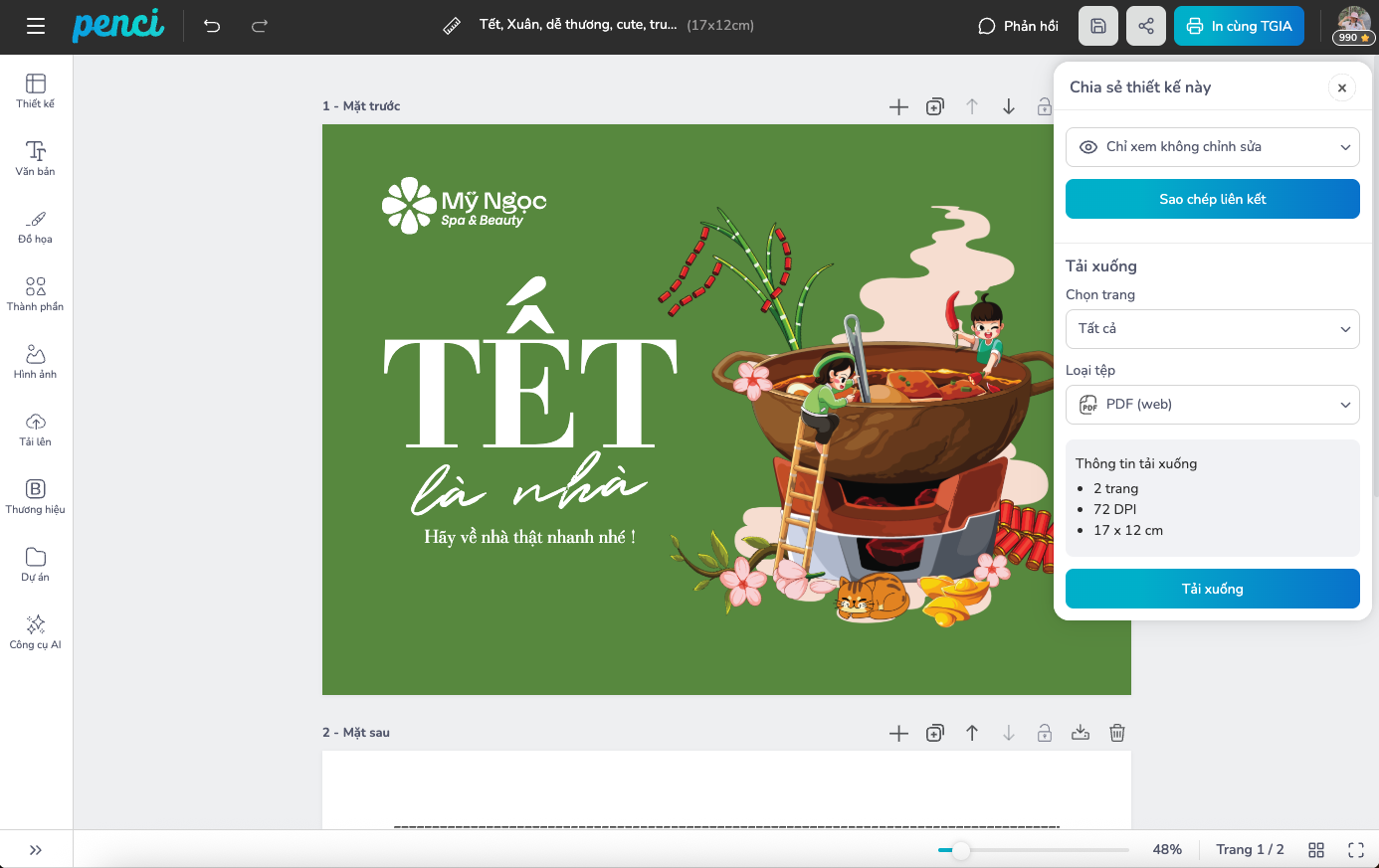 thieke thuvien Tổng hợp mẫu thiệp chúc Tết, thiệp mừng năm 2026 đẹp, sáng tạo và mới nhất By admin | 20 tháng 01 năm 2026 37 đã đọc Năm Xuân Bính Ngọ 2026, xu hướng thiệp Tết không còn bó hẹp trong những mẫu in truyền thống mà đã mở rộng sang các phiên bản thiệp online, thiệp điện tử, thiệp cá nhân hóa vô cùng sáng tạo. Người dùng có thể tự thiết kế thiệp chúc Tết ngay trên điện thoại hoặc máy tính chỉ với vài thao tác đơn giản. Vậy thiệp chúc Tết dùng để làm gì? Nên chọn mẫu thiệp mừng năm 2026 ra sao để vừa đẹp, vừa ý nghĩa? Bài viết dưới đây sẽ giúp bạn tổng hợp những mẫu thiệp Tết mới nhất, đồng thời hướng dẫn cách tự thiết kế thiệp online dễ dàng trên Penci. 1. Thiệp chúc Tết dùng để làm gì? Thiệp chúc Tết không chỉ là một tấm ảnh hay tờ giấy in lời chúc, mà còn là cách thể hiện tình cảm và sự trân trọng trong văn hóa chúc Tết của người Việt. Chúc Tết là văn hoá truyền thống của người Việt - Gửi gắm lời chúc năm mới: Thiệp Tết là phương tiện giúp truyền tải những lời chúc tốt đẹp như an khang, thịnh vượng, sức khỏe, may mắn đến người nhận một cách trang trọng và tinh tế hơn so với tin nhắn thông thường. - Thể hiện sự quan tâm và lịch sự: Một tấm thiệp được chuẩn bị chỉn chu luôn tạo ấn tượng tốt, đặc biệt là trong kinh doanh, đây là cách giao tiếp rất hiệu quả. - Công cụ kết nối trong kinh doanh: Với doanh nghiệp, thiệp mừng năm mới thường được dùng để gửi lời tri ân tới khách hàng, chúc Tết đối tác, gắn kết nội bộ nhân viên và truyền thông hình ảnh thương hiệu dịp đầu năm. - Lưu giữ giá trị tinh thần: Khác với lời chúc thoáng qua trên mạng xã hội, thiệp Tết dù là bản in hay bản online thì đều có tính lưu giữ cao, giúp người nhận cảm nhận rõ hơn sự chân thành của người gửi. - Phù hợp nhiều hoàn cảnh: Thiệp chúc Tết có thể sử dụng cho cá nhân gửi bạn bè, người thân; doanh nghiệp gửi đối tác, khách hàng; trường học, tổ chức gửi lời chúc đầu năm; các sự kiện, chương trình Xuân. Dù ở hình thức nào, thiệp chúc Tết vẫn luôn là cách chúc mừng năm mới văn minh, ý nghĩa và giàu cảm xúc nhất. 2. Tổng hợp mẫu thiệp mừng năm 2026 sáng tạo và mới nhất Bước sang năm 2026, các mẫu thiệp Tết ngày càng đa dạng về phong cách: từ truyền thống, hiện đại cho đến tối giản, cá nhân hóa. Người dùng có thể lựa chọn thiệp in, thiệp điện tử, hoặc thiệp online tùy theo nhu cầu. Những mẫu thiệp chúc Tết năm nay thường tập trung vào các yếu tố quen thuộc như: linh vật năm Bính Ngọ, câu chúc đầu năm, họa tiết mùa xuân, hoa đào hoa mai, tất cả đều dàn trên bố cục gọn gàng, dễ tùy chỉnh. Thiệp chúc Tết 2026 thiết kế hiện đại và tinh tế Mẫu thiệp mừng năm mới bố cục gọn gàng dễ dùng Thiệp Tết phong cách tối giản phù hợp nhiều đối tượng Mẫu thiệp chúc mừng năm 2026 chuyên nghiệp Thiệp chúc Tết với lời chúc ý nghĩa đầu năm Mẫu thiệp Xuân Bính Ngọ dễ tùy chỉnh nội dung Thiệp chúc Tết online 2026 dễ chỉnh sửa nội dung Mẫu thiệp điện tử mừng năm mới thiết kế tinh tế Thiệp chúc Tết 2026 dùng gửi qua mạng xã hội Mẫu thiệp online Xuân Bính Ngọ phong cách hiện đại Thiệp mừng năm mới 2026 phù hợp gửi nhanh trực tuyến Mỗi mẫu thiệp đều được thiết kế sẵn bố cục chuẩn, giúp người dùng chỉ cần thay đổi nội dung, tên người gửi hoặc logo là có thể sử dụng ngay. Điều này đặc biệt hữu ích cho những ai muốn có thiệp Tết đẹp mà không cần biết thiết kế. 👉 Khám phá thêm hàng trăm mẫu thiệp chúc Tết 2026 tại thư viện thiết kế của Penci. 3. Tự thiết kế thiệp Tết ngay trên Penci.vn Nếu bạn muốn một tấm thiệp mang dấu ấn riêng thay vì dùng mẫu có sẵn, thì Penci.vn chính là công cụ lý tưởng để tự tay tạo thiệp chúc Tết chỉ trong vài phút. Quy trình thiết kế thiệp Tết trên Penci vô cùng đơn giản: Bước 1: Truy cập thư viện mẫu Người dùng chỉ cần vào Penci.vn và tìm đến danh mục “Thiệp chúc mừng” để xem toàn bộ kho mẫu Thiệp Tết 2026 mới nhất. Truy cập vào thư viện mẫu Bước 2: Chọn mẫu thiệp yêu thích Từ hàng trăm mẫu có sẵn, bạn dễ dàng chọn được thiết kế phù hợp với mục đích sử dụng: thiệp cá nhân, thiệp doanh nghiệp, thiệp mừng năm mới online,… Đa dạng mẫu thiết kế Bước 3: Chỉnh sửa theo ý muốn Penci có giao diện kéo thả trực quan, cho phép bạn thay đổi nội dung lời chúc; sửa tên người gửi và người nhận; điều chỉnh màu sắc, font chữ; thêm logo, hình ảnh cá nhân; sắp xếp lại bố cục và kích thước;... Tất cả thao tác đều thực hiện trực tuyến, không cần cài đặt phần mềm phức tạp. Dễ dàng chỉnh sửa và sáng tạo Bước 4: Tải về hoặc sử dụng ngay Sau khi hoàn thiện, bạn có thể: - Tải thiệp về dưới dạng ảnh hoặc PDF - Gửi trực tiếp qua Zalo, Facebook, Email - Đặt in nhanh chóng nếu cần bản in Tải xuống 