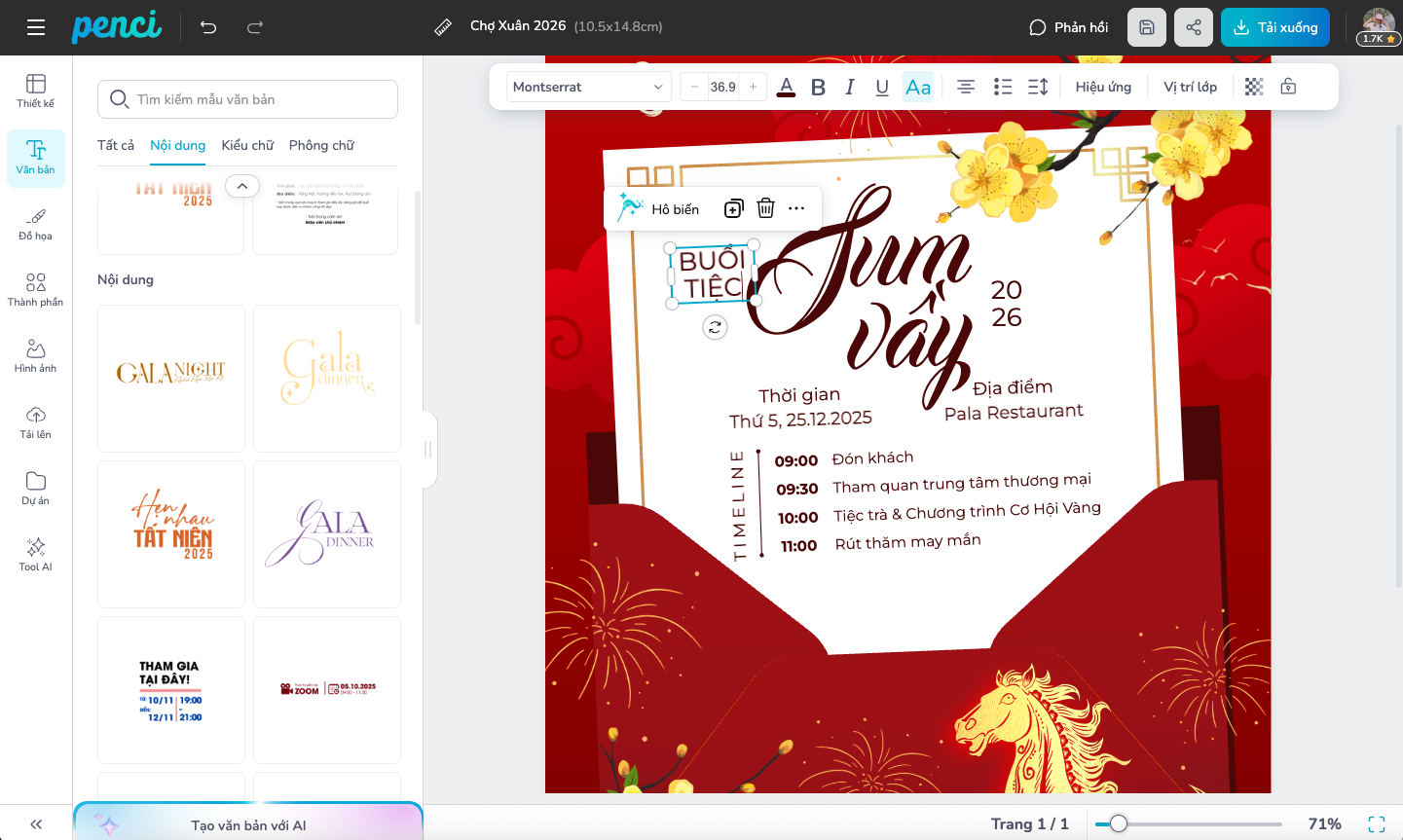 thieke thuvien Tổng hợp mẫu thiệp mời, thư mời tham dự Hội chợ Xuân miễn phí tải xuống, tùy chỉnh online dễ dàng By admin | 31 tháng 12 năm 2025 9 đã đọc Hội chợ Xuân là hoạt động quen thuộc mỗi dịp Tết Nguyên Đán, thường được tổ chức tại trường học, khu dân cư, doanh nghiệp hoặc các đơn vị cộng đồng. Để sự kiện diễn ra chỉn chu và chuyên nghiệp, thư mời và thiệp mời tham dự Hội chợ Xuân đóng vai trò quan trọng trong việc truyền tải thông tin và tạo thiện cảm ban đầu với người tham gia. Trong bài viết này, Penci tổng hợp các mẫu thiệp mời, thư mời Hội chợ Xuân đẹp, miễn phí tải xuống, đồng thời hướng dẫn cách tùy chỉnh online nhanh chóng, phù hợp nhiều mục đích sử dụng khác nhau. 1. Thư mời tham dự Hội chợ Xuân dùng để làm gì? Thư mời tham dự Hội chợ Xuân không chỉ đơn thuần là một văn bản thông báo thời gian và địa điểm. Trong bối cảnh hiện nay, thư mời còn là “bộ mặt” đầu tiên của sự kiện, thể hiện mức độ đầu tư, tính chuyên nghiệp và tinh thần Tết mà đơn vị tổ chức muốn truyền tải. Ảnh mockup được tạo bởi AI Bên cạnh yếu tố thông tin, thư mời Hội chợ Xuân còn mang giá trị cảm xúc. Một mẫu thư mời được thiết kế đẹp, mang không khí Tết với hoa mai, hoa đào, câu chúc đầu năm hay màu sắc truyền thống sẽ tạo thiện cảm ngay từ cái nhìn đầu tiên. Người nhận dễ cảm thấy được trân trọng và có xu hướng tham gia sự kiện nhiều hơn so với những thông báo khô khan, thiếu đầu tư. Với trường học, thư mời Hội chợ Xuân thường được gửi đến phụ huynh, học sinh, cựu học sinh hoặc khách mời để giới thiệu các hoạt động trải nghiệm, gian hàng gây quỹ, trò chơi dân gian. Với doanh nghiệp và tổ chức, thư mời thể hiện sự chuyên nghiệp, đồng thời góp phần xây dựng hình ảnh thương hiệu trong dịp đầu năm. Còn với khu dân cư, hội nhóm, thư mời giúp tăng tính kết nối cộng đồng và tạo không khí Tết chung. 2. Các thông tin cần có trong thư mời tham dự Hội chợ Xuân Một thư mời Hội chợ Xuân cần đảm bảo đầy đủ các thông tin cơ bản để người nhận dễ tiếp nhận và chủ động tham dự. Cụ thể gồm: - Tên sự kiện: Hội chợ Xuân (ghi rõ tên chương trình nếu có). - Thời gian tổ chức: ngày, giờ bắt đầu và kết thúc. - Địa điểm diễn ra: ghi rõ địa chỉ, khu vực hoặc không gian tổ chức. - Nội dung chính của chương trình: giới thiệu ngắn gọn các hoạt động nổi bật tại Hội chợ Xuân. - Đối tượng tham gia: khách mời, phụ huynh, học sinh, nhân sự, cộng đồng dân cư hoặc đối tác. - Đơn vị tổ chức: trường học, doanh nghiệp, cơ quan hoặc ban tổ chức. - Thông tin liên hệ: số điện thoại, email hoặc người phụ trách để hỗ trợ khi cần thiết. Việc trình bày đầy đủ và rõ ràng các nội dung trên không chỉ giúp hạn chế nhầm lẫn mà còn góp phần thể hiện sự chuyên nghiệp, chỉn chu của đơn vị tổ chức ngay từ bước mời tham dự. 3. Tổng hợp mẫu thiệp mời tham dự Hội chợ Xuân miễn phí tải xuống Các mẫu thiệp mời tham dự Hội chợ Xuân hiện nay có thiết kế đa dạng, từ truyền thống đến hiện đại, phù hợp với trường học, doanh nghiệp và các cộng đồng khác nhau. Hãy cùng tham khảo một số mẫu thiết kế dưới đây của Penci: Thiệp mời Hội chợ Xuân phong cách truyền thống Tết Việt Mẫu thư mời Hội chợ Xuân dùng cho trường học Thiệp mời Hội chợ Xuân thiết kế hiện đại, dễ chỉnh sửa Thư mời tham dự Hội chợ Xuân cho doanh nghiệp Mẫu thiệp mời Hội chợ Xuân màu đỏ vàng may mắn Thư mời Hội chợ Xuân dạng digital gửi online Thiệp mời Hội chợ Xuân phù hợp khu dân cư, hội nhóm Để xem đầy đủ các mẫu thiệp mời, thư mời Hội chợ Xuân và lựa chọn thiết kế phù hợp, bạn có thể tham khảo trực tiếp tại thư viện mẫu Thư mời của Penci. 4. Các mẫu thư mời Hội chợ Xuân được tùy chỉnh trực tuyến ngay trên Penci Thay vì phải thiết kế từ đầu hoặc chỉnh sửa các file phức tạp, nhiều đơn vị hiện nay lựa chọn tùy chỉnh thư mời Hội chợ Xuân trực tuyến trên Penci để tiết kiệm thời gian và công sức. Penci là công cụ thiết kế online dành cho người Việt, cung cấp thư viện mẫu thiệp mời và thư mời Hội chợ đa dạng, được xây dựng sẵn theo bố cục chuẩn. Thư viện mẫu thư mời đa dạng Các mẫu thư mời Hội chợ Xuân trên Penci cho phép người dùng chỉnh sửa trực tiếp nội dung như tên sự kiện, thời gian, địa điểm, đơn vị tổ chức và thông tin liên hệ. Giao diện thiết kế trực quan, thao tác kéo thả đơn giản, phù hợp cả với những người không có nền tảng thiết kế. Dễ dàng tuỳ chỉnh nội dung thư mời Ngoài nội dung chữ, người dùng cũng có thể thay đổi màu sắc, font chữ hoặc thêm logo để đồng bộ với nhận diện thương hiệu hoặc phong cách của đơn vị tổ chức. Thư viện đồ họa Tết trên Penci được chọn lọc kỹ, mang đậm bản sắc Việt, giúp th