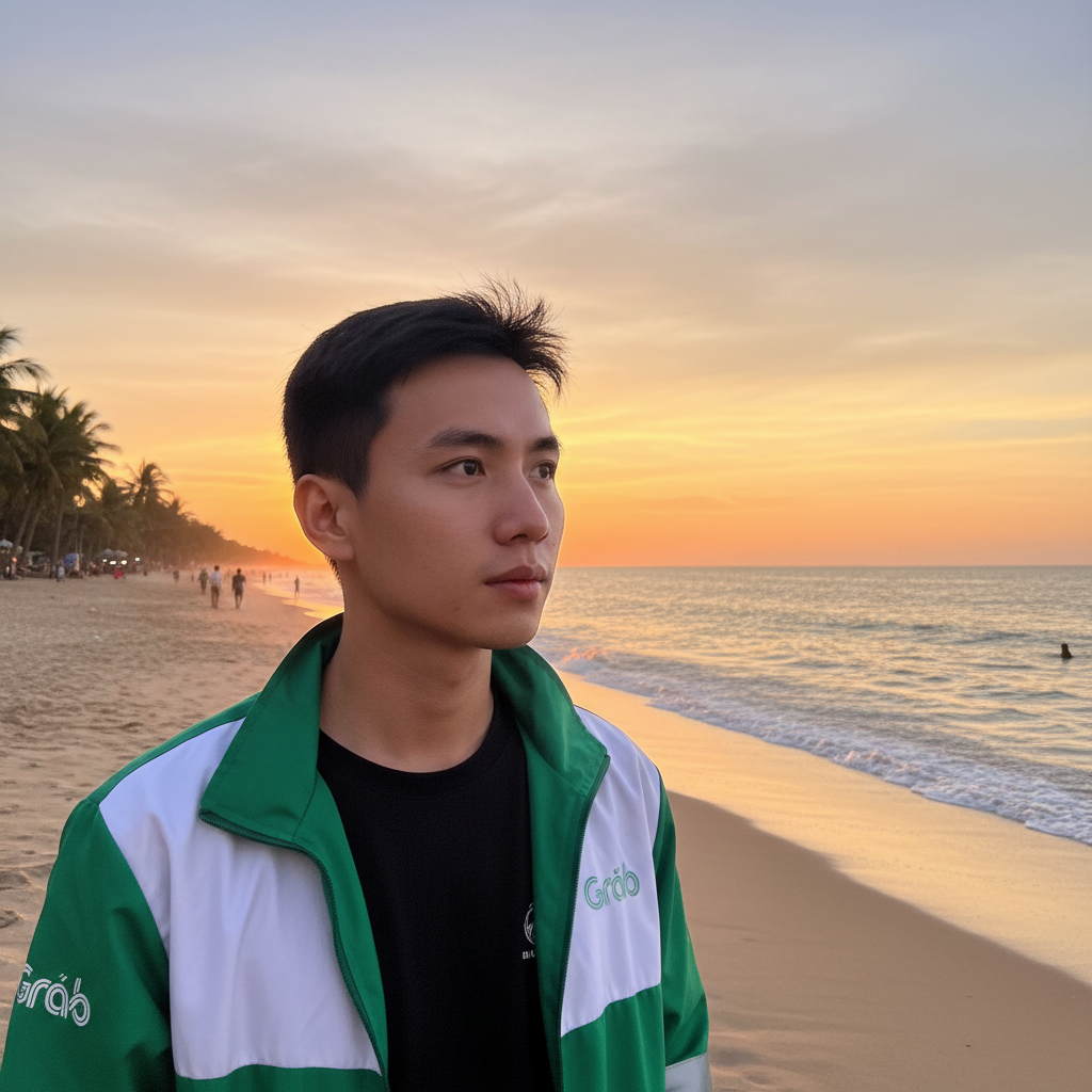 Một chàng trai việt nam, 20 tuổi, có đôi mắt đẹp, sóng mũi cao, tóc ngắn, mặc áo khoác grab, đang đứng trên một bãi biển .