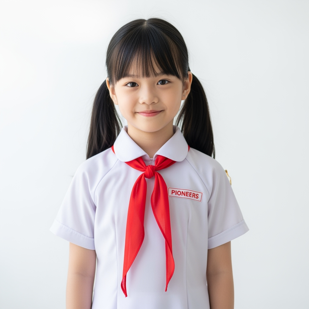 tạo ảnh cô bé việt nam mặc áo trắng đeo khăn quàng. Với màu nền là : màu white