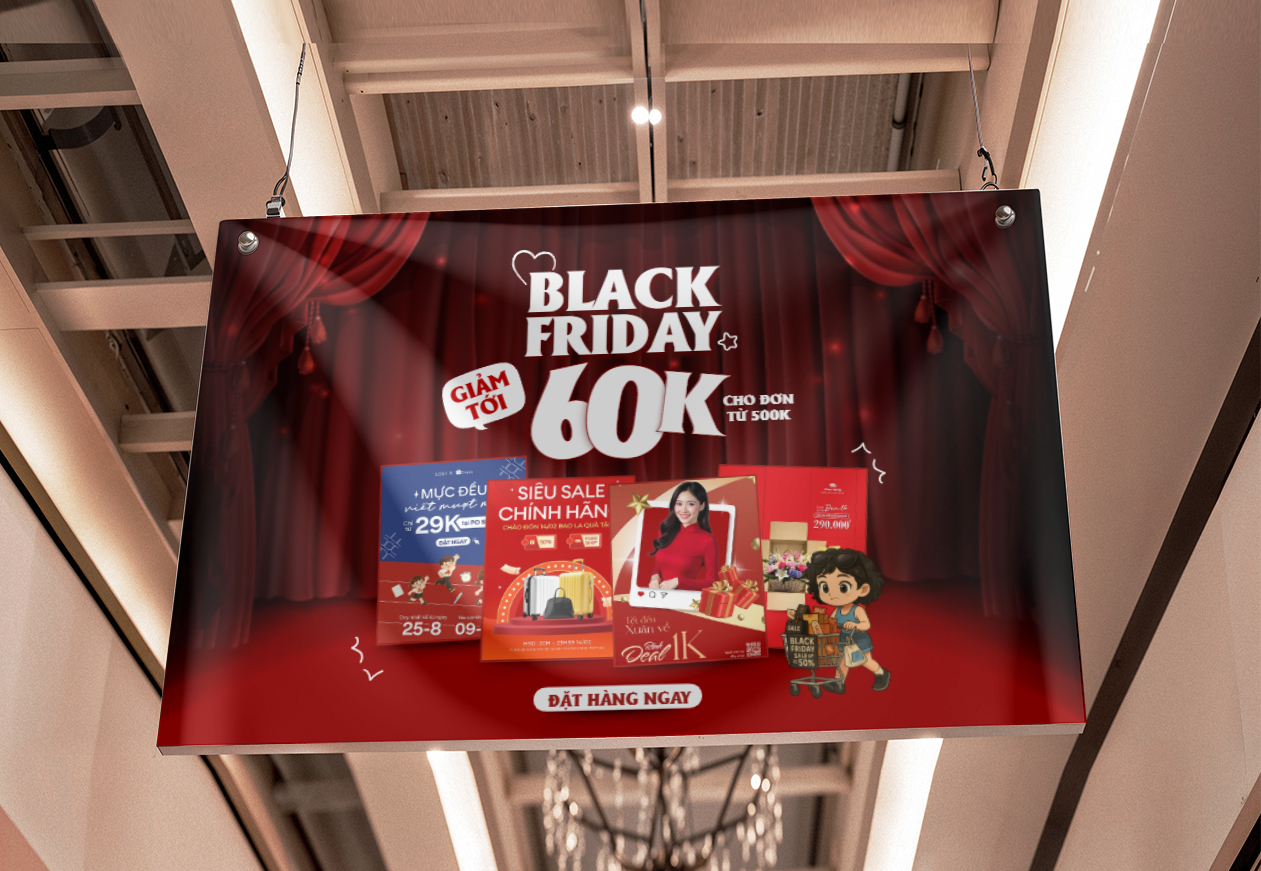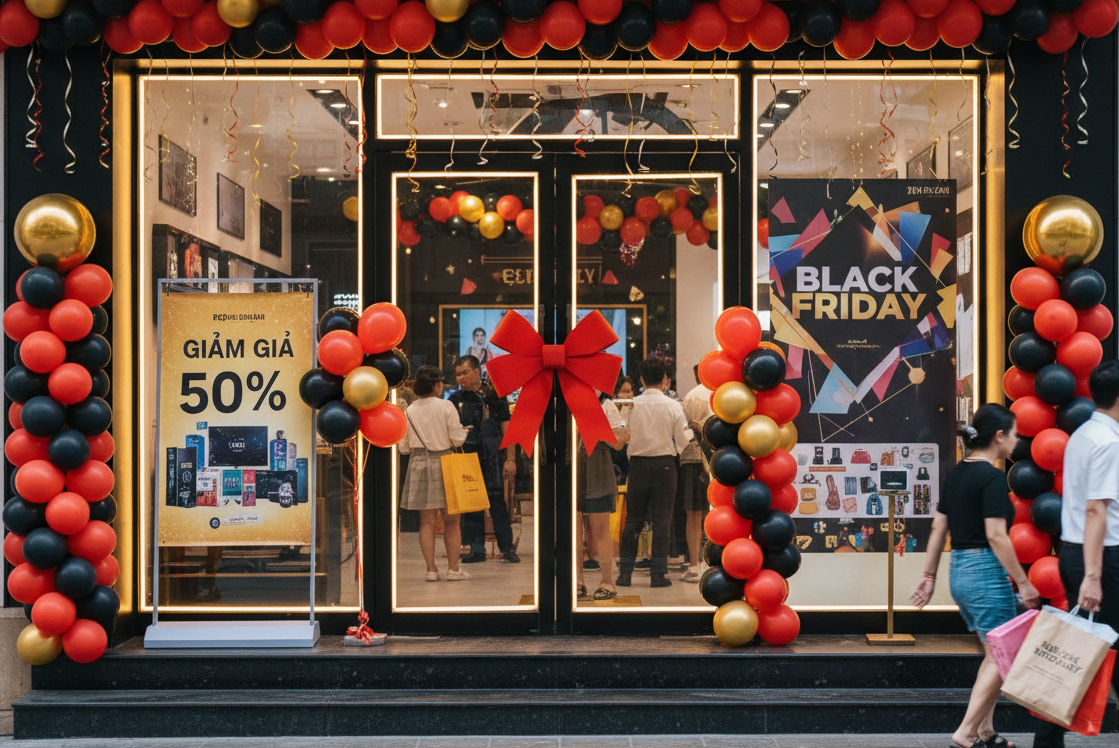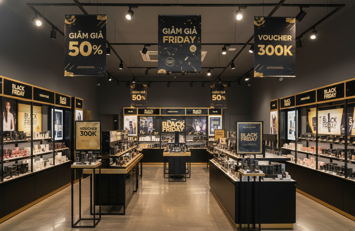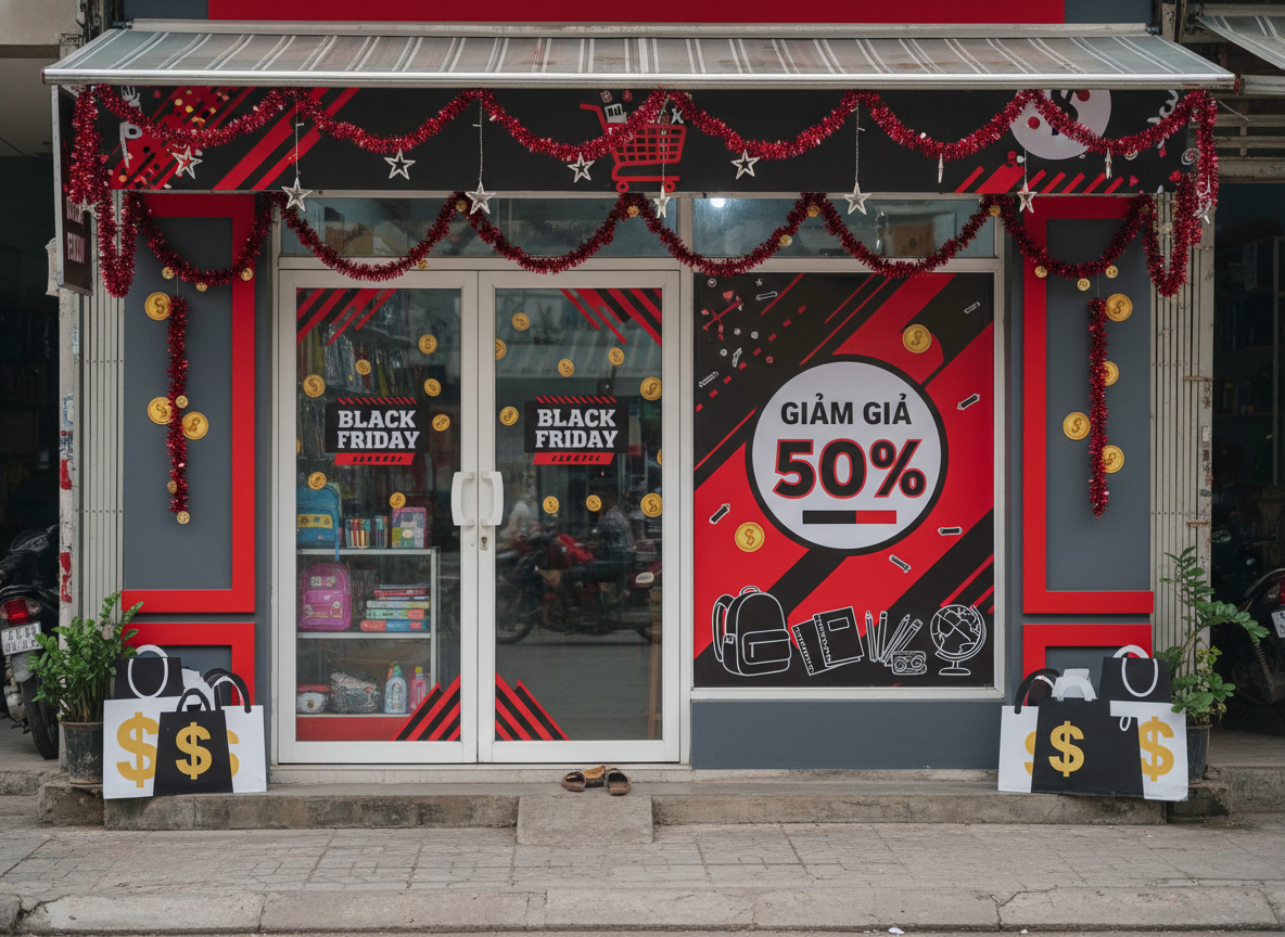 thieke thuvien 10+ ý tưởng trang trí Black Friday cho các shop, cửa hàng đặc sắc, bùng nổ và sáng tạo nhất dịp sale cuối năm By admin | 17 tháng 11 năm 2025 235 đã đọc Bạn đang tìm kiếm ý tưởng trang trí shop, cửa hàng dịp Black Friday vừa đẹp, vừa độc đáo, lại dễ thực hiện và tiết kiệm chi phí? Hãy tham khảo ngay hơn 10+ ý tưởng trang trí Black Friday phù hợp cho mọi ngành hàng từ trang trí Black Friday ngoài cửa hàng, trang trí trong cửa hàng, đến trang trí sale Black Friday kệ trưng bày sản phẩm. Những ý tưởng này không chỉ giúp trang trí shop Black Friday độc đáo, mà còn tạo trải nghiệm mua sắm ấn tượng, ghi dấu ấn thương hiệu và thu hút khách hàng dịp sale cuối năm. >> Tham khảo ngay các banner, poster khuyến mãi dịp sale Black Friday hấp dẫn 1. Trang trí ngoài cửa hàng sang trọng với banner Black Friday ấn tượng Sử dụng banner Black Friday cỡ lớn ở mặt tiền cửa hàng luôn là cách thu hút khách từ cái nhìn đầu tiên. Kết hợp thêm ruy băng nơ bản lớn hai bên khung cửa tạo điểm nhấn tinh tế và sang trọng. Bạn có thể tự thiết kế banner Black Friday chuyên nghiệp với mẫu có sẵn trên Penci, chỉnh sửa nội dung và màu sắc, sau đó in trên bạt để trang trí ngay trước cửa. Đây là một trong những cách trang trí cửa hàng Black Friday đơn giản nhưng ấn tượng giúp tăng nhận diện thương hiệu và thu hút khách từ xa. Banner Black Friday ngoài cửa hàng thu hút khách dịp sale cuối năm >> Sử dụng ngay mẫu banner Black Friday này cho cửa hàng của bạn 2. Concept “Bong Bóng” tạo không gian sôi động thu hút ánh nhìn Một cụm bong bóng đặt ngay lối vào kết hợp poster hoặc banner Black Friday phía sau sẽ tạo hiệu ứng thị giác mạnh, khiến khách hàng cảm giác như đang bước vào đại tiệc giảm giá. Không gian sôi động này là ý tưởng trang trí shop sáng tạo giúp tăng hứng thú mua sắm và thời gian khách ở lại cửa hàng. Thiết kế poster với các mẫu thiết kế Black Friday của Penci không chỉ giúp bạn tiết kiệm thời gian mà còn đảm bảo poster Black Friday luôn nổi bật, phối màu chuẩn, bố cục chuyên nghiệp và dễ thu hút khách hàng ngay từ cái nhìn đầu tiên. Không gian cửa hàng Black Friday sôi động với cụm bong bóng và poster giảm giá 3. Check-in với hashtag Black Friday Đặt bảng hashtag cầm tay chủ đề Black Friday ngay với Penci trang trí cửa hàng để khách dễ chụp ảnh, chia sẻ lên mạng xã hội kèm các mini game hấp dẫn. Đây là cách tạo không khí mua sắm Black Friday sáng tạo giúp tăng tương tác, thu hút khách và lan tỏa thương hiệu dịp sale cuối năm. Khách hàng check-in với hashtag tại cửa hàng giúp lan tỏa không khí cửa hàng >> Sáng tạo và đặt in ngay các mẫu hashtag cho cửa hàng của bạn 4. Kết hợp Black Friday và Giáng Sinh tạo không gian ấm áp và nổi bật Kết hợp trang trí dịp lễ hội Black Friday với Giáng Sinh tạo điểm nhấn khác biệt. Dán toàn bộ cửa kính bằng banner Black Friday tông đen–đỏ, treo dây thông kim tuyến và hộp quà để mang không khí ấm áp và thu hút khách. Bộ trang trí này phù hợp cho quán café, nhà sách, cửa hàng mỹ phẩm, giúp tăng lưu lượng khách ghé và tỷ lệ dừng chân ghé vào cửa hàng. Bạn có thể thiết kế banner Black Friday trên Penci nhanh chóng với đồ họa Việt độc đáo, hiệu ứng bắt mắt. Trang trí cửa kính kết hợp Black Friday và Giáng Sinh với hộp quà và dây kim tuyến 5. Trang trí toàn bộ cửa hàng tone vàng sang trọng và đồng bộ Nếu muốn tạo không gian trang trí sale cuối năm độc đáo và sang trọng, hãy phủ toàn bộ cửa hàng bằng tone vàng ánh kim kết hợp banner Black Friday, standee nhỏ trên kệ và tag giấy Black Friday trực tiếp lên sản phẩm giúp khách dễ nhận diện chương trình sale Black Friday sale Tham khảo ngay các mẫu thiết kế banner, standee chủ đề Black Friday theo tone vàng sang trọng của Penci và tải file thiết kế Black Friday chuẩn in ngay để trang trí cửa hàng Black Friday vừa đẹp, vừa tiết kiệm, vừa ấn tượng với khách dịp sale cuối năm. Không gian Black Friday với tone vàng sang trọng và đồng bộ toàn cửa hàng 6. Trang trí quầy tính tiền đơn giản gọn gàng nhưng nổi bật Quầy tính tiền là nơi khách dừng lại lâu nhất, vì vậy chỉ cần trang trí đơn giản cũng giúp trang trí cửa hàng Black Friday nổi bật. Bạn có thể đặt một standee Black Friday cạnh quầy và các poster Black Friday trên bàn để nhấn mạnh chương trình giảm giá. Thiết kế này vừa đơn giản, tiết kiệm chi phí, vừa đồng bộ với tổng thể cửa hàng, giúp quầy trở nên chuyên nghiệp. Với Penci, bạn có thể tự tạo standee, poster và backdrop Black Friday, chỉnh sửa nhanh và xuất file chuẩn in, đảm bảo trang trí cửa hàng sale cuối năm hiệu quả. Quầy tính tiền được trang trí với standee và poster Black Friday >> Tải xuống miễn phí mẫu standee này trang trí Black Friday cho cửa hàng của bạn 7. Trang trí quầy tính tiền kích cầu với combo sản phẩm banner và cờ sale Đặt combo sản phẩm khuyến mãi kèm poster, banner Black Friday và cờ treo nhỏ giúp kích thích khách mua thêm 