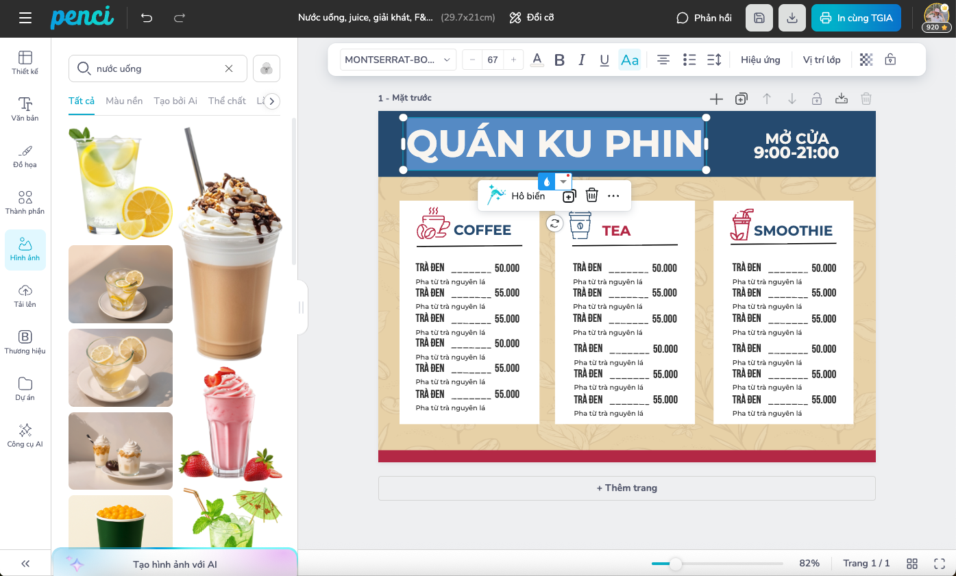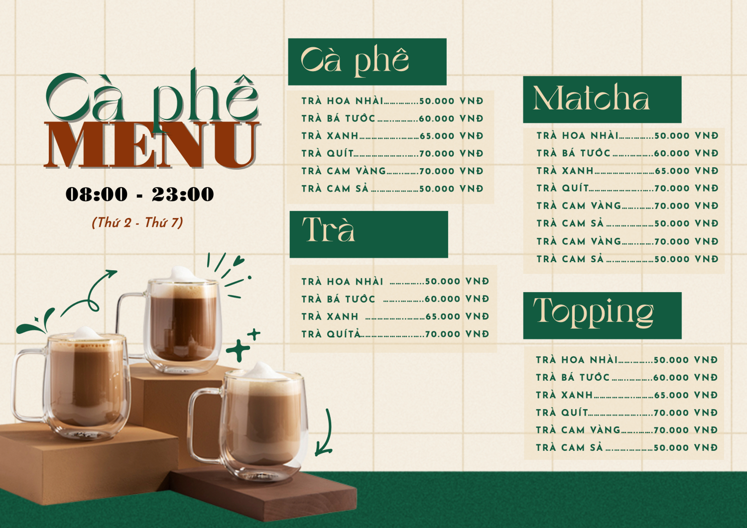 thieke thuvien 99+ mẫu Menu đẹp, miễn phí dành cho quán cafe, trà sữa dễ dàng chỉnh sửa online bằng công cụ Penci By admin | 24 tháng 03 năm 2026 42 đã đọc Menu không chỉ là bảng liệt kê đồ uống hay món ăn, mà còn là một phần quan trọng trong trải nghiệm của khách hàng khi đến quán. Một menu được thiết kế đẹp, rõ ràng và chuyên nghiệp sẽ giúp khách dễ chọn món, tăng thiện cảm với thương hiệu, đồng thời góp phần nâng cao doanh thu cho quán cafe hoặc trà sữa. Hiện nay, thay vì phải thuê thiết kế tốn kém, bạn hoàn toàn có thể tự thiết kế menu đẹp chỉ trong vài phút bằng các mẫu có sẵn. Với kho mẫu thiết kế menu miễn phí và công cụ chỉnh sửa online đơn giản, Penci giúp chủ quán dễ dàng tạo menu chuyên nghiệp mà không cần biết thiết kế. Trong bài viết này, hãy cùng tìm hiểu cách thiết kế menu thu hút khách và khám phá bộ sưu tập mẫu menu đẹp dành cho quán cafe, trà sữa đang được sử dụng nhiều hiện nay. 1. Menu như thế nào thì mới thu hút được khách hàng? Menu là một trong những yếu tố ảnh hưởng trực tiếp đến quyết định gọi món. Một menu được thiết kế tốt không chỉ giúp khách dễ đọc mà còn giúp quán thể hiện sự chuyên nghiệp và tạo ấn tượng ngay từ lần đầu. Dưới đây là một số nguyên tắc quan trọng khi thiết kế menu cho quán cafe, trà sữa. Menu dễ đọc sẽ giúp khách hàng "thoải mái" trong việc lựa chọn - Menu cần rõ ràng, dễ đọc: Khách hàng thường chỉ dành vài chục giây để xem menu, vì vậy nội dung cần được trình bày gọn gàng, dễ nhìn. Tên món, giá tiền và mô tả nên được sắp xếp logic, tránh quá nhiều chữ hoặc quá nhiều chi tiết gây rối mắt. - Sắp xếp món theo nhóm hợp lý: Việc phân loại theo nhóm như Cafe, Trà sữa, Trà trái cây, Đá xay, Topping,... sẽ giúp khách tìm món nhanh hơn. Một menu có bố cục rõ ràng luôn tạo cảm giác chuyên nghiệp hơn so với menu sắp xếp lộn xộn. - Làm nổi bật món bán chạy: Những món đặc trưng hoặc bán chạy nên được đặt ở vị trí dễ nhìn. Nhiều quán thường dùng ký hiệu, khung hoặc icon để đánh dấu món nổi bật, giúp khách dễ lựa chọn hơn. - Không nên để menu quá dài: Menu quá nhiều món có thể khiến khách khó chọn, đặc biệt với quán nhỏ. Thay vì liệt kê tất cả, nên chọn những món chính và dễ bán nhất để đưa vào menu. - Hình ảnh và bố cục cần đồng bộ với thương hiệu: Menu cũng là một phần nhận diện thương hiệu. Quán cafe dành cho giới trẻ sẽ có menu khác với quán cafe truyền thống, và quán trà sữa cũng sẽ có phong cách trình bày riêng. Một menu được thiết kế đồng bộ với logo, banner và poster sẽ giúp quán trông chuyên nghiệp hơn rất nhiều. 2. Tổng hợp mẫu Menu đẹp, miễn phí dành cho quán cafe, trà sữa Dưới đây là một số mẫu menu đang được sử dụng phổ biến cho quán cafe, trà sữa, quán nước mang đi và cửa hàng đồ uống. Các mẫu đều có bố cục sẵn, dễ chỉnh sửa và phù hợp in ấn hoặc dùng online. Menu quán cafe đơn giản dễ đọc Menu trà sữa nhiều món rõ ràng Menu đồ uống treo tường cho quán Menu cafe in bảng đứng Menu trà sữa khổ A4 dễ dàng in ấn Menu quán nước mang đi Menu đồ uống cho quán nhỏ Menu cafe giá rẻ dễ chỉnh sửa Menu trà sữa có topping Menu quán cafe chuyên nghiệp >> Xem thêm: Mẫu thiết kế menu, thực đơn đơn giản dành cho quán cà phê, trà sữa Kho thư viện menu của Penci được thiết kế sẵn với nhiều kích thước khác nhau như menu dạng bảng ngang, menu bảng lớn dọc, menu để bàn,... phù hợp cho nhiều loại hình quán từ cafe, trà sữa đến nhà hàng, quán ăn. Tất cả mẫu đều có thể chỉnh sửa trực tiếp trên trình duyệt, thay đổi nội dung, giá tiền, hình ảnh hoặc logo chỉ bằng thao tác kéo thả. Người không biết thiết kế vẫn có thể tự thiết kế menu online đẹp trong vài phút mà không cần cài phần mềm. 3. Cách chỉnh sửa menu bằng công cụ Penci Penci là công cụ thiết kế online miễn phí dành cho người Việt, được phát triển để giúp người dùng dễ dàng tạo các ấn phẩm như menu, poster, banner, tờ rơi, thiệp mời,... mà không cần kinh nghiệm thiết kế. Giao diện thiết kế của Penci được tối giản để ai cũng có thể sử dụng. Khi mở một mẫu menu, bạn sẽ thấy các thành phần đã được sắp xếp sẵn như tiêu đề, danh sách món, giá tiền, hình minh họa. Bạn chỉ cần nhấp vào nội dung để sửa chữ, thay đổi font, chỉnh kích thước hoặc thêm món mới. Giao diện thiết kế online của Penci Một số thao tác cơ bản khi chỉnh sửa menu trên Penci: - Thay tên quán và logo - Chỉnh danh sách đồ uống - Sửa giá tiền - Thêm hoặc xóa món - Thay hình minh họa - Xuất file để in hoặc đăng online Nhờ cách thiết kế kéo thả đơn giản, việc tạo menu mới hoặc cập nhật menu cũ chỉ mất vài phút, rất phù hợp với quán cafe, trà sữa, quán ăn nhỏ hoặc cửa hàng mới mở. >> Xem thêm: Hướng dẫn tự thiết kế menu bằng công cụ Penci Tóm lại Một menu đẹp không chỉ giúp khách dễ chọn mó