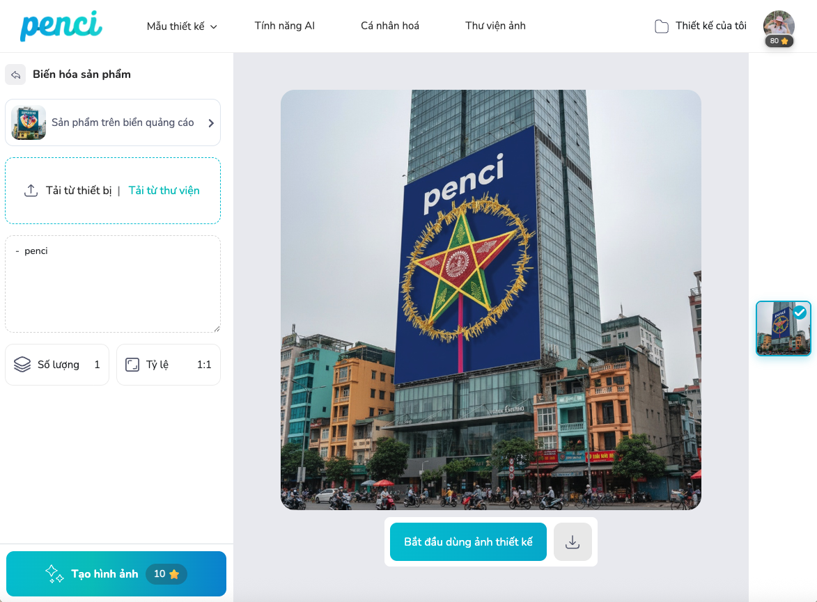thieke thuvien AI tạo hình ảnh quảng cáo sản phẩm giúp tăng doanh số bán hàng By admin | 18 tháng 09 năm 2025 195 đã đọc Khám phá AI tạo hình ảnh quảng cáo sản phẩm ngay trên Penci - công cụ thiết kế online miễn phí dành cho người Việt. Chỉ với vài thao tác đơn giản, bạn có thể biến ảnh sản phẩm thành những bức hình ấn tượng, sáng tạo và chuyên nghiệp. Từ hiệu ứng ánh sáng, bối cảnh thiên nhiên đến mô phỏng billboard hoành tráng, AI tạo hình ảnh của Penci giúp shop online, startup và doanh nghiệp tăng doanh số bán hàng hiệu quả. 1. Giới thiệu tính năng tạo ảnh sản phẩm với AI của Penci Trong kinh doanh hiện nay, hình ảnh sản phẩm không chỉ dừng ở việc “chụp cho có”. Một bức ảnh đẹp, đúng ý đồ truyền thông có thể quyết định khách hàng có dừng lại xem hay lướt qua bạn trong 3 giây đầu tiên. Và thay vì phải tốn hàng triệu đồng cho một buổi chụp studio, giờ đây bạn đã có trợ thủ đắc lực ngay trên Penci - công cụ thiết kế trực tuyến miễn phí của người Việt. Giao diện trực quan, dễ dàng tạo ảnh với AI chỉ với một cú click Penci đã tích hợp AI tạo hình ảnh sản phẩm cực kỳ đơn giản và thân thiện. Điểm đặc biệt là hệ thống đã cài đặt sẵn prompt (câu lệnh mô tả hình ảnh) để người dùng không cần nhớ công thức phức tạp. Bạn chỉ cần: Tải ảnh sản phẩm lên. Chọn phong cách mong muốn từ thư viện. Nhập thêm mô tả tiếng Việt nếu có gợi ý. Bấm “Tạo ảnh” và chờ vài giây để nhận kết quả. Sự nhanh chóng và tiện lợi này giúp bạn tiết kiệm thời gian, chi phí và có ngay những bức ảnh độc đáo chỉ trong vài giây để sử dụng trong bán hàng, quảng cáo hoặc đăng mạng xã hội. 2. Ứng dụng AI tạo hình ảnh để tăng doanh số bán hàng Một trong những “vũ khí” quan trọng nhất của marketing chính là thị giác. Khách hàng không có nhiều kiên nhẫn đọc dài dòng, nhưng lại dễ bị thuyết phục bởi một hình ảnh ấn tượng. AI tạo hình ảnh quảng cáo sản phẩm giúp doanh nghiệp và shop nhỏ tận dụng điều đó để: Thu hút sự chú ý trên mạng xã hội: Một bức ảnh sản phẩm kèm hiệu ứng độc đáo dễ dàng khiến người dùng dừng lướt và nhấn “xem thêm”. Truyền tải giá trị sản phẩm: Hình ảnh sáng tạo không chỉ đẹp mắt mà còn kể được câu chuyện, gợi ra cảm xúc. Ví dụ, một chai nước khoáng xuất hiện cùng hiệu ứng bắn nước mạnh mẽ sẽ gợi cảm giác mát lạnh, năng động. Tiết kiệm chi phí quảng cáo: Thay vì đầu tư hàng chục triệu cho một chiến dịch chụp hình, AI giúp bạn tạo ra nhiều phiên bản ảnh khác nhau chỉ trong vài cú nhấp chuột. Tăng tỷ lệ chuyển đổi: Nghiên cứu cho thấy, sản phẩm được hiển thị trong bối cảnh phù hợp sẽ khiến khách hàng dễ hình dung giá trị và nhanh đi đến quyết định mua hàng. Nói cách khác, AI tạo hình ảnh được tích hợp trên Penci không chỉ là giúp bạn có thêm ý tưởng thiết kế mà còn là “trợ lý bán hàng” giúp bạn chốt đơn hiệu quả hơn. Hình ảnh được tạo bởi AI của Penci với câu lệnh được cài đặt sẵn 3. Một số tính năng tạo ảnh sản phẩm nổi bật mà không cần nhập prompt của Penci AI tạo hình ảnh quảng cáo sản phẩm của Penci mang đến nhiều lựa chọn phong cách, từ tinh tế đến sáng tạo phá cách, để phù hợp với từng loại sản phẩm và chiến dịch truyền thông: Chụp cùng mẫu ảnh: AI cho phép sản phẩm của bạn “chụp” cùng mẫu người thật. Rất lý tưởng cho phụ kiện, mỹ phẩm hoặc những sản phẩm muốn gắn liền với phong cách cá nhân sang chảnh trên mạng xã hội. 👉 Thử ngay tính năng tạo ảnh với AI phong cách Chụp cùng mẫu ảnh Thiên nhiên huyền ảo: Biến sản phẩm trở nên khổng lồ giữa núi rừng, biển cả hay bầu trời bao la. Phong cách hoành tráng, thích hợp cho quảng cáo sáng tạo và chiến dịch viral. 👉 Thử ngay tính năng tạo ảnh với AI phong cách Thiên nhiên huyền ảo Hiệu ứng bắn nước: Thêm chi tiết bắn nước cực sinh động. Rất hợp với sản phẩm thể thao, nước uống, poster sự kiện, mang lại cảm giác năng lượng bùng nổ. 👉 Thử ngay tính năng tạo ảnh với AI phong cách Hiệu ứng bắn nước Chụp sản phẩm tinh tế: AI tái hiện ánh sáng đẹp, bố cục chuyên nghiệp như studio. Shop online, startup hay thương hiệu nhỏ sẽ tiết kiệm chi phí chụp hình mà vẫn có ảnh chuẩn mực. 👉 Thử ngay tính năng tạo ảnh với AI phong cách Chụp sản phẩm tinh tế Vươn tới bầu trời: Tạo ảnh sản phẩm trên nền trời rộng lớn, mang cảm giác tự do, khát vọng. Rất phù hợp với poster truyền cảm hứng hoặc chiến dịch định vị thương hiệu. 👉 Thử ngay tính năng tạo ảnh với AI phong cách Vươn tới bầu trời Thay đổi phông nền: AI tự động thêm tiền cảnh, đạo cụ liên quan để sản phẩm nổi bật, tự nhiên và giàu tính thương mại. 👉 Thử ngay tính năng tạo ảnh với AI phong cách Thay đổi phông nền Sức mạnh ánh sáng: Hiệu ứng ánh sáng từ mặt trời, neon hay ánh