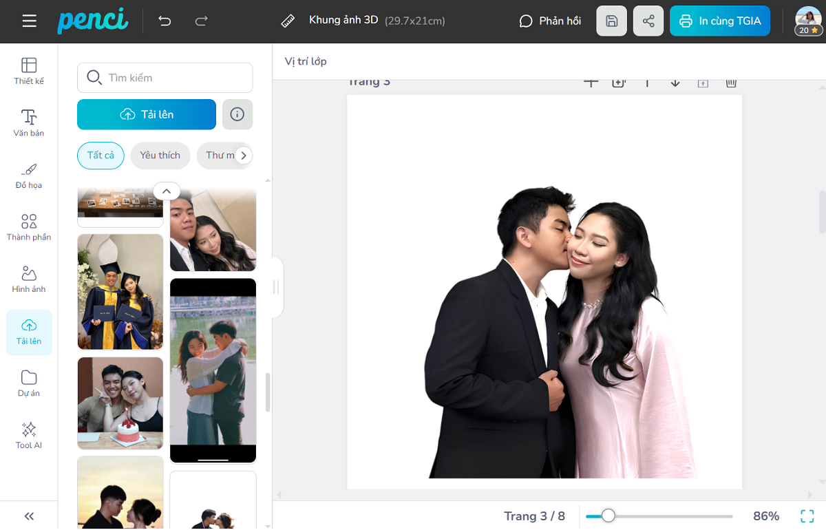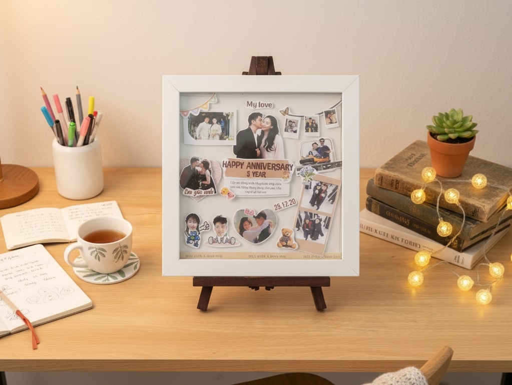thieke thuvien Cách làm khung ảnh 3D handmade bằng ảnh in theo yêu cầu cực kỳ đơn giản, hướng dẫn chi tiết By admin | 24 tháng 10 năm 2025 12 đã đọc Bạn có bao giờ muốn lưu giữ những khoảnh khắc đặc biệt của mình theo cách thật độc đáo và ý nghĩa? Một khung ảnh 3D handmade sẽ giúp bạn làm điều đó, đây vừa là món quà tặng handmade tinh tế, vừa là vật trang trí khiến không gian thêm ấm áp. Hãy cùng Penci khám phá cách làm khung ảnh 3D handmade bằng ảnh in theo yêu cầu cực kỳ đơn giản, ai cũng có thể thực hiện được ngay tại nhà! >> Xem thêm các ý tưởng quà tặng handmade dễ làm, độc đáo, ấn tượng 1. Khung ảnh 3D là gì? Tại sao khung ảnh 3D luôn là quà tặng handmade được ưa chuộng nhất Khung ảnh 3D handmade là dạng khung hình handmade được làm thủ công bằng tay với nhiều lớp ảnh đen xen, tạo chiều sâu và hiệu ứng nổi giúp bức ảnh trở nên sống động hơn. Loại khung ảnh 3D đơn giản này thường được dùng để làm quà handmade tặng người yêu, bạn bè, vật lưu giữ ký ức hay trang trí nhà cửa. Khung ảnh 3D handmade bằng ảnh in theo yêu cầu độc đáo và ý nghĩa Tại sao bạn nên tặng khung ảnh 3D làm quà tặng handmade cho người yêu? - Thể hiện công sức và tâm huyết qua từng chi tiết thủ công khiến người nhận luôn cảm nhận được tình cảm chân thành. Đây là lý do nó hoàn hảo để làm quà handmade tặng người yêu. - Quà tặng handmade ý nghĩa dành cho gia đình, người yêu, bạn bè cho mọi dịp đều ý nghĩa - Sáng tạo không giới hạn với khả năng phối màu, thêm chi tiết và chọn phong cách riêng cho từng khung. - Mang dấu ấn cá nhân khi mỗi sản phẩm là bản độc nhất thể hiện rõ “chất riêng” của người làm. >> Tham khảo ý tưởng quà tặng handmade từ ảnh cực kỳ độc đáo 2. Cách làm khung ảnh 3D handmade đẹp đơn giản tại nhà Làm handmade khung ảnh 3D có khó không? Nếu bạn nghĩ rằng cách làm khung ảnh handmade phức tạp, hãy để Penci chứng minh điều ngược lại. Chỉ với vài dụng cụ cơ bản và những ảnh in theo yêu cầu, bạn hoàn toàn có thể tự làm khung ảnh 3D handmade đẹp mắt và ý nghĩa ngay tại nhà. 2.1 Dụng cụ cần chuẩn bị - 1 khung ảnh trống (kích thước tuỳ chọn như 20x20cm, 20x25cm, 30x40cm, 35x50cm,...) - Bìa cứng - Ảnh in theo yêu cầu - Keo dán, kéo - Phụ kiện trang trí khung ảnh handmade (nếu có): dây ruy băng, đèn led mini,... Dụng cụ cần chuẩn bị để tự làm khung ảnh 3D đơn giản tại nhà 2.2 Các bước thực hiện cách làm khung ảnh 3D handmade >> Tham khảo chi tiết ngay ở video này Bước 1: Lên ý tưởng và in ảnh theo yêu cầu Truy cập penci.vn, chọn “Cá nhân hóa” → “In ảnh” → kiểu ảnh Polaroid để bắt đầu tự thiết kế khung ảnh 3D handmade đơn giản theo phong cách riêng của bạn chỉ trong vài phút. Chọn mục “In ảnh” trong danh mục Cá nhân hóa để bắt đầu thiết kế khung ảnh 3D Để lên ý tưởng tạo khung ảnh handmade đẹp và dễ làm, bạn có thể thực hiện theo các bước sau: - Tải ảnh ý nghĩa: Chọn những bức ảnh đẹp liên quan đến chủ đề bạn chọn như ảnh gia đình, bạn bè, người yêu hoặc kỷ niệm du lịch - Sắp xếp bố cục và tạo viền nổi bật: Dùng công cụ phóng to, thu nhỏ, xoay và căn chỉnh để đặt ảnh vừa khung. Kết hợp tính năng “Tách nền” và tạo viền trắng để làm nổi bật chủ thể. - Trang trí sinh động: Tìm và thêm sticker hoặc chi tiết handmade tại mục “Đồ họa” như hoa, giấy, khung vintage, băng dính,...để tăng chiều sâu cho khung ảnh 3D. - Hoàn tất và đặt in ảnh theo yêu cầu: Khi đã hoàn thiện phần thiết kế, chỉ cần nhấn “In cùng TGIA” để đặt in trực tiếp tại Penci. Thiết kế và in ảnh polaroid theo yêu cầu để làm khung ảnh 3D *Mẹo nhỏ khi thiết kế hình in: - Tách và in riêng từng chi tiết (nhân vật, hoa, chữ...) để dễ cắt dán, xếp lớp tạo hiệu ứng nổi khối tự nhiên. - Giữ tỷ lệ ảnh và bố cục khung hài hòa để tổng thể không bị rối. Tách riêng từng chi tiết khi in để dễ cắt dán hơn Bước 2: Cắt hình và chuẩn bị khung 3D Khi nhận được ảnh in, dùng kéo cắt sát theo viền từng chi tiết. Cắt đều tay để các lớp ảnh khi ghép lại trông tự nhiên và nổi bật hơn. Cắt từng chi tiết ảnh in để tạo khung ảnh 3D handmade nổi khối Bước 3: Dán ảnh và tạo hiệu ứng 3D Để làm khung ảnh 3D trông nổi bật, bạn cần dán ảnh theo thứ tự sau: - Dán lớp nền trước (ảnh phong cảnh, background, họa tiết trang trí). - Dán ảnh trung tâm trước rồi đến các khối ảnh phụ bằng băng dính xốp 2 mặt để tạo hiệu ứng nổi khối. - Trang trí thêm các chi tiết nhỏ hơn như hoa, sticker, băng dính trang trí ở các lớp khác nhau để khung có chiều sâu. Cách dán băng dính xốp tạo hiệu ứng 3D cho khung ảnh handmade Bạn cũng có thể thêm dây đèn mini, hoa khô hoặc thiệp nhỏ để khung ảnh handmade thêm lung linh và cá tính, đặc biệt ý nghĩa khi làm quà handmade tặng người yêu. Bước 4: Hoàn thiện khung ảnh 3D handmade Sau khi dán xong, đặt phần ảnh hoàn thiện v