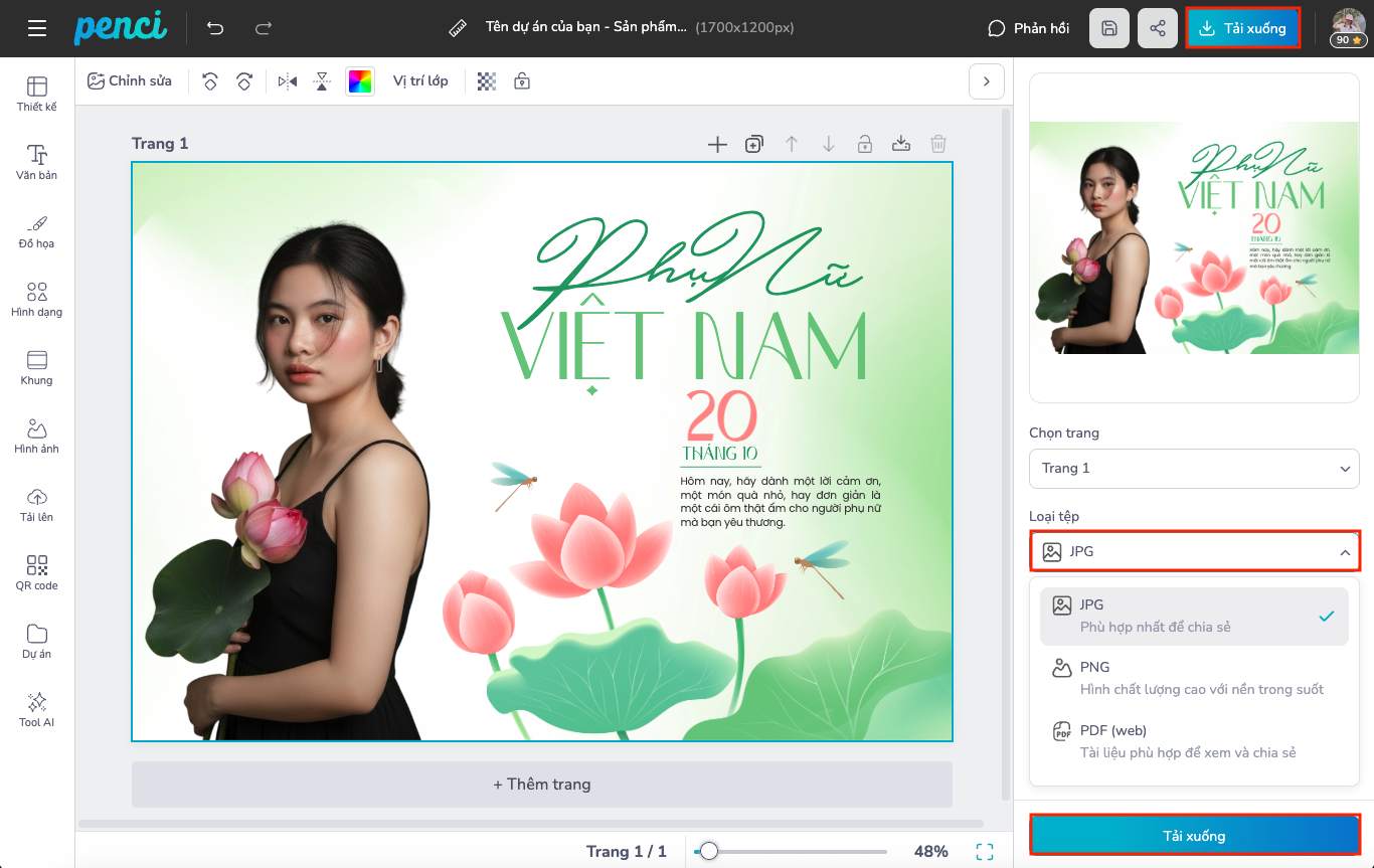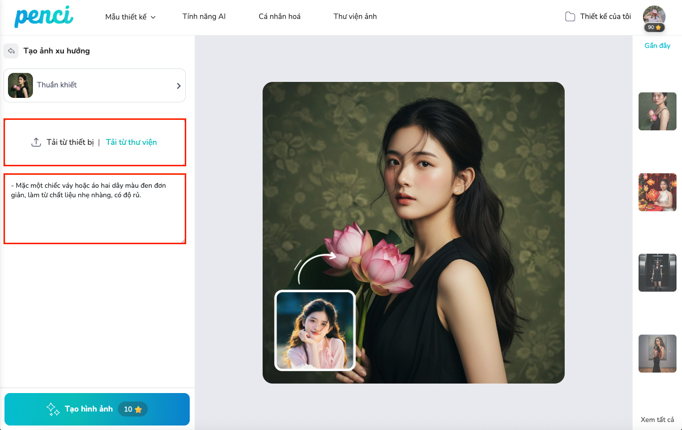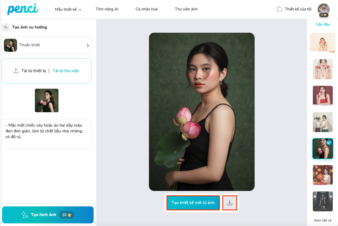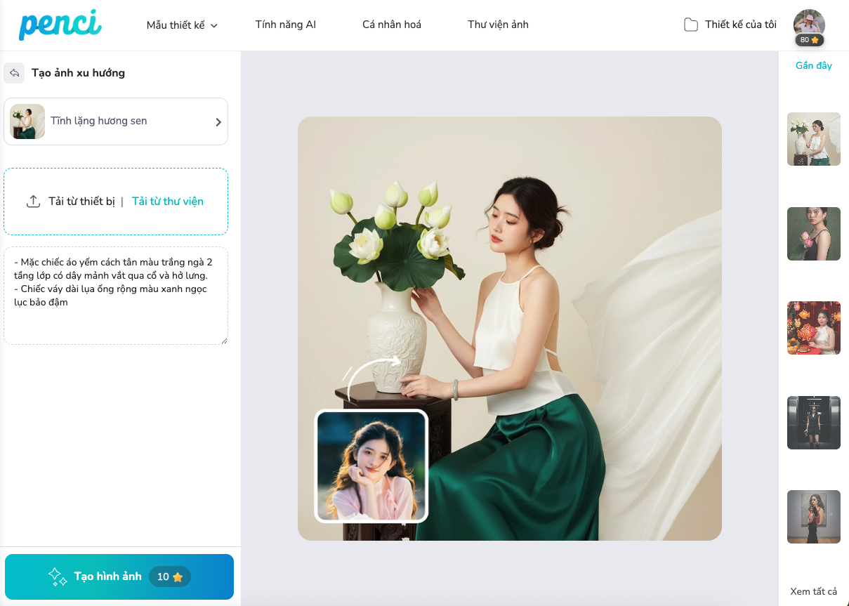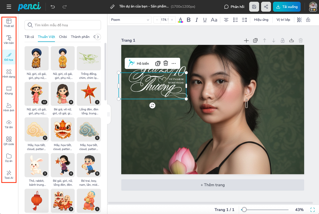 thieke thuvien Cách tạo hình ảnh, thiệp chúc mừng 20/10 chúc mừng đẹp, ý nghĩa nhất từ hình cá nhân bằng Penci AI By admin | 09 tháng 10 năm 2025 31 đã đọc Ngày Phụ nữ Việt Nam 20/10 luôn là dịp để gửi gắm yêu thương đến những người phụ nữ quanh ta từ mẹ, bà, chị đến bạn bè hay đồng nghiệp. Một lời chúc ý nghĩa luôn mang lại niềm vui, nhưng một hình ảnh được tạo riêng từ chính khuôn mặt của người nhận lại có sức lay động gấp nhiều lần. Nó không chỉ là tấm hình, mà là món quà tinh thần được cá nhân hoá vừa thân thuộc, vừa mới lạ, vừa chứa đựng cảm xúc thật. Nếu trước đây việc tạo ra những hình ảnh như vậy phải nhờ designer hoặc sử dụng công cụ AI phức tạp, thì nay bạn chỉ cần vài thao tác đơn giản trên Penci.vn - công cụ thiết kế của người Việt, thân thiện và dễ dùng. Tất cả quá trình, từ tạo ảnh đến thiết kế thiệp, đều diễn ra trên một nền tảng duy nhất, bằng tiếng Việt, và hoàn toàn miễn phí. Hãy cùng tìm hiểu chi tiết cách tạo hình ảnh 20/10 chúc mừng đẹp, ý nghĩa nhất từ hình cá nhân bằng Penci AI ngay dưới đây nhé. 1. Tạo hình ảnh 20/10 chúc mừng từ hình cá nhân bằng Penci AI 1.1 Truy cập vào Penci AI và chọn phong cách tạo ảnh Trước hết, bạn truy cập danh mục “Tính năng AI” của Penci. Đây chính là nơi bạn có thể biến ảnh thật của mình hoặc của người thân thành những khung hình nghệ thuật theo phong cách 20/10. Điểm khác biệt khi tạo hình ảnh 20/10 tại Penci AI là mọi concept tạo ảnh đều được Việt hoá từ bối cảnh, ánh sáng, đến màu sắc và cảm xúc. Khi chọn “phong cách tạo ảnh cho phụ nữ”, bạn sẽ thấy nhiều concept đã được cài sẵn câu lệnh (prompt) rất gợi cảm xúc, chẳng hạn như “Giữa cánh sen hoa”, “Thanh sắc sen hồng”, “Sắc hồng”, hay “Thuần khiết”. Đây đều là những bối cảnh được AI dựng nên với độ chi tiết cao, tôn lên vẻ đẹp của người phụ nữ Việt theo cách tinh tế và tự nhiên nhất. Truy cập vào giao diện Penci AI Chọn phong cách tạo ảnh AI cho phụ nữ [Xem thêm nhiều phong cách tạo hình ảnh 20/10 chúc mừng ngày Phụ nữ Việt Nam] 1.2 Tiến hành xử lý hình ảnh với AI Sau khi chọn được phong cách mong muốn, bạn chỉ cần tải lên một bức ảnh chân dung cá nhân của mình hoặc người nhận. Ảnh có thể là ảnh chụp bình thường bằng điện thoại, miễn là khuôn mặt rõ và đủ sáng. Hệ thống AI sẽ tự động nhận diện, giữ nguyên khuôn mặt thật và hoà vào khung cảnh concept mà bạn chọn. Nếu muốn đổi trang phục, bạn có thể nhập mô tả ngắn gọn vào ô “mô tả trang phục” ngay bên dưới. Ví dụ: “mặc áo dài đỏ truyền thống”, “mặc váy trắng cầm bó hoa hồng”, hay “mặc áo dài tím, đeo vòng ngọc trai”. Bạn không cần viết dài hay cầu kỳ vì Penci AI đã được tối ưu để hiểu ngôn ngữ tiếng Việt tự nhiên, nên chỉ vài từ là đủ. Tải ảnh lên và nhập mô tả bằng tiếng Việt để thay đổi trang phục nếu muốn 1.3 Bắt đầu tạo ảnh và nhận kết quả Sau khi hoàn tất, nhấn nút “Tạo ảnh” và chờ vài giây. Lúc này, AI sẽ xử lý và hiển thị kết quả. Điều thú vị là mỗi lần tạo, bạn sẽ nhận được vài phiên bản khác nhau, từ đó chọn tấm ưng ý nhất. Ảnh sau khi tạo có thể tải về ngay, hoặc chuyển tiếp sang chế độ “Tạo thiết kế mới từ ảnh” để biến nó thành hình ảnh hay thiệp chúc mừng hoàn chỉnh. Tạo ảnh và nhận kết quả trong vài giây [Xem thêm nhiều phong cách tạo hình ảnh 20/10 chúc mừng ngày Phụ nữ Việt Nam] 2. Cách tạo hình ảnh, thiệp chúc mừng 20/10 đẹp, ý nghĩa từ ảnh cá nhân bằng Penci AI 2.1 Đưa ảnh vào giao diện thiết kế trực quan của Penci Khi chọn "Tạo thiết kế mới từ ảnh" bảng tuỳ chỉnh kích thước thiết kế sẽ hiện ra cho bạn chọn lựa. Tại đây, bạn có thể chọn lại kích thước hiển thị sao cho phù hợp với mục đích sử dụng. Nếu muốn làm thiệp in giấy, kích thước A5 hoặc A6 là lựa chọn lý tưởng. Còn nếu bạn định đăng lên mạng xã hội, hãy chọn tỉ lệ vuông (1:1) cho bài đăng, hoặc dọc (4:5, 9:16) cho story và reel. Tuỳ chọn thông số kích thước thiết kế Khi đã có kích thước mong muốn, giờ là lúc biến nó thành thiệp chúc mừng xinh xắn, tinh tế. Ngay khi bấm nút “Bắt đầu thiết kế”, hệ thống sẽ mở trình thiết kế Penci, đây là nơi bạn có thể sáng tạo không giới hạn mà không cần biết gì về Photoshop hay Canva. Ảnh được đưa vào trình thiết kế online miễn phí Penci 2.2 Tùy chỉnh thiết kế theo ý thích Tại giao diện thiết kế, bạn có thể trang trí hình ảnh, thiệp bằng những chi tiết nhỏ xinh trong thư viện của Penci. Thanh công cụ bên trái cho phép thêm họa tiết hoa, trái tim, nơ, khung viền hay bất kỳ yếu tố nào bạn thích. Bên cạnh đó, bạn cũng có thể thêm văn bản lời chúc, chẳng hạn “Chúc mừng ngày Phụ nữ Việt Nam 20/10”, “Dành tặng người phụ nữ tuyệt vời nhất”, hay “Cảm ơn mẹ vì đã luô