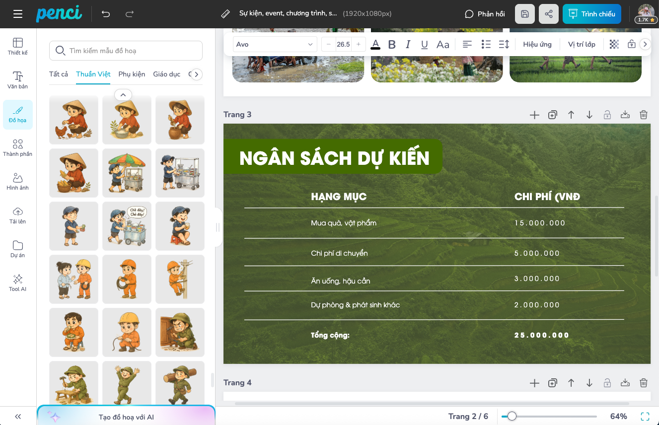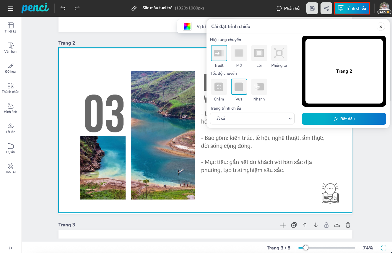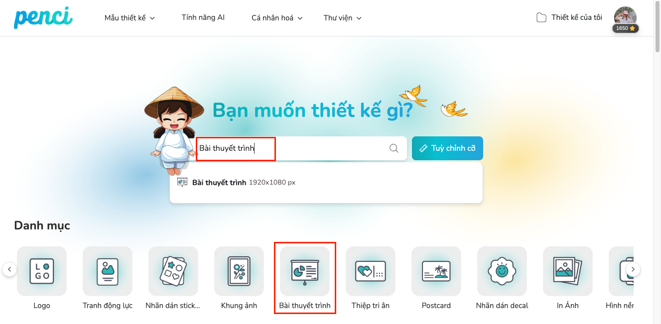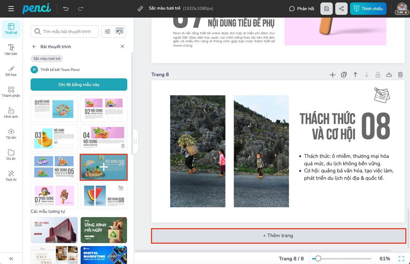 thieke thuvien Cách tạo slide thuyết trình online đẹp cho người mới bắt đầu bằng công cụ Penci By admin | 05 tháng 12 năm 2025 186 đã đọc Bạn đang tìm cách tạo slide thuyết trình online dễ dùng, nhanh, đẹp và phù hợp cho người mới bắt đầu. Bài viết này sẽ hướng dẫn bạn tạo bài thuyết trình đầy đủ chỉ trong vài phút bằng công cụ Penci. Với mẫu thiết kế miễn phí, font Việt hóa, kho đồ họa độc quyền và công cụ AI hỗ trợ, Penci giúp bạn làm slide chuyên nghiệp hơn mà không tốn chi phí. >> Thư viện mẫu thiết kế slide, bài thuyết trình miễn phí, dễ dàng tuỳ chỉnh online 1. Slide thuyết trình được tạo trên Penci có gì khác biệt Tạo slide thuyết trình tưởng dễ nhưng khi bắt tay vào thực hiện mới nhận ra có vô số khó khăn. Đặc biệt là đối với người mới, việc làm quen phần mềm hoặc phải mua template đẹp thực sự là rào cản. Vì vậy, Penci ra đời để đơn giản hóa quá trình này và mang đến trải nghiệm thiết kế thuần Việt, thân thiện và tiết kiệm chi phí. Tạo slide thuyết trình trên Penci nhanh chóng, đẹp và đầy sáng tạo So sánh với công cụ tạo slide truyền thống như PowerPoint Khi thiết kế slide bằng phần mềm truyền thống, bạn phải chuẩn bị khá nhiều kỹ năng. Thông thường, người mới bắt đầu cần dành một khoảng thời gian đáng kể để làm quen với giao diện và thao tác. Để tạo được một bài thuyết trình đẹp, bạn cần hiểu về bố cục, phối màu, thêm hình khối và biết cách xử lý các lỗi gián đoạn khi chỉnh sửa. Hoặc sử dụng những template có sẵn, nhưng những bộ template này lại đa phần theo phong cách nước ngoài nên khó thể hiện được bản sắc Việt Nam hoặc phù hợp với từng chủ đề trong nước. Một điểm hạn chế khác là khi muốn sử dụng các mẫu thiết kế đẹp và chuyên nghiệp, người dùng thường phải mua template từ bên ngoài. Điều này tiềm ẩn rủi ro vì khó kiểm chứng nguồn gốc và chất lượng, thậm chí có trường hợp mua phải mẫu kém uy tín. Penci khắc phục hoàn toàn những hạn chế này. Bạn không cần phải cài đặt phần mềm, không phải học quá nhiều kỹ năng phức tạp và cũng không phải bỏ tiền để mua template. Toàn bộ kho mẫu thuyết trình trên Penci đều miễn phí, dễ chỉnh sửa và thân thiện cho người mới bắt đầu. >> Tạo slide, bài thuyết trình miễn phí, trình chiếu online So sánh với các công cụ tạo slide thuyết trình online khác Có nhiều nền tảng thiết kế online tuy tiện lợi nhưng lại có nhược điểm lớn khi dùng tiếng Việt. Vì sử dụng font không được Việt hóa đầy đủ, chữ dễ bị lỗi hoặc hiển thị sai ký tự. Điều này khiến bài thuyết trình trở nên thiếu chuyên nghiệp. Ngoài ra, đa phần các nền tảng này sử dụng đồ họa theo phong cách quốc tế, nên khi áp dụng vào bối cảnh Việt Nam sẽ thiếu sự gần gũi. Penci sở hữu bộ font Việt hóa hoàn chỉnh, hiển thị trọn vẹn và không xảy ra lỗi. Kho đồ họa và các thành phần trang trí hoàn toàn thuần Việt, được chính đội họa sĩ Penci vẽ tay tỉ mỉ. Bạn có thể tìm thấy những chi tiết mang nét đặc trưng Việt Nam như hình ảnh nhà cửa, đường phố, chợ truyền thống, xe máy, hàng quán, nhân vật Việt Nam, món ăn và văn hóa bản địa. Penci cũng tích hợp kho mockup mang đậm dấu ấn Việt Nam, phù hợp với nhiều chủ đề từ học thuật đến kinh doanh. Điều này giúp bài thuyết trình của bạn trở nên sinh động, gần gũi và mang bản sắc riêng mà không một công cụ quốc tế nào có được. Tóm lại, Penci là công cụ phù hợp để bạn tạo slide thuyết trình nhanh, đẹp và chuẩn phong cách người Việt. Mọi tính năng đều miễn phí, phù hợp cho sinh viên, giáo viên và cả người đi làm. Đặc biệt, Penci mang đến tính bản địa hóa mà không công cụ nào khác có thể thay thế. 2. Cách tạo slide thuyết trình online trên Penci chi tiết nhất cho người mới bắt đầu Thiết kế slide không chỉ đơn giản là ghép chữ và hình lại với nhau. Để bài thuyết trình hiệu quả, bạn cần chuẩn bị trước nội dung, xác định mục tiêu trình bày và có kế hoạch cho từng phần của bài. Khi đã có nội dung rõ ràng, việc thiết kế slide thuyết trình trên Penci sẽ trở nên nhanh chóng và mạch lạc. Bước 1. Truy cập thư viện mẫu thiết kế “Bài thuyết trình” Bạn chỉ cần mở Penci và tìm đến thư mục Thư viện mẫu thiết kế Bài thuyết trình. Tại đây có hàng trăm mẫu được thiết kế sẵn theo từng chủ đề. Các mẫu đều miễn phí và tối ưu cho người mới. Truy cập "Thư viện mẫu thiết kế Bài thuyết trình" Bước 2. Chọn bố cục slide phù hợp Tùy nội dung và phong cách bài thuyết trình, bạn chọn mẫu có bố cục phù hợp. Nếu bạn cần trình bày số liệu, nên chọn mẫu có nhiều chỗ cho biểu đồ. Nếu bạn kể câu chuyện hoặc giới thiệu dự án sáng tạo, nên chọn mẫu có bố cục hình ảnh lớn. Tất cả đều có sẵn trong thư viện Penci, giúp bạn tiết kiệm thời gian mà vẫn giữ được tính chuyên ngh