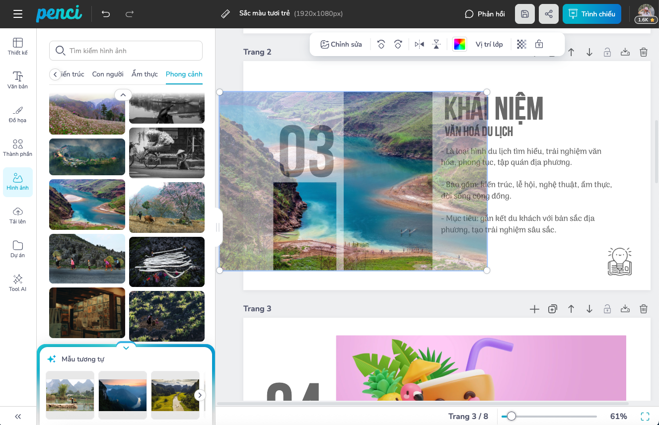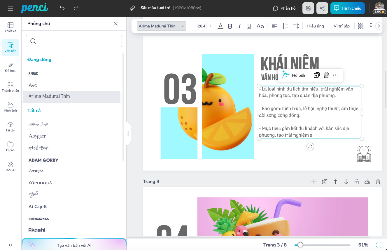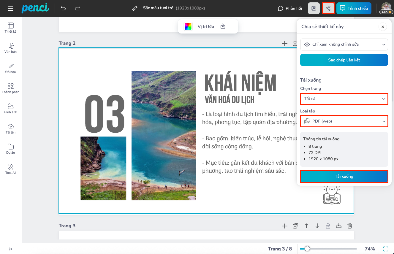 thieke thuvien Cách tạo slide thuyết trình online đẹp cho người mới bắt đầu bằng công cụ Penci By admin | 05 tháng 12 năm 2025 186 đã đọc Bạn đang tìm cách tạo slide thuyết trình online dễ dùng, nhanh, đẹp và phù hợp cho người mới bắt đầu. Bài viết này sẽ hướng dẫn bạn tạo bài thuyết trình đầy đủ chỉ trong vài phút bằng công cụ Penci. Với mẫu thiết kế miễn phí, font Việt hóa, kho đồ họa độc quyền và công cụ AI hỗ trợ, Penci giúp bạn làm slide chuyên nghiệp hơn mà không tốn chi phí. >> Thư viện mẫu thiết kế slide, bài thuyết trình miễn phí, dễ dàng tuỳ chỉnh online 1. Slide thuyết trình được tạo trên Penci có gì khác biệt Tạo slide thuyết trình tưởng dễ nhưng khi bắt tay vào thực hiện mới nhận ra có vô số khó khăn. Đặc biệt là đối với người mới, việc làm quen phần mềm hoặc phải mua template đẹp thực sự là rào cản. Vì vậy, Penci ra đời để đơn giản hóa quá trình này và mang đến trải nghiệm thiết kế thuần Việt, thân thiện và tiết kiệm chi phí. Tạo slide thuyết trình trên Penci nhanh chóng, đẹp và đầy sáng tạo So sánh với công cụ tạo slide truyền thống như PowerPoint Khi thiết kế slide bằng phần mềm truyền thống, bạn phải chuẩn bị khá nhiều kỹ năng. Thông thường, người mới bắt đầu cần dành một khoảng thời gian đáng kể để làm quen với giao diện và thao tác. Để tạo được một bài thuyết trình đẹp, bạn cần hiểu về bố cục, phối màu, thêm hình khối và biết cách xử lý các lỗi gián đoạn khi chỉnh sửa. Hoặc sử dụng những template có sẵn, nhưng những bộ template này lại đa phần theo phong cách nước ngoài nên khó thể hiện được bản sắc Việt Nam hoặc phù hợp với từng chủ đề trong nước. Một điểm hạn chế khác là khi muốn sử dụng các mẫu thiết kế đẹp và chuyên nghiệp, người dùng thường phải mua template từ bên ngoài. Điều này tiềm ẩn rủi ro vì khó kiểm chứng nguồn gốc và chất lượng, thậm chí có trường hợp mua phải mẫu kém uy tín. Penci khắc phục hoàn toàn những hạn chế này. Bạn không cần phải cài đặt phần mềm, không phải học quá nhiều kỹ năng phức tạp và cũng không phải bỏ tiền để mua template. Toàn bộ kho mẫu thuyết trình trên Penci đều miễn phí, dễ chỉnh sửa và thân thiện cho người mới bắt đầu. >> Tạo slide, bài thuyết trình miễn phí, trình chiếu online So sánh với các công cụ tạo slide thuyết trình online khác Có nhiều nền tảng thiết kế online tuy tiện lợi nhưng lại có nhược điểm lớn khi dùng tiếng Việt. Vì sử dụng font không được Việt hóa đầy đủ, chữ dễ bị lỗi hoặc hiển thị sai ký tự. Điều này khiến bài thuyết trình trở nên thiếu chuyên nghiệp. Ngoài ra, đa phần các nền tảng này sử dụng đồ họa theo phong cách quốc tế, nên khi áp dụng vào bối cảnh Việt Nam sẽ thiếu sự gần gũi. Penci sở hữu bộ font Việt hóa hoàn chỉnh, hiển thị trọn vẹn và không xảy ra lỗi. Kho đồ họa và các thành phần trang trí hoàn toàn thuần Việt, được chính đội họa sĩ Penci vẽ tay tỉ mỉ. Bạn có thể tìm thấy những chi tiết mang nét đặc trưng Việt Nam như hình ảnh nhà cửa, đường phố, chợ truyền thống, xe máy, hàng quán, nhân vật Việt Nam, món ăn và văn hóa bản địa. Penci cũng tích hợp kho mockup mang đậm dấu ấn Việt Nam, phù hợp với nhiều chủ đề từ học thuật đến kinh doanh. Điều này giúp bài thuyết trình của bạn trở nên sinh động, gần gũi và mang bản sắc riêng mà không một công cụ quốc tế nào có được. Tóm lại, Penci là công cụ phù hợp để bạn tạo slide thuyết trình nhanh, đẹp và chuẩn phong cách người Việt. Mọi tính năng đều miễn phí, phù hợp cho sinh viên, giáo viên và cả người đi làm. Đặc biệt, Penci mang đến tính bản địa hóa mà không công cụ nào khác có thể thay thế. 2. Cách tạo slide thuyết trình online trên Penci chi tiết nhất cho người mới bắt đầu Thiết kế slide không chỉ đơn giản là ghép chữ và hình lại với nhau. Để bài thuyết trình hiệu quả, bạn cần chuẩn bị trước nội dung, xác định mục tiêu trình bày và có kế hoạch cho từng phần của bài. Khi đã có nội dung rõ ràng, việc thiết kế slide thuyết trình trên Penci sẽ trở nên nhanh chóng và mạch lạc. Bước 1. Truy cập thư viện mẫu thiết kế “Bài thuyết trình” Bạn chỉ cần mở Penci và tìm đến thư mục Thư viện mẫu thiết kế Bài thuyết trình. Tại đây có hàng trăm mẫu được thiết kế sẵn theo từng chủ đề. Các mẫu đều miễn phí và tối ưu cho người mới. Truy cập "Thư viện mẫu thiết kế Bài thuyết trình" Bước 2. Chọn bố cục slide phù hợp Tùy nội dung và phong cách bài thuyết trình, bạn chọn mẫu có bố cục phù hợp. Nếu bạn cần trình bày số liệu, nên chọn mẫu có nhiều chỗ cho biểu đồ. Nếu bạn kể câu chuyện hoặc giới thiệu dự án sáng tạo, nên chọn mẫu có bố cục hình ảnh lớn. Tất cả đều có sẵn trong thư viện Penci, giúp bạn tiết kiệm thời gian mà vẫn giữ được tính chuyên ngh