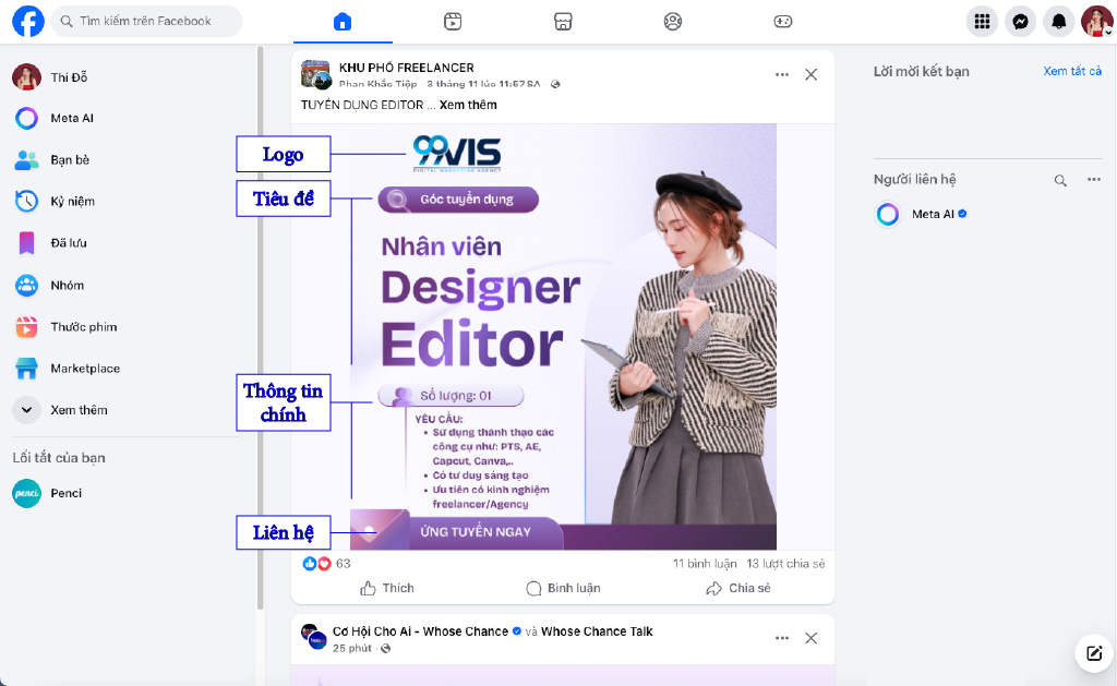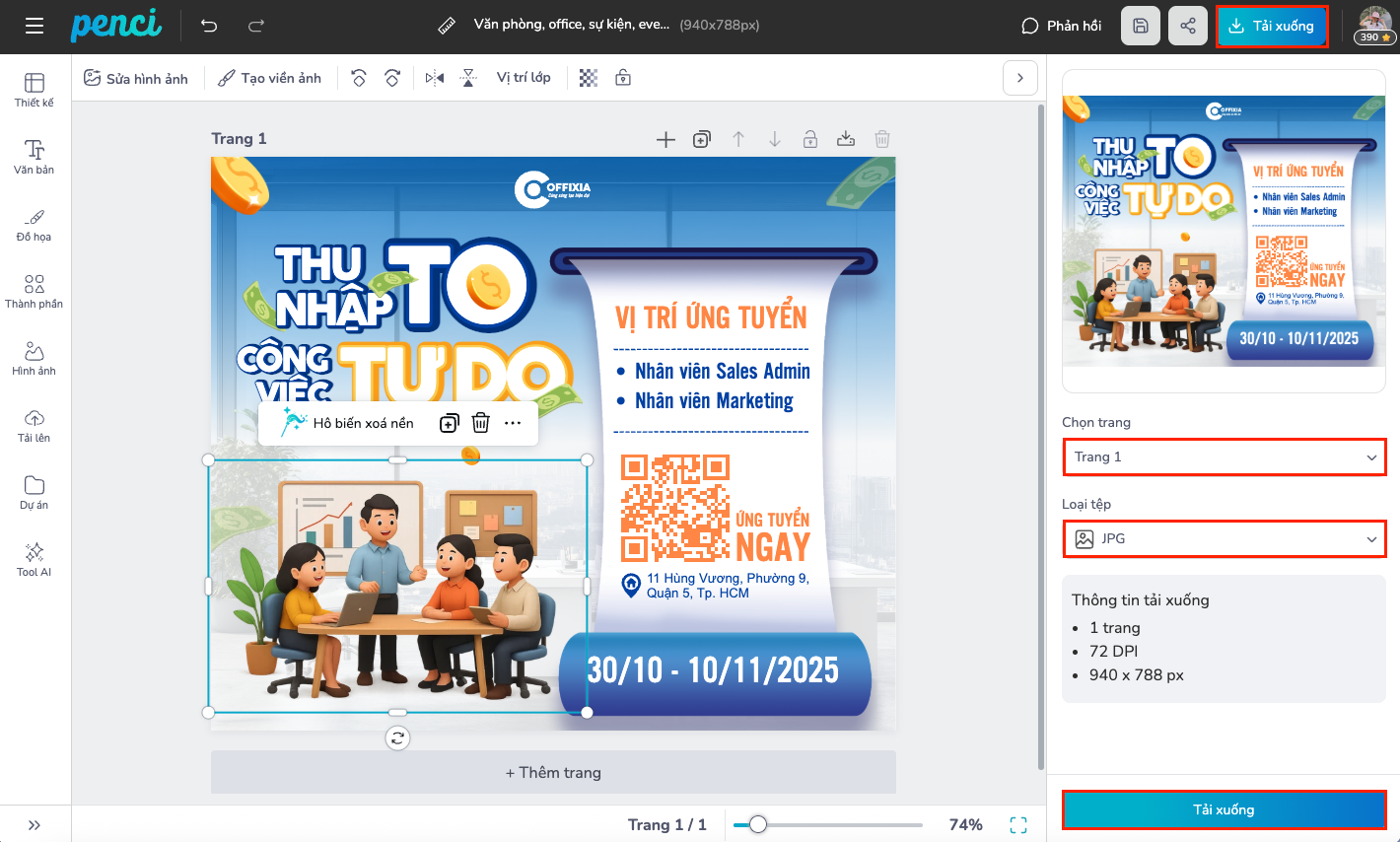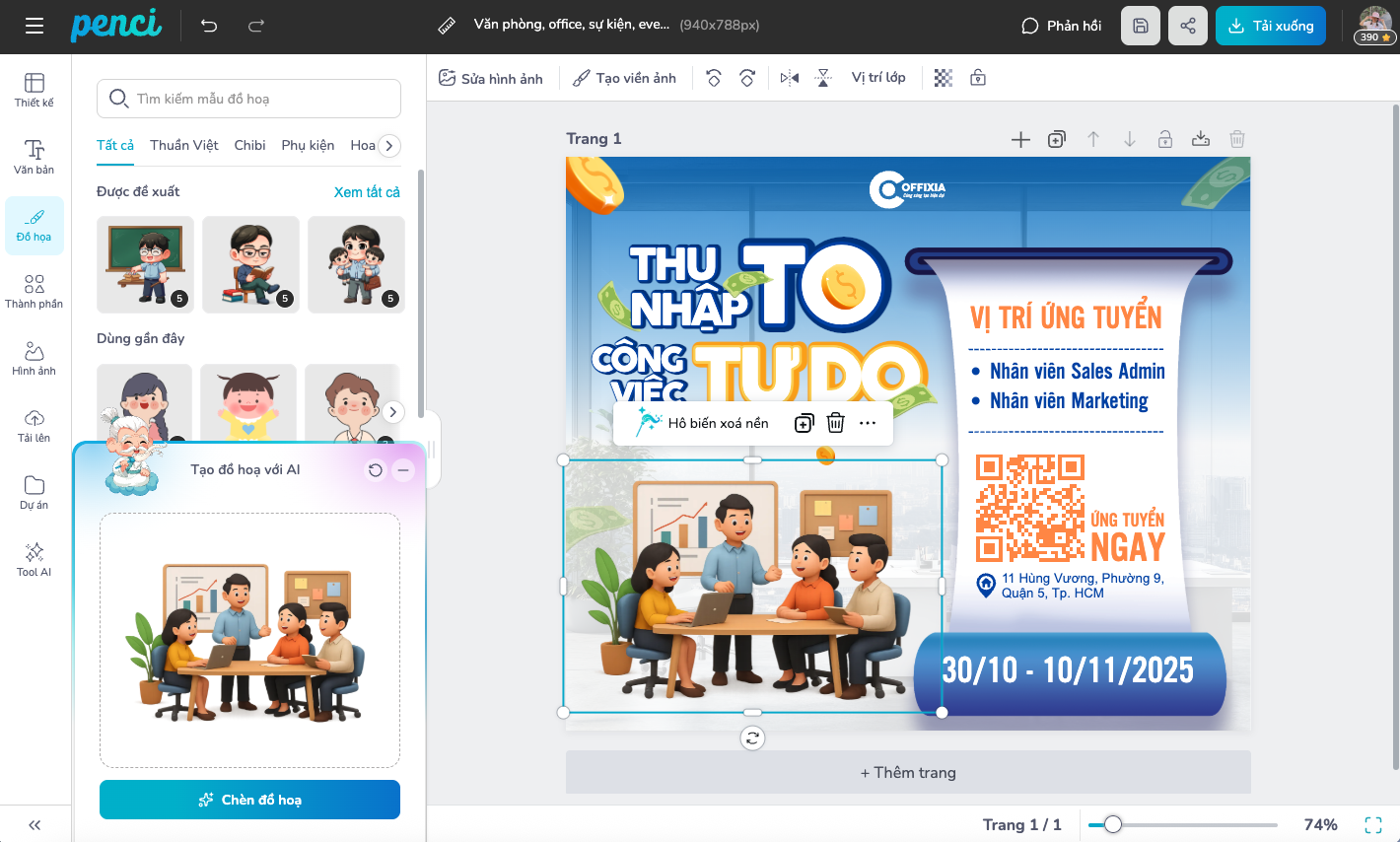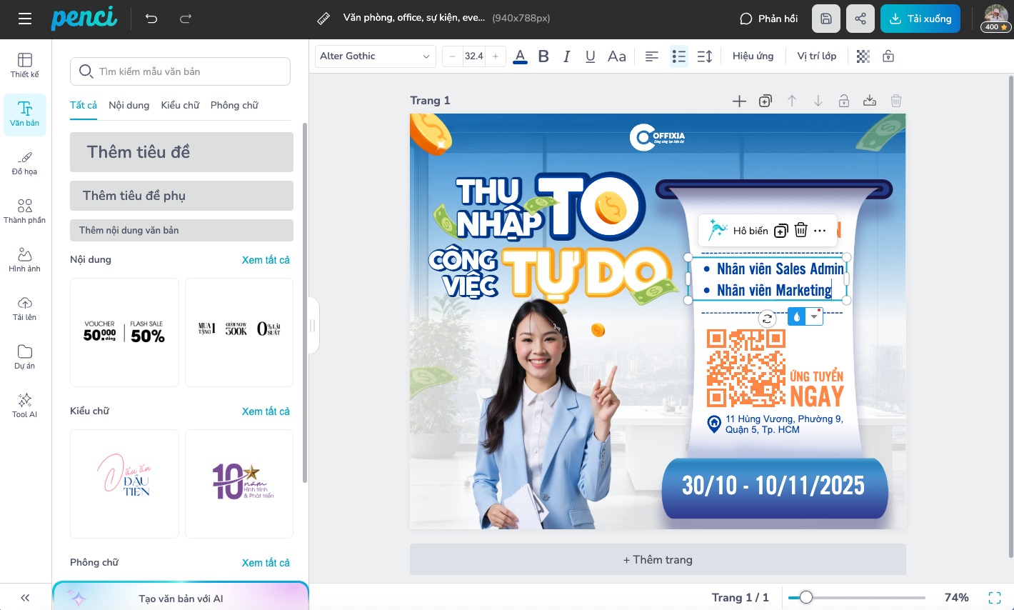 thieke thuvien Cách thiết kế banner tuyển dụng online đẹp bằng Penci, gây ấn tượng mạnh cho ứng viên By admin | 05 tháng 11 năm 2025 624 đã đọc Trong kỷ nguyên số, banner tuyển dụng online không chỉ đơn thuần là một tấm hình thông báo “Cần tuyển nhân viên”, mà là bộ mặt thương hiệu tuyển dụng của doanh nghiệp. Một banner được thiết kế tốt có thể khiến ứng viên dừng lại vài giây, đọc nội dung, rồi bấm “Ứng tuyển ngay” thay vì lướt qua như hàng trăm tin khác. Nếu bạn đang muốn tạo banner tuyển dụng đẹp, nhanh và chuẩn thương hiệu, công cụ Penci sẽ giúp bạn làm điều đó chỉ trong vài phút, ngay trên trình duyệt mà không cần Photoshop, không phải dân thiết kế vẫn làm được. 1. Vì sao cần thiết kế banner tuyển dụng? Tin tuyển dụng tràn lan trên mạng xã hội Giữa “rừng” tin tuyển dụng trên Facebook, LinkedIn hay Zalo, điều đầu tiên khiến ứng viên chú ý không phải mức lương, mà là hình ảnh và cách doanh nghiệp truyền tải thông điệp. Một banner chỉn chu thể hiện rằng: “Công ty này làm việc nghiêm túc, chuyên nghiệp và đáng tin cậy.” Dưới đây là 3 lý do vì sao việc đầu tư thiết kế banner tuyển dụng là điều nên làm: 👉 Tăng độ tin cậy của thương hiệu tuyển dụng: Một hình ảnh chuyên nghiệp tạo cảm giác doanh nghiệp có quy trình rõ ràng, có văn hóa tốt, giúp ứng viên an tâm nộp hồ sơ. 👉 Thu hút đúng nhóm ứng viên mục tiêu: Banner có phong cách trẻ trung, năng động sẽ thu hút Gen Z sáng tạo. Trong khi banner tone xanh đậm, bố cục chuẩn mực lại hợp với nhóm ứng viên chuyên môn cao. 👉 Tăng tỷ lệ ứng tuyển thực tế: Nhiều doanh nghiệp chia sẻ rằng tỷ lệ inbox ứng tuyển tăng gấp 2-3 lần khi bài đăng đi kèm banner rõ ràng, nổi bật, thay vì chỉ là dòng text khô khan. Nói cách khác, banner tuyển dụng phải là điểm chạm đầu tiên giữa doanh nghiệp và ứng viên, và đôi khi là lý do khiến họ chọn bạn thay vì đối thủ. >> Tạo banner tuyển dụng online để chiêu mộ nhân tài ngay 2. Banner tuyển dụng gồm những nội dung gì? Một banner tuyển dụng chỉ thực sự hiệu quả khi nó truyền tải đủ thông tin cần thiết, rõ ràng và dễ nhìn. Dưới đây là những thành phần cơ bản: 👉 Tiêu đề tuyển dụng: Là dòng chữ đập vào mắt đầu tiên. Hãy làm nổi bật vị trí công việc hoặc thông điệp ngắn gọn như “Tuyển dụng gấp”, “Tìm đồng đội mới”,… 👉 Logo và nhận diện thương hiệu: Giúp ứng viên nhận ra ngay bạn là ai, tăng độ tin cậy và chuyên nghiệp. 👉 Thông tin chính: Gồm vị trí, số lượng, địa điểm (3 thông tin bắt buộc. Nên trình bày ngắn gọn, dễ đọc, tránh viết dàn trải) và Phúc lợi nổi bật. 👉 Cách thức ứng tuyển: Có thể chèn QR, link form hoặc dòng CTA. Banner tuyển dụng đủ thông tin cần thiết, rõ ràng và dễ nhìn 👉 Mẹo nhỏ: Khi thiết kế trên Penci, bạn có thể chọn các mẫu sẵn, chỉ cần thay chữ và hình mọi bố cục, font và màu sắc đã được cân chỉnh sẵn giúp banner luôn gọn gàng, chuyên nghiệp. 3. Cách thiết kế banner tuyển dụng online đẹp, gây ấn tượng mạnh cho ứng viên Thiết kế banner tuyển dụng không phức tạp, chỉ cần nắm vài nguyên tắc cơ bản và tận dụng công cụ thiết kế online thông minh như Penci, bạn sẽ tạo được sản phẩm chuyên nghiệp ngay trên máy tính hoặc điện thoại. >> Tạo banner tuyển dụng online ngay Bước 1: Đến thư viện mẫu thiết kế banner tuyển dụng của Penci Đầu tiên, bạn cần Truy cập Penci.vn → Vào Danh mục “Facebook” → Xác định kích thước theo nhu cầu thực tế: Bài đăng vuông: phù hợp đăng Facebook, Zalo, Instagram. Bài đăng ngang: lý tưởng cho bài post Facebook, website hoặc quảng cáo online. Banner dọc hoặc ảnh bìa: phù hợp khi chạy chiến dịch hoặc đăng tin tuyển dụng dài hạn. Các banner online được chia danh mục theo nhu cầu sử dụng với kích thước chuẩn Ví dụ: Nếu bạn cần banner tuyển dụng online dạng ngang → chọn mục “Bài đăng ngang”. Bước 2: Chọn mẫu và tùy chỉnh nội dung, màu thương hiệu Các mẫu thiết kế được phân chia theo chủ đề Tại thư viện mẫu thiết kế, chọn danh mục con “Tuyển dụng” để hiển thị tất cả mẫu banner có chủ đề Tuyển dụng → Chọn một mẫu bạn yêu thích, sau đó chỉnh sửa trực tiếp ngay trong trình thiết kế: 👉 Thay đổi nội dung công việc, vị trí, phúc lợi. 👉 Cập nhật logo và màu sắc thương hiệu. 👉 Thêm nút kêu gọi hành động (CTA) như “Ứng tuyển ngay”, “Gia nhập cùng chúng tôi”. Lần lượt thay đổi nội dung trong mẫu thiết kế Mẹo nhỏ: Hạn chế dùng màu pastel hoặc màu quá nhạt khi in hoặc hiển thị online, màu có thể mờ, làm giảm độ nổi bật của thông tin tuyển dụng. Bước 3: Chèn hình ảnh và yếu tố đồ họa Penci tích hợp kho ảnh và icon miễn phí, cùng AI tạo hình ảnh tự động bằng tiếng Việt, bạn có thể gõ: “Nhóm nhân viên văn phòng đang họp trong không gian sáng tạo” và AI sẽ tự tạo hình minh họa phù hợp. Nhờ vậy, banner của bạn 
