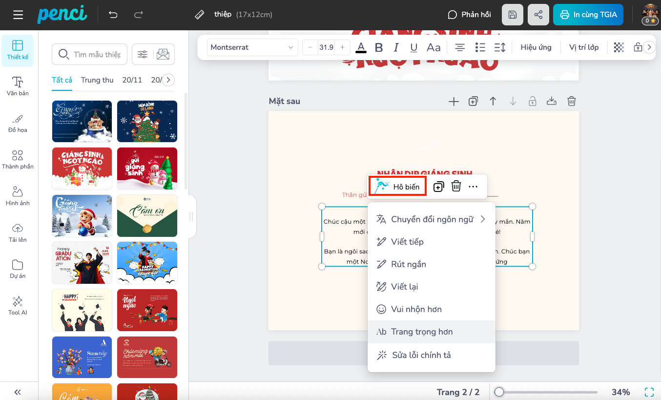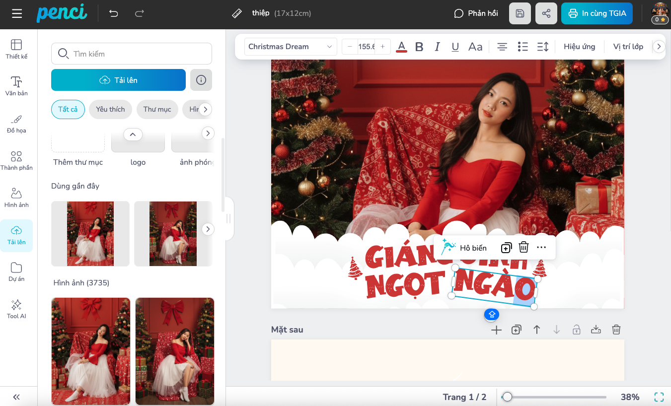 thieke thuvien Gợi ý 20+ mẫu thiệp Giáng Sinh sáng tạo, ý nghĩa dành tặng người thân, bạn bè mùa Noel 2025 By admin | 09 tháng 12 năm 2025 374 đã đọc 1. Ý nghĩa của việc tặng thiệp Giáng Sinh 1.1. Gửi đi lời chúc, giữ lại cảm xúc Thiệp Giáng Sinh không chỉ là miếng giấy in hình đẹp mà là nơi “đóng khung” lời chúc như Merry Christmas, Chúc bạn một mùa Noel bình an… để người nhận có thể giữ lại và đọc lại bất cứ lúc nào. Nếu tin nhắn dễ trôi mất, thì tấm thiệp được đặt trên bàn làm việc, góc phòng ngủ hay trong ví sẽ luôn nhắc họ nhớ đến bạn. 1.2. Thể hiện sự chân thành & trân trọng Tự tay chọn thiệp, viết lời chúc hay tự thiết kế cho thấy bạn đã thật sự dành thời gian nghĩ về người nhận, chứ không chỉ gửi lời chúc “cho có”. Với bố mẹ, người yêu, vợ/chồng hay bạn thân, một tấm thiệp có tên họ, hình chung hoặc câu nói “chỉ hai người hiểu” luôn tạo cảm giác được trân trọng và chạm đến cảm xúc rất sâu. 1.3. Kỷ vật nhỏ nhưng ý nghĩa lâu dài Sau mùa Noel, quà tặng có thể phai nhạt, nhưng thiệp Giáng Sinh thường được cất trong hộp kỷ niệm, sổ scrapbook hoặc album ảnh như một “dấu mốc thời gian”. Mỗi lần mở ra xem lại, người nhận sẽ nhớ về cảm xúc mùa Giáng Sinh năm đó. Vì vậy, đầu tư một chút cho một tấm thiệp đẹp, có cá nhân hoá chính là cách tinh tế để lưu giữ những khoảnh khắc đáng nhớ trong các mối quan hệ. 2. Top 20+ mẫu thiệp Giáng Sinh đẹp, sáng tạo tại Penci Tại Penci, bạn có thể chọn sẵn mẫu thiệp Giáng Sinh đẹp và tuỳ biến nội dung, màu sắc, hình ảnh. Dưới đây là gợi ý hơn 20 phong cách/mẫu thiệp phù hợp nhiều đối tượng khác nhau (bạn bè, người thân, khách hàng, đối tác…) Truy cập vào đây để sử dụng miễn phí mẫu thiệp Giáng Sinh này Truy cập vào đây để sử dụng miễn phí mẫu thiệp Giáng Sinh này Truy cập vào đây để sử dụng miễn phí mẫu thiệp Giáng Sinh này Truy cập vào đây để sử dụng miễn phí mẫu thiệp Giáng Sinh này Truy cập vào đây để sử dụng miễn phí mẫu thiệp Giáng Sinh này Truy cập vào đây để sử dụng miễn phí mẫu thiệp Giáng Sinh này Truy cập vào đây để sử dụng miễn phí mẫu thiệp Giáng Sinh này Truy cập vào đây để sử dụng miễn phí mẫu thiệp Giáng Sinh này Truy cập vào đây để sử dụng miễn phí mẫu thiệp Giáng Sinh này 3. Tự thiết kế thiệp Giáng Sinh, cá nhân hóa hình ảnh & nội dung với Penci Ngoài việc chọn mẫu sẵn, điểm mạnh của Penci là bạn có thể tự tay thiết kế thiệp Giáng Sinh theo cách rất đơn giản - kể cả khi bạn không phải dân thiết kế. Quy trình tự thiết kế thiệp Giáng Sinh tại Penci Nếu bạn muốn tự tay thiết kế những tấm thiệp Giáng Sinh thật ý nghĩa để tặng người thân, bạn bè nhưng không rành design, Penci sẽ là “trợ lý” cực đơn giản và dễ dùng. Chỉ với vài thao tác kéo – thả, chỉnh sửa nội dung và tận dụng sức mạnh AI, bạn đã có ngay mẫu thiệp Giáng Sinh mang dấu ấn rất riêng. Penci cung cấp kho mẫu thiệp phong phú với nhiều chủ đề lễ hội khác nhau: Tết, Trung Thu, Giáng Sinh, tốt nghiệp… Mỗi mẫu đều được thiết kế sẵn bố cục, màu sắc và icon trang trí, bạn chỉ cần chọn mẫu yêu thích rồi chỉnh sửa lại theo ý mình. Dù là thiệp chúc Giáng Sinh cho gia đình, bạn bè hay thiệp tặng thầy cô, đồng nghiệp… đều có mẫu phù hợp. (Thư viện mẫu thiệp đa dạng theo mùa lễ hội) Bộ công cụ thiết kế trực quan, ai cũng dùng được Giao diện thiết kế của Penci được tối ưu để người không chuyên cũng làm được: (Tải ảnh cá nhân lên và kéo – thả trực tiếp vào bố cục thiệp) (Tùy chỉnh nội dung lời chúc, thay đổi font chữ, cỡ chữ, căn lề, màu sắc…) Sử dụng AI viết lại văn bản: bạn chỉ cần nhập vài câu mô tả hoặc nội dung gốc, chọn phong cách mong muốn như trang trọng, vui nhộn, đáng yêu, ấm áp…, AI sẽ gợi ý lại lời chúc Giáng Sinh thật chỉn chu và giàu cảm xúc để bạn chèn thẳng vào thiệp. (Tính năng Viết lại văn bản của Penci - giúp bạn tạo những câu chúc hay và ý nghĩa) Thiết kế xong và đặt in trực tiếp tại Penci Sau khi hoàn thiện thiết kế thiệp Giáng Sinh, bạn có thể đặt in trực tiếp trên Penci mà không cần tải file, gửi qua lại hay lo lỗi font, vỡ hình. File in được xử lý chuẩn, giữ nguyên màu sắc và độ sắc nét, giúp bạn nhận được những tấm thiệp Giáng Sinh đẹp, chuyên nghiệp, sẵn sàng viết lời chúc và trao tặng đến những người bạn yêu thương. (Thiết kế xong, bạn chỉ việc bấm đặt in, và chờ nhận tấm thiệp Noel) Nếu bạn đang tìm một cách đặc biệt hơn để nói “Chúc bạn một mùa Noel an lành”, hãy bắt đầu bằng chính một tấm thiệp Giáng Sinh do bạn tự thiết kế. Trải nghiệm ngay trên Penci và chuẩn bị sẵn những chiếc thiệp xinh xắn để trao tặng cho người thân, bạn bè trong mùa Noel 2025 này nhé! Nguồn: Penci - Thiết kế dễ dàng, đậm chất Việt Đã sao chép