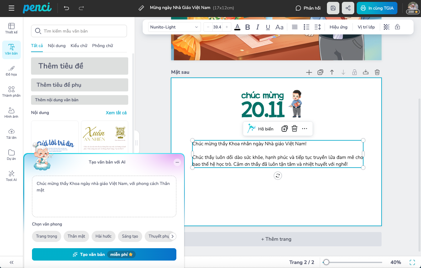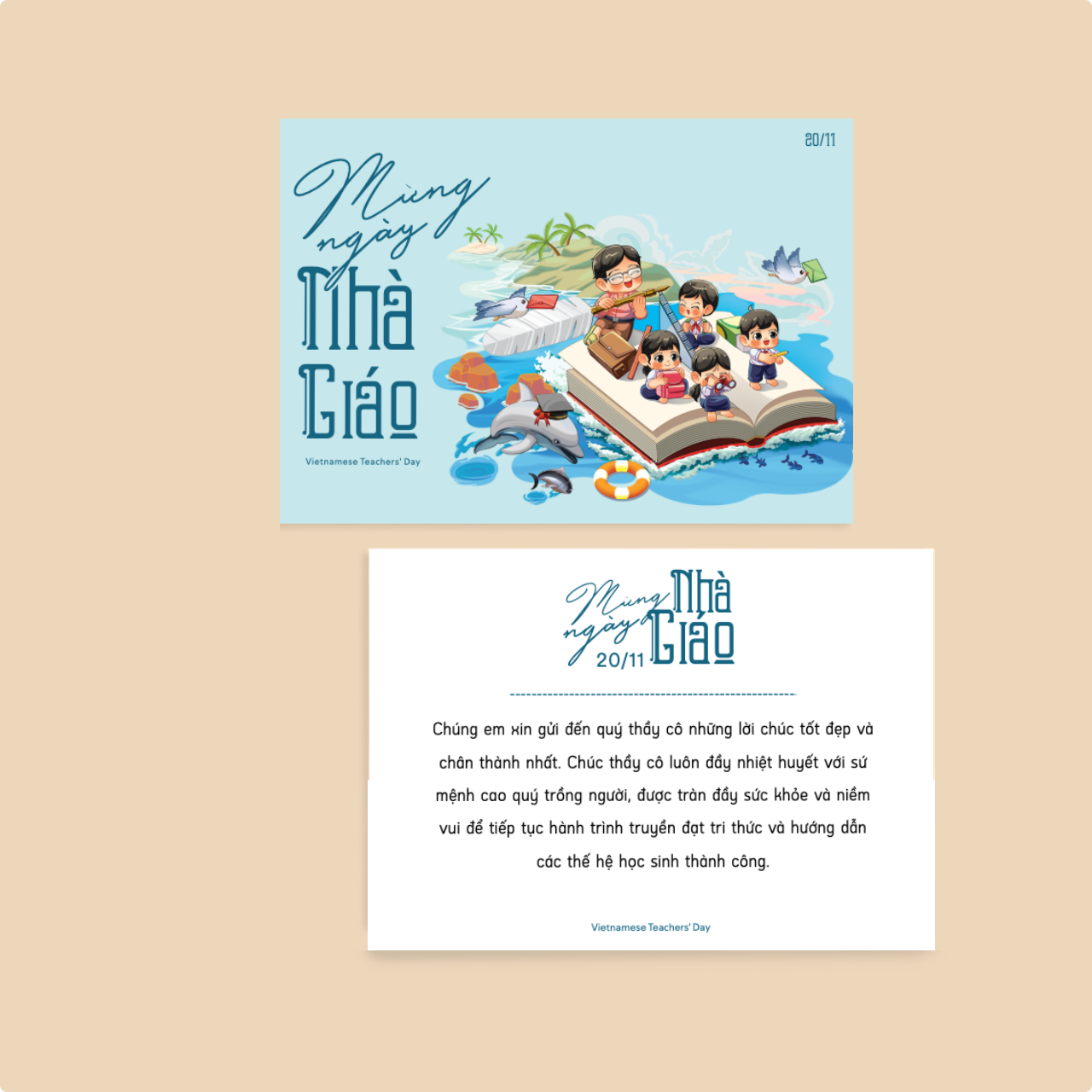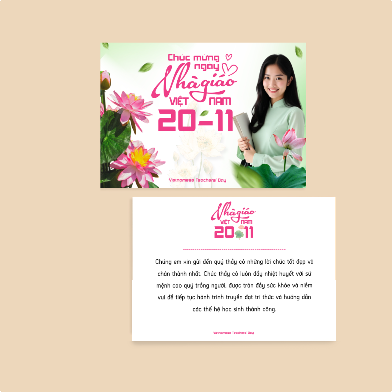 thieke thuvien Gợi ý những mẫu Thiệp chúc mừng 20/11 sáng tạo, ấn tượng và cách tạo thiệp online gửi tặng thầy cô ngày Nhà giáo Việt Nam By admin | 12 tháng 11 năm 2025 1509 đã đọc Ngày Nhà giáo Việt Nam 20/11 là dịp đặc biệt để tri ân những người thầy, người cô đã âm thầm gieo mầm tri thức. Bên cạnh những bó hoa tươi hay món quà nhỏ, một tấm thiệp chúc mừng 20/11 được thiết kế riêng sẽ mang đến cảm xúc sâu sắc hơn cả, bởi đó là lời cảm ơn được gửi gắm bằng chính sự sáng tạo và tình cảm chân thành. Cùng Penci khám phá những mẫu thiệp chúc mừng 20/1 độc đáo, đậm chất Việt và cách tự tay thiết kế thiệp online tặng thầy cô chỉ trong vài phút. 1. Vì sao 20/11 lại cần thiệp chúc mừng để tri ân thầy cô Ngày Nhà giáo Việt Nam 20/11 không chỉ là ngày tôn vinh nghề dạy học, mà còn là dịp để mỗi người chúng ta bày tỏ lòng biết ơn sâu sắc tới những “người lái đò” đã tận tâm dìu dắt qua từng bài học, từng năm tháng trưởng thành. Giữa muôn vàn món quà, một tấm thiệp chúc mừng 20/11 lại mang giá trị rất riêng. Nó không đơn thuần là một tờ giấy hay hình ảnh trang trí, mà là lời nói chưa kịp thổ lộ, là sự chân thành gửi gắm qua từng nét chữ, từng gam màu. Nhiều người chia sẻ rằng, dù đã ra trường nhiều năm, họ vẫn giữ lại những tấm thiệp cũ, bởi đó là minh chứng cho tình cảm giữa thầy và trò, là kỷ niệm khó phai của một thời áo trắng. Thiệp chúc mừng ngày Nhà giáo Việt Nam 20/11 ý nghĩa, đầy cảm xúc Ngày nay, khi công nghệ phát triển, việc tạo thiệp chúc mừng ngày Nhà giáo Việt Nam 20/11 online giúp mọi người dễ dàng thể hiện tình cảm dù ở xa. Dù là học sinh, sinh viên, hay giáo viên gửi lời chúc đến đồng nghiệp, mỗi tấm thiệp đều mang trong mình ý nghĩa sâu sắc, vừa hiện đại vừa trọn vẹn truyền thống tri ân. >> Xem thêm: Trọn bộ mẫu thiết kế thiệp chúc mừng ngày Nhà giáo Việt Nam 20/11 ấn tượng, độc đáo 2. Những mẫu thiệp chúc mừng ngày Nhà giáo Việt Nam 20/11 sáng tạo, ấn tượng Kho mẫu thiết kế thiệp chúc mừng 20/11 trên Penci.vn được sáng tạo bởi các họa sĩ trẻ, lấy cảm hứng từ ký ức mái trường, hình ảnh đời thường của thầy cô và những kỷ niệm tuổi học trò. Mỗi mẫu thiệp là một câu chuyện nhỏ giản dị, chân thành nhưng chan chứa cảm xúc tri ân. Mỗi mẫu thiệp chúc mừng đều có “chất riêng”: có mẫu mộc mạc, phảng phất nét xưa; có mẫu lại trẻ trung, hiện đại với đồ họa vector sinh động; và cũng có những mẫu được vẽ tay tinh tế từ trải nghiệm thực tế của họa sĩ từ bảng đen, phấn trắng, đến nụ cười hiền hậu của thầy cô. Dưới đây là gợi ý một số mẫu thiệp chúc mừng 20/11 đẹp, ấn tượng: Thiệp chúc mừng thầy cô 20/11 chủ đề “Người lái đò” ý nghĩa và xúc động Mẫu thiệp chúc mừng ngày Nhà giáo Việt Nam phong cách chibi đáng yêu, dễ thương Thiệp cảm ơn thầy cô 20/11 với hình ảnh bảng đen, phấn trắng và bó hoa tri ân Thiệp chúc mừng 20/11 vẽ tay hình ảnh thầy cô và học sinh trong lớp học Mẫu thiệp 20/11 sáng tạo, tri ân sự nghiệp trồng người cao quý của thầy cô Mẫu thiệp 20/11 vector hiện đại, phối màu pastel nhẹ nhàng và tinh tế Thiệp 20/11 cảm động với lời chúc tri ân viết tay trên nền giấy cổ điển Mẫu thiệp 20/11 đơn giản, tinh khôi với hình ảnh quyển vở học trò và mực tím quen thuộc Thiệp điện tử 20/11 dành tặng giáo viên, có thể tùy chỉnh tên và lời chúc riêng Mẫu thiệp chúc mừng 20/11 phong cách hiện đại, màu sắc trẻ trung, dễ chỉnh sửa >> Xem thêm: Thư viện mẫu thiết kế thiệp chúc mừng ngày Nhà giáo Việt Nam 20/11 sáng tạo và ý nghĩa nhất Điểm đặc biệt của các mẫu thiệp trên Penci là khả năng cá nhân hóa linh hoạt. Bạn có thể thay đổi màu sắc, chèn ảnh, viết lời chúc riêng hoặc thêm logo lớp, tên trường để biến mỗi tấm thiệp thành phiên bản duy nhất nhằm mang đậm dấu ấn người gửi. Hãy cùng tìm hiểu cách tạo nên một tấm thiệp 20/11 online chỉ trong vài phút đơn giản, nhanh và tràn đầy ý nghĩa. 3. Cách tạo thiệp online gửi tặng thầy cô ngày Nhà giáo Việt Nam Muốn gửi lời chúc thật đặc biệt đến thầy cô nhưng không biết thiết kế? Với Penci.vn, bạn hoàn toàn có thể tự tay tạo nên thiệp chúc mừng 20/11 online vừa đẹp mắt, vừa đầy cảm xúc chỉ trong vài phút, mà không cần kỹ năng thiết kế. Dưới đây là hướng dẫn chi tiết để bạn bắt đầu: Bước 1: Chọn mẫu thiệp có sẵn từ thư viện Penci Truy cập Penci.vn và nhập từ khóa “Thiệp chúc mừng” hoặc chọn chuyên mục “Thư mời” → “Thiệp chúc mừng” Tại đây, bạn sẽ thấy hàng trăm mẫu thiệp thiết kế sẵn, được nhóm theo chủ đề: tri ân thầy cô, cảm ơn giáo viên, lời chúc 20/11,… Tất cả đều mang phong cách thuần Việt, màu sắc hài hòa và bố cục chuyên nghiệp. Hãy chọn mẫu bạn ưng ý nhất để bắt đầu chỉnh sửa nha. Kho mẫu thiết kế thiệp
