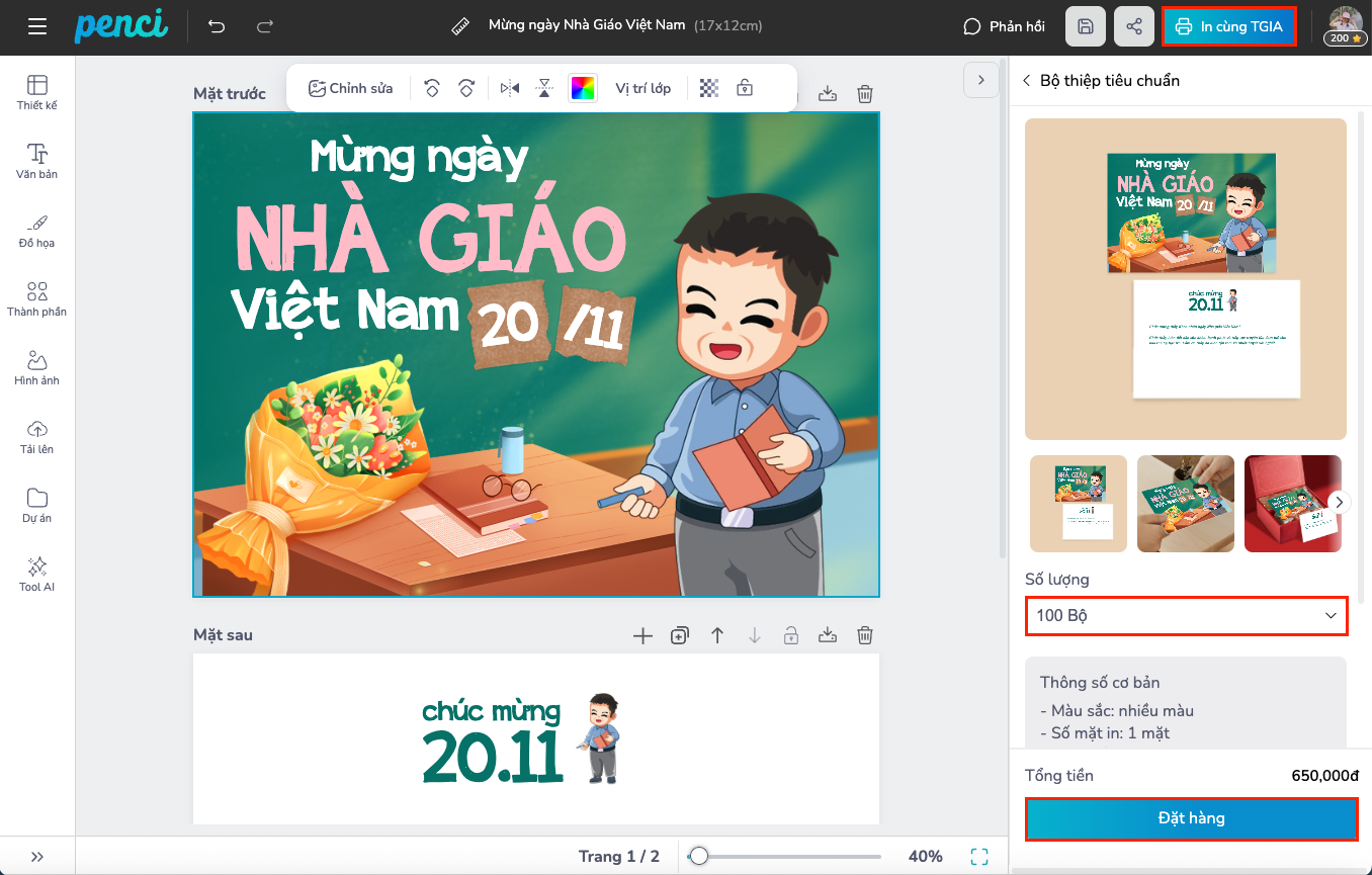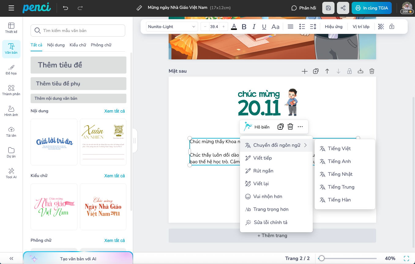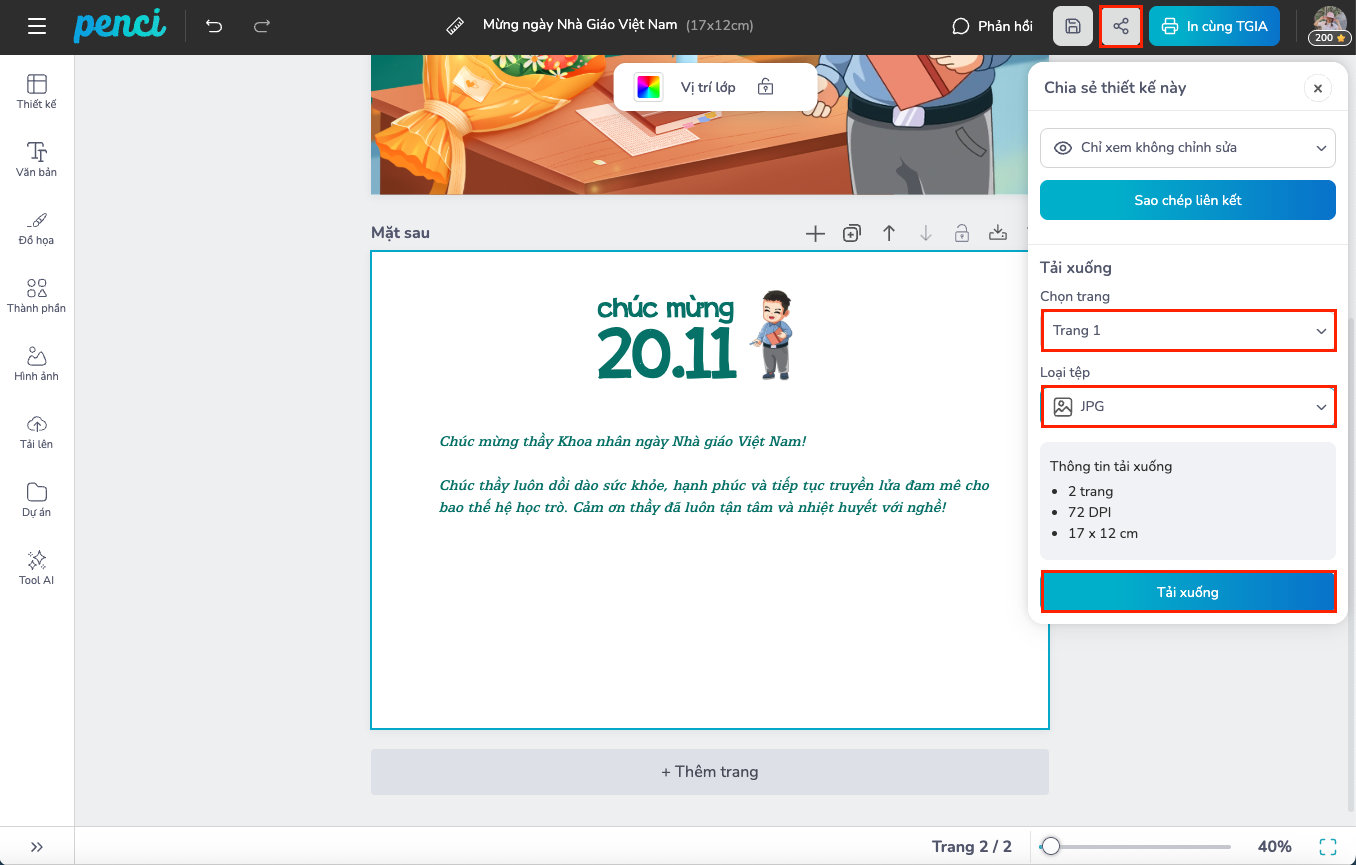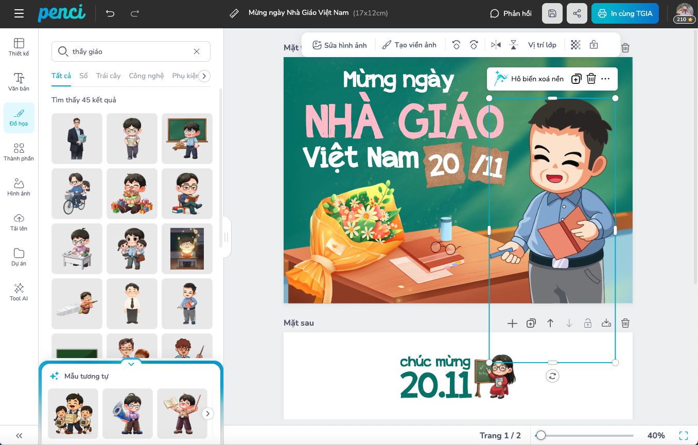 thieke thuvien Gợi ý những mẫu Thiệp chúc mừng 20/11 sáng tạo, ấn tượng và cách tạo thiệp online gửi tặng thầy cô ngày Nhà giáo Việt Nam By admin | 12 tháng 11 năm 2025 1509 đã đọc Ngày Nhà giáo Việt Nam 20/11 là dịp đặc biệt để tri ân những người thầy, người cô đã âm thầm gieo mầm tri thức. Bên cạnh những bó hoa tươi hay món quà nhỏ, một tấm thiệp chúc mừng 20/11 được thiết kế riêng sẽ mang đến cảm xúc sâu sắc hơn cả, bởi đó là lời cảm ơn được gửi gắm bằng chính sự sáng tạo và tình cảm chân thành. Cùng Penci khám phá những mẫu thiệp chúc mừng 20/1 độc đáo, đậm chất Việt và cách tự tay thiết kế thiệp online tặng thầy cô chỉ trong vài phút. 1. Vì sao 20/11 lại cần thiệp chúc mừng để tri ân thầy cô Ngày Nhà giáo Việt Nam 20/11 không chỉ là ngày tôn vinh nghề dạy học, mà còn là dịp để mỗi người chúng ta bày tỏ lòng biết ơn sâu sắc tới những “người lái đò” đã tận tâm dìu dắt qua từng bài học, từng năm tháng trưởng thành. Giữa muôn vàn món quà, một tấm thiệp chúc mừng 20/11 lại mang giá trị rất riêng. Nó không đơn thuần là một tờ giấy hay hình ảnh trang trí, mà là lời nói chưa kịp thổ lộ, là sự chân thành gửi gắm qua từng nét chữ, từng gam màu. Nhiều người chia sẻ rằng, dù đã ra trường nhiều năm, họ vẫn giữ lại những tấm thiệp cũ, bởi đó là minh chứng cho tình cảm giữa thầy và trò, là kỷ niệm khó phai của một thời áo trắng. Thiệp chúc mừng ngày Nhà giáo Việt Nam 20/11 ý nghĩa, đầy cảm xúc Ngày nay, khi công nghệ phát triển, việc tạo thiệp chúc mừng ngày Nhà giáo Việt Nam 20/11 online giúp mọi người dễ dàng thể hiện tình cảm dù ở xa. Dù là học sinh, sinh viên, hay giáo viên gửi lời chúc đến đồng nghiệp, mỗi tấm thiệp đều mang trong mình ý nghĩa sâu sắc, vừa hiện đại vừa trọn vẹn truyền thống tri ân. >> Xem thêm: Trọn bộ mẫu thiết kế thiệp chúc mừng ngày Nhà giáo Việt Nam 20/11 ấn tượng, độc đáo 2. Những mẫu thiệp chúc mừng ngày Nhà giáo Việt Nam 20/11 sáng tạo, ấn tượng Kho mẫu thiết kế thiệp chúc mừng 20/11 trên Penci.vn được sáng tạo bởi các họa sĩ trẻ, lấy cảm hứng từ ký ức mái trường, hình ảnh đời thường của thầy cô và những kỷ niệm tuổi học trò. Mỗi mẫu thiệp là một câu chuyện nhỏ giản dị, chân thành nhưng chan chứa cảm xúc tri ân. Mỗi mẫu thiệp chúc mừng đều có “chất riêng”: có mẫu mộc mạc, phảng phất nét xưa; có mẫu lại trẻ trung, hiện đại với đồ họa vector sinh động; và cũng có những mẫu được vẽ tay tinh tế từ trải nghiệm thực tế của họa sĩ từ bảng đen, phấn trắng, đến nụ cười hiền hậu của thầy cô. Dưới đây là gợi ý một số mẫu thiệp chúc mừng 20/11 đẹp, ấn tượng: Thiệp chúc mừng thầy cô 20/11 chủ đề “Người lái đò” ý nghĩa và xúc động Mẫu thiệp chúc mừng ngày Nhà giáo Việt Nam phong cách chibi đáng yêu, dễ thương Thiệp cảm ơn thầy cô 20/11 với hình ảnh bảng đen, phấn trắng và bó hoa tri ân Thiệp chúc mừng 20/11 vẽ tay hình ảnh thầy cô và học sinh trong lớp học Mẫu thiệp 20/11 sáng tạo, tri ân sự nghiệp trồng người cao quý của thầy cô Mẫu thiệp 20/11 vector hiện đại, phối màu pastel nhẹ nhàng và tinh tế Thiệp 20/11 cảm động với lời chúc tri ân viết tay trên nền giấy cổ điển Mẫu thiệp 20/11 đơn giản, tinh khôi với hình ảnh quyển vở học trò và mực tím quen thuộc Thiệp điện tử 20/11 dành tặng giáo viên, có thể tùy chỉnh tên và lời chúc riêng Mẫu thiệp chúc mừng 20/11 phong cách hiện đại, màu sắc trẻ trung, dễ chỉnh sửa >> Xem thêm: Thư viện mẫu thiết kế thiệp chúc mừng ngày Nhà giáo Việt Nam 20/11 sáng tạo và ý nghĩa nhất Điểm đặc biệt của các mẫu thiệp trên Penci là khả năng cá nhân hóa linh hoạt. Bạn có thể thay đổi màu sắc, chèn ảnh, viết lời chúc riêng hoặc thêm logo lớp, tên trường để biến mỗi tấm thiệp thành phiên bản duy nhất nhằm mang đậm dấu ấn người gửi. Hãy cùng tìm hiểu cách tạo nên một tấm thiệp 20/11 online chỉ trong vài phút đơn giản, nhanh và tràn đầy ý nghĩa. 3. Cách tạo thiệp online gửi tặng thầy cô ngày Nhà giáo Việt Nam Muốn gửi lời chúc thật đặc biệt đến thầy cô nhưng không biết thiết kế? Với Penci.vn, bạn hoàn toàn có thể tự tay tạo nên thiệp chúc mừng 20/11 online vừa đẹp mắt, vừa đầy cảm xúc chỉ trong vài phút, mà không cần kỹ năng thiết kế. Dưới đây là hướng dẫn chi tiết để bạn bắt đầu: Bước 1: Chọn mẫu thiệp có sẵn từ thư viện Penci Truy cập Penci.vn và nhập từ khóa “Thiệp chúc mừng” hoặc chọn chuyên mục “Thư mời” → “Thiệp chúc mừng” Tại đây, bạn sẽ thấy hàng trăm mẫu thiệp thiết kế sẵn, được nhóm theo chủ đề: tri ân thầy cô, cảm ơn giáo viên, lời chúc 20/11,… Tất cả đều mang phong cách thuần Việt, màu sắc hài hòa và bố cục chuyên nghiệp. Hãy chọn mẫu bạn ưng ý nhất để bắt đầu chỉnh sửa nha. Kho mẫu thiết kế thiệp