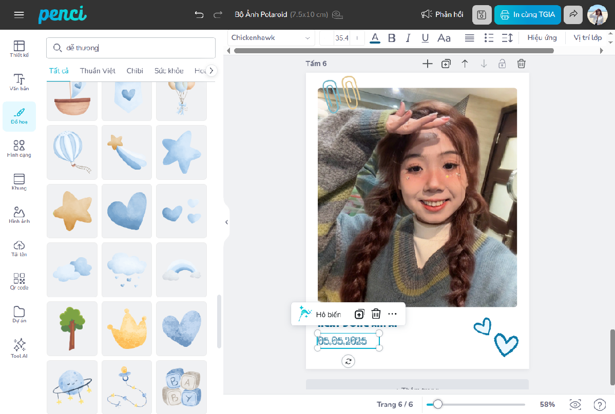 thieke thuvien In ảnh theo yêu cầu, in ảnh làm quà tặng: Tự thiết kế & in ảnh đẹp, rõ nét, giao tận nhà toàn quốc tại Penci By admin | 22 tháng 10 năm 2025 37 đã đọc In ảnh theo yêu cầu với nhiều kích thước, hình ảnh sắc nét và bền màu cho mọi dịp từ cưới hỏi, sinh nhật đến kỷ niệm gia đình, công ty cực kỳ nhanh chóng và đơn giản. Với dịch vụ in ảnh theo yêu cầu tại Penci, bạn có thể tự thiết kế và đặt in ảnh online đẹp, in ảnh màu rõ nét nhận hàng tận nơi chỉ trong vài ngày. >> Tham khảo thêm gợi ý combo quà tặng cá nhân hóa và tự làm đơn giản tặng mẹ, vợ, người yêu cực kỳ đơn giản 1/ Top các loại ảnh in theo yêu cầu đẹp & được yêu thích nhất tại Penci In ảnh theo yêu cầu tại Penci cho phép bạn tự chọn hình, chỉnh sửa, thêm chữ hoặc sticker và in ảnh online sắc nét theo kích thước và phong cách riêng. Không cần đến tiệm in truyền thống, giờ đây bạn có thể in ảnh online trực tiếp tại penci.vn, thao tác nhanh, dễ tùy chỉnh và nhận hàng tận nơi chỉ sau vài ngày. Penci mang đến nhiều lựa chọn in ảnh phong phú giúp bạn in ảnh nhanh, in ảnh giá rẻ mà vẫn đảm bảo chất lượng rõ nét, bền màu phù hợp cho mọi nhu cầu In ảnh theo yêu cầu nhanh, đẹp và rõ nét tại penci.vn 1.1 In ảnh Polaroid Ảnh Polaroid là lựa chọn được giới trẻ yêu thích khi in ảnh làm quà tặng. Kiểu ảnh nhỏ gọn, có viền trắng cổ điển, cực phù hợp để làm scrapbook, trang trí bàn học hay nhà cửa. Bạn có thể tham khảo các mẫu frame ảnh polaroid đẹp, hot trend miễn phí tại Penci. Dù bạn thích phong cách Hàn Quốc, vintage hay tối giản, chỉ vài phút là có thể tự thiết kế và in bộ ảnh Polaroid cá nhân hóa theo yêu cầu đơn giản tại Penci với màu sắc chân thực, giấy dày đẹp và chất lượng in ảnh rõ nét >> In bộ ảnh polaroid chất lượng và cá nhân hóa theo ý thích tại đây Ảnh Polaroid nhỏ xinh in theo yêu cầu làm quà tặng 1.2 In ảnh Photobooth Xu hướng “chụp photobooth” đang phủ sóng khắp mạng xã hội. Và tại Penci, bạn có thể in ảnh theo yêu cầu ngay trên nền tảng online, tự thiết kế frame ảnh photobooth theo phong cách riêng chỉ với vài thao tác đơn giản hoặc tham khảo ngay các mẫu frame photobooth hot trend được đội ngũ Penci thiết kế riêng. Kiểu in ảnh màu này này rất được ưa chuộng để in ảnh làm quà tặng bạn bè, người yêu, hoặc lưu giữ những khoảnh khắc ngọt ngào trong các dịp sinh nhật, lễ kỷ niệm và chuyến đi đáng nhớ. >> In bộ ảnh photobooth hot trend với chi phí tiết kiệm ngay tại đây Ảnh Photobooth cá nhân hóa, phong cách trẻ trung 1.3 In ảnh Classic In ảnh Classic là kiểu ảnh tràn viền truyền thống được nhiều người yêu thích để lưu giữ trong album, khung ảnh hoặc sổ kỷ niệm. Đây là dạng ảnh rời, kích thước linh hoạt, được in trên giấy ảnh Sapphire cao cấp giúp bám mực tốt, bề mặt sáng bóng, mịn mượt cho chất lượng ảnh chuyên nghiệp. Tại Penci, bạn có thể in ảnh theo yêu cầu TPHCM và toàn quốc, tùy chọn số lượng từ vài tấm đến hàng trăm tấm. Dịch vụ in ảnh online nhanh, in ảnh đẹp, rõ nét giúp bạn dễ dàng lưu giữ những khoảnh khắc ý nghĩa từ ảnh gia đình, ảnh cưới đến những tấm hình đời thường đầy cảm xúc. >> In ảnh classic đơn giản ngay tại đây Ảnh Classic chất lượng in sắc nét, giữ màu lâu giúp lưu giữ mọi khoảnh khắc 1.4 In ảnh Nam Châm dẻo Bạn muốn lưu giữ kỷ niệm theo cách mới lạ? Hãy thử in ảnh nam châm chỉ cần dán lên tủ lạnh, bảng ghi chú hay bất kỳ góc nhỏ nào bằng kim loại. Ảnh được in bằng công nghệ tiên tiến gồm 3 lớp: nam châm, giấy ảnh cao cấp và 1 lớp màng phủ bảo vệ bề mặt ảnh cho ra ảnh in rõ nét và bền đẹp theo thời gian. Đây là kiểu in ảnh cá nhân hóa đang rất được yêu thích để tặng bạn bè, người thân, hoặc trang trí góc học tập, làm việc. >> In ảnh nam châm dẻo tại đây Ảnh nam châm in theo yêu cầu, trang trí tủ lạnh độc đáo Ngoài in ảnh, bạn có thể khám phá thêm các dòng sản phẩm thiết kế quà tặng cá nhân hóa khác như áo thun, ly sứ, photobook, túi canvas hay lịch để bàn in ảnh cá nhân ngay tại Penci.vn 2/ Hướng dẫn cách in ảnh theo yêu cầu nhanh chóng, đơn giản tại penci.vn Với Penci, bạn có thể tự thiết kế và đặt in ảnh online ngay tại nhà, cá nhân hóa theo phong cách riêng và nhận hàng tận nơi sau vài ngày chỉ với 3 bước sau đây: Bước 1: Truy cập Penci.vn và chọn loại ảnh bạn muốn in Vào trang penci.vn, tại danh mục “Cá nhân hóa” chọn “In ảnh” để chọn loại ảnh phù hợp như ảnh polaroid, photobooth, classic hoặc ảnh nam châm. Bạn cũng có thể truy cập nhanh qua các đường link sản phẩm được gợi ý ở phần trên. Chọn loại ảnh mà bạn muốn in tại mục "In ảnh" Bước 2: Tùy chỉnh thiết kế cá nhân hóa Bạn có thể chọn ảnh để in đơn giản hoặc tự thiết kế ảnh in đa dạng hơn như chọn mẫu layout, thêm ảnh, để lại lời nhắn, ký tên hoặc dán sticker để bức ảnh trở nên sinh động và