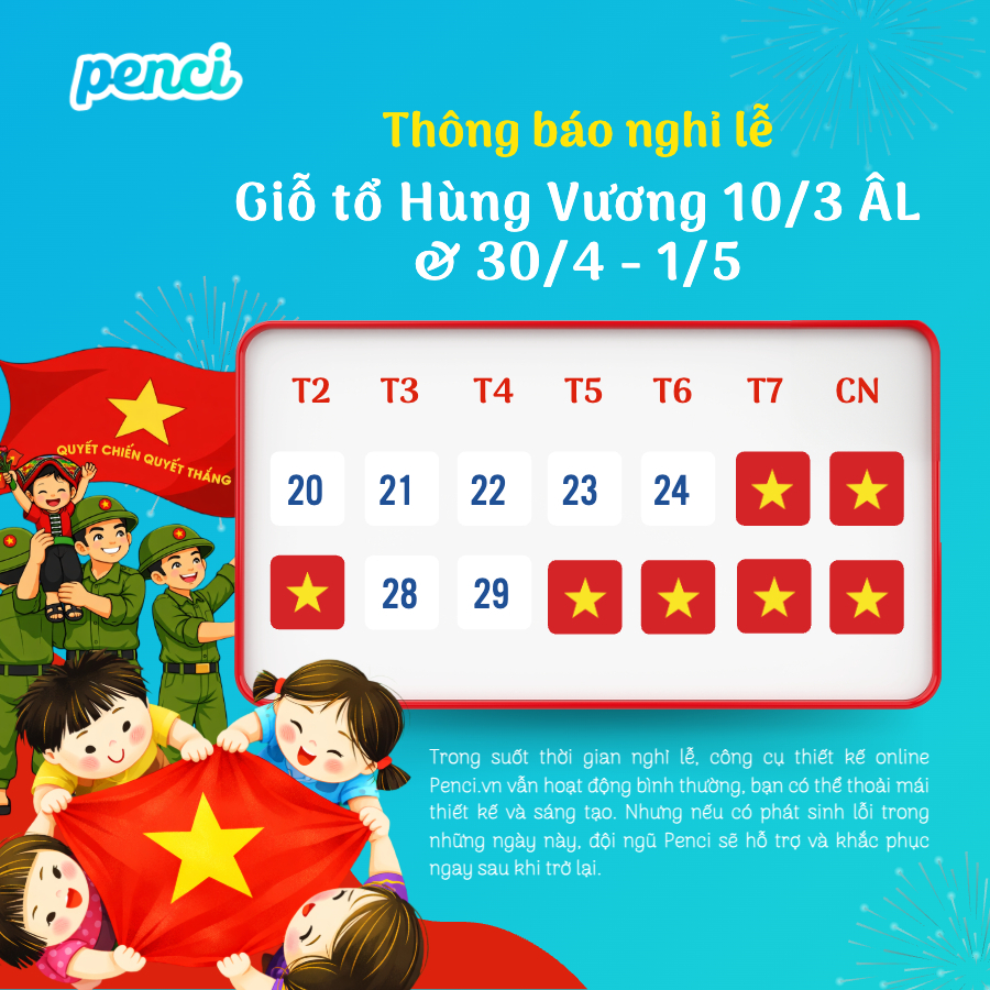 thieke thuvien Lịch nghỉ lễ Giỗ tổ Hùng Vương, 30/4 - 1/5 năm 2026 dành cho người lao động By admin | 01 tháng 04 năm 2026 207 đã đọc Sau kỳ nghỉ Tết, người lao động sẽ bước vào chuỗi ngày nghỉ lễ quan trọng trong năm gồm Giỗ Tổ Hùng Vương, Ngày Giải phóng miền Nam 30/4 và Quốc tế Lao động 1/5. Đây là thời điểm nhiều người quan tâm để lên kế hoạch nghỉ ngơi, du lịch hoặc sắp xếp công việc hợp lý. Bên cạnh lịch nghỉ chung theo quy định, mỗi doanh nghiệp cũng sẽ có thông báo riêng để khách hàng và đối tác tiện theo dõi. Trong bài viết này, Penci sẽ cập nhật chi tiết lịch nghỉ lễ năm 2026 dành cho người lao động, đồng thời thông báo thời gian nghỉ của đội ngũ để bạn chủ động trong quá trình sử dụng dịch vụ và liên hệ công việc. 1. Nghỉ lễ Giỗ Tổ Hùng Vương từ 25-27/4 Năm 2026 ngày Giỗ Tổ Hùng Vương rơi vào chủ nhật (26/4 dương lịch). Do trùng với ngày nghỉ cuối tuần, người lao động được nghỉ bù vào thứ hai (27/4). Như vậy, người lao động có đi làm ngày Thứ 7 sẽ được nghỉ 2 ngày vào dịp lễ Giỗ Tổ Hùng Vương. Còn đối với người lao động được nghỉ Thứ 7 sẽ có kỳ nghỉ kéo dài 3 ngày, từ thứ bảy 25/4 đến hết thứ hai 27/4. Tìm hiểu thêm: Nguồn gốc ngày Giỗ tổ Hùng Vương mùng 10/3 âm lịch 2. Nghỉ lễ 30/4 - 1/5 kéo dài 4 ngày liên tục Hai ngày lễ lớn là 30/4 và 1/5 của năm 2026 rơi vào thứ Năm và thứ Sáu. Với những người lao động không phải đi làm thứ Bảy, kỳ nghỉ kéo dài 4 ngày liên tục, từ 30/4 đến hết ngày 3/5 (tính cả hai ngày cuối tuần). Điểm đáng lưu ý là hai kỳ nghỉ này khá gần nhau. Người lao động vừa nghỉ xong dịp Giỗ Tổ Hùng Vương sẽ đi làm lại 2 ngày rồi được nghỉ tiếp dịp 30/4. Xem thêm: Lịch sử và ý nghĩa của Ngày Giải phóng miền Nam 30/4 3. Penci - Thông báo lịch nghỉ lễ 30/4 - 1/5 Penci trân trọng thông báo đến Quý khách hàng, đối tác và cộng đồng lịch nghỉ lễ Kỷ niệm 51 năm Ngày Giải phóng miền Nam (30/4/1975 - 30/4/2026) và Quốc tế Lao động 1/5 như sau: ⏰ Thời gian nghỉ lễ: - Lễ Giỗ Tổ Hùng Vương: nghỉ ngày Thứ hai (27/04/2026) - Lễ 30/04 và 01/05: nghỉ ngày Thứ năm, Thứ sáu, Thứ bảy (30/04 - 01,02/05/2026) Trong suốt thời gian nghỉ lễ, công cụ thiết kế online Penci.vn vẫn hoạt động bình thường, bạn có thể thoải mái thiết kế và sáng tạo. Nhưng nếu có phát sinh lỗi trong những ngày này, đội ngũ Penci sẽ hỗ trợ và khắc phục ngay sau khi trở lại. ✨ Kính chúc Quý khách hàng, đối tác và cộng đồng kỳ nghỉ lễ vui vẻ và bình an. Đã sao chép
