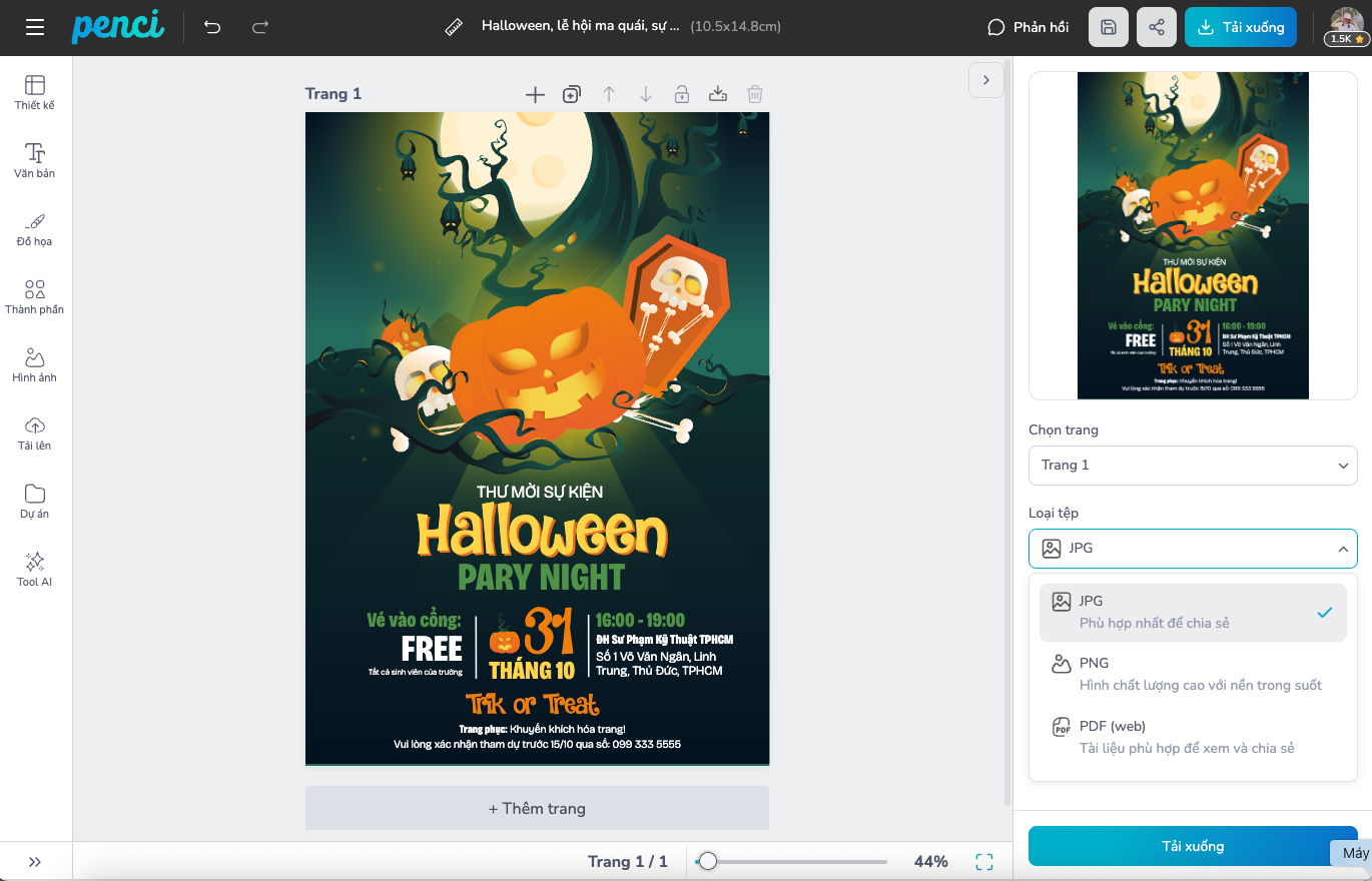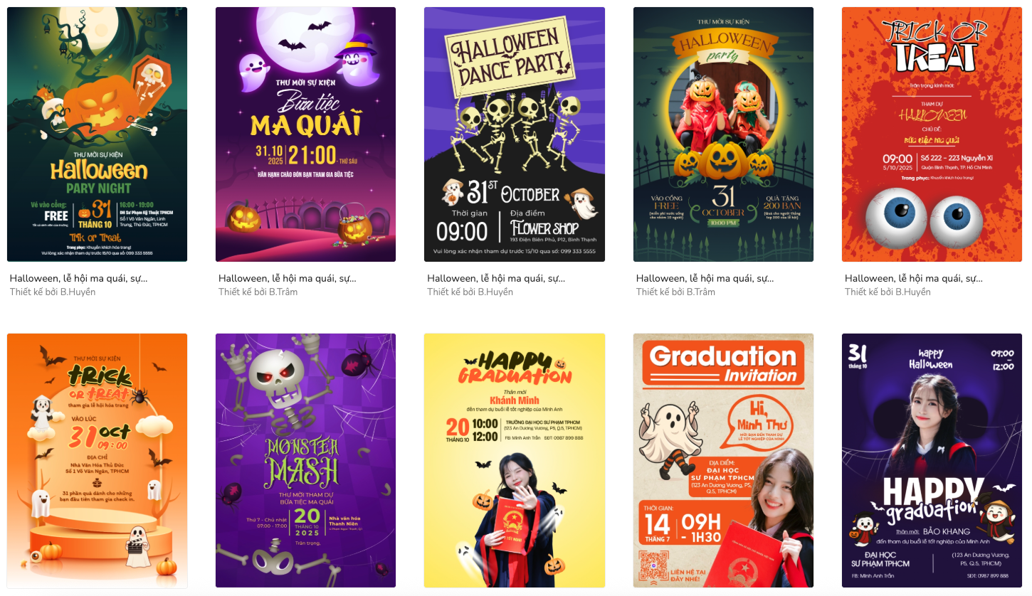 thieke thuvien Những mẫu thiệp mời Halloween đẹp, nhiều phong cách sáng tạo và mới nhất năm 2026 By admin | 24 tháng 10 năm 2025 618 đã đọc Halloween là dịp để mọi người thỏa sức sáng tạo và gửi đi những lời chúc “rùng rợn mà đáng yêu”. Tại Penci, bạn có thể tìm thấy hàng loạt mẫu thiệp mời, thiệp chúc mừng Halloween độc đáo chuẩn style Việt, từ ma đội nón lá, ma mặc áo dài cho đến bí ngô “quốc tịch” Việt Nam. Những thiết kế này không chỉ vui nhộn, gần gũi với văn hóa Việt mà còn mang đậm tinh thần sáng tạo giúp bạn tạo nên tấm thiệp “vừa đáng sợ vừa dễ thương” để gửi tặng bạn bè trong mùa lễ hội 2026 này. Bài viết này sẽ tổng hợp những mẫu thiệp Halloween ấn tượng từ Penci cùng cách thực hiện vô cùng đơn giản. 1. Ý nghĩa của thiệp mời, thiệp chúc mừng Halloween Dù Halloween là một lễ hội bắt nguồn từ phương Tây, nhưng khi du nhập vào Việt Nam, nó đã nhanh chóng trở thành dịp để giới trẻ và các thương hiệu thể hiện sự sáng tạo, tinh nghịch và khả năng bắt trend. Không còn chỉ là những buổi hóa trang “rùng rợn”, Halloween ở Việt Nam mang màu sắc vui nhộn, gần gũi và thân thiện hơn,đặc biệt là trong cách người ta tự làm và tặng nhau những tấm thiệp Halloween dễ thương. Một tấm thiệp Halloween có thể là lời chúc “chúc cậu một mùa ma vui vẻ”, là một cách để trêu đùa bạn bè, hay đơn giản là gửi đi chút năng lượng tích cực giữa mùa lễ hội. Người Việt hiện nay cũng dần xem Halloween như một sự kiện vui trong năm, tương tự Valentine hay Noel, đây là một cơ hội để tụ họp, chia sẻ niềm vui, và bộc lộ cá tính qua những món quà nhỏ xinh. Nguồn: Penci AI toạ hình ảnh từ văn bản Vì thế, thiệp Halloween ở Việt Nam không chỉ mang ý nghĩa giao tiếp, mà còn phản ánh sự hòa nhập văn hóa một cách sáng tạo khi các yếu tố truyền thống như nón lá, áo dài, đèn lồng được “ma hóa” theo cách hài hước, tạo nên những hình ảnh quen thuộc nhưng vẫn đầy chất lễ hội. Chính điều đó khiến các mẫu thiệp Halloween Việt trở nên đặc biệt: vừa mang hơi thở toàn cầu, vừa giữ lại nét duyên riêng của người Việt. Đặc biệt, trong thời đại số, thiệp Halloween không chỉ là giấy in mà còn có thể là thiệp điện tử, hình ảnh chia sẻ online, hay mẫu thiết kế mang dấu ấn cá nhân. Và với Penci, việc tạo ra một tấm thiệp vừa đẹp, vừa mang phong cách riêng chỉ mất vài phút. 2. Những mẫu thiệp Halloween đẹp, nhiều phong cách sáng tạo và mới nhất năm 2026 Mỗi mùa Halloween đến, những tấm thiệp lại trở thành “ngôi sao nhỏ” góp phần thổi bùng không khí lễ hội. Năm 2026, xu hướng thiết kế thiệp Halloween có sự pha trộn thú vị giữa truyền thống và hiện đại, giữa tinh nghịch và tinh tế. Thay vì chỉ dừng lại ở gam màu cam đen quen thuộc, các mẫu thiệp năm nay thiên về sự tối giản, đường nét gọn gàng, font chữ cá tính và điểm nhấn sáng tạo bằng đồ họa AI. Điểm thú vị là, mẫu thiết kế thiệp Halloween nhà Penci đã được lồng ghép yếu tố văn hóa Việt như nón lá, trăng rằm, cánh đồng, đèn lồng hay họa tiết dân gian tạo nên sự hòa quyện độc đáo giữa “hồn ma quốc tế” và “vẻ đẹp bản địa”. Cùng tham khảo những mẫu thiệp dưới đây của nhà Penci nha. Tùy chỉnh mẫu này Tùy chỉnh mẫu này Tùy chỉnh mẫu này Tùy chỉnh mẫu này Tùy chỉnh mẫu này Tùy chỉnh mẫu này Xem thêm: Thư viện mẫu thiết kế thiệp Halloween chuẩn style Việt Nam Dù bạn đang muốn thiết kế thiệp tặng bạn bè, thiệp chúc khách hàng, hay thiệp mời sự kiện Halloween của quán cafe, buổi tiệc hóa trang của câu lạc bộ,... tất cả đều có thể thực hiện nhanh chóng trên Penci, rất dễ dùng, đẹp mắt và mang đậm dấu ấn cá nhân. 3. Cách làm thiệp Halloween đơn giản bằng Penci Chỉ với vài thao tác, bạn hoàn toàn có thể tạo nên một tấm thiệp Halloween sáng tạo, mang dấu ấn cá nhân hoặc thương hiệu. Bước 1: Truy cập Penci và tìm kiếm mẫu thiệp Halloween phù hợp Mở Penci.vn trên điện thoại hoặc máy tính, đăng nhập tài khoản. Tại thanh tìm kiếm, nhập từ khóa và chọn “Thư mời” và enter. Ngay lập tức, bạn sẽ thấy hàng trăm mẫu đẹp được thiết kế theo phong cách Việt hóa thân thiện, dễ hiểu và gần gũi với văn hóa Việt Nam. Thư viện mẫu thiết kế thiệp Halloween đa dạng phong cách Bước 2: Lựa chọn và tùy chỉnh mẫu thiết kế có sẵn Chọn một mẫu thiệp bạn yêu thích, sau đó nhấn “Tùy chỉnh mẫu này”. Trong giao diện chỉnh sửa, bạn có thể thay đổi mọi chi tiết: Hình ảnh, font chữ, màu sắc, họa tiết. Chèn logo hoặc ảnh cá nhân. Thêm đồ họa Halloween kiểu Việt như: đèn lồng, trăng, bí ngô dân gian, hay hoa văn truyền thống. Điểm đặc biệt của Penci là bạn có thể tạo thêm đồ họa hoặc hình ảnh mới với AI bằng mô tả tiếng Việt, ví dụ: “Vẽ một chú ma đội nón lá đang cười”, “Tạo khung Halloween có bí ngô và hoa sen”,... Ch