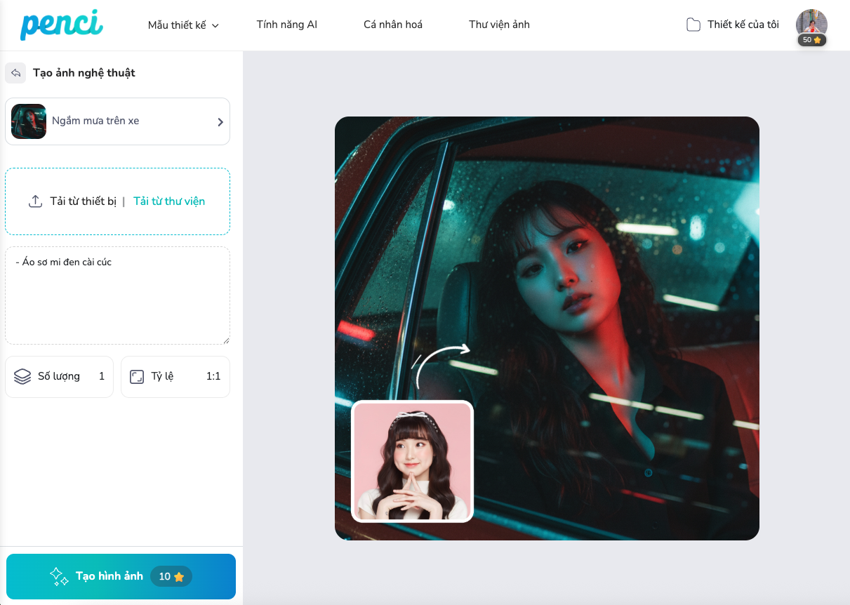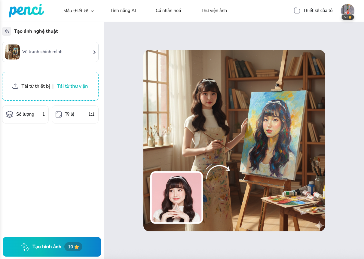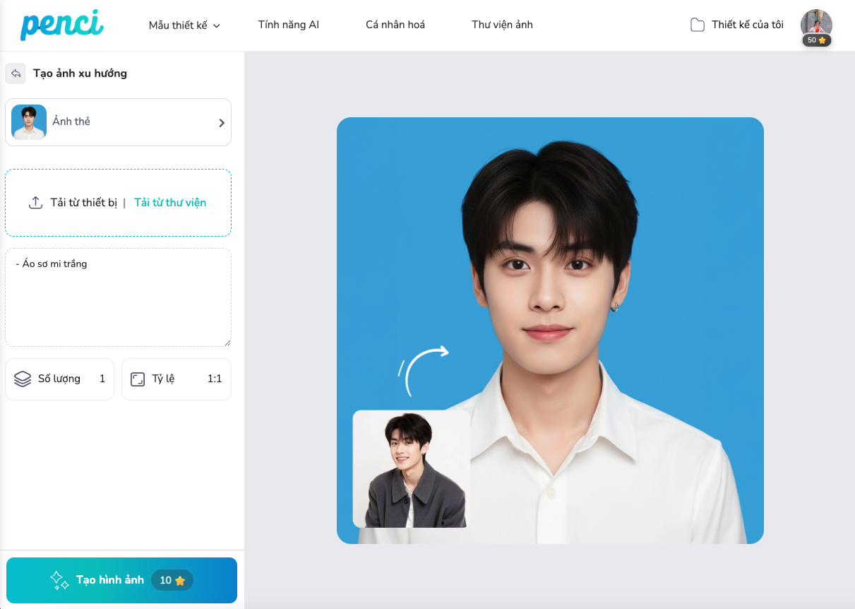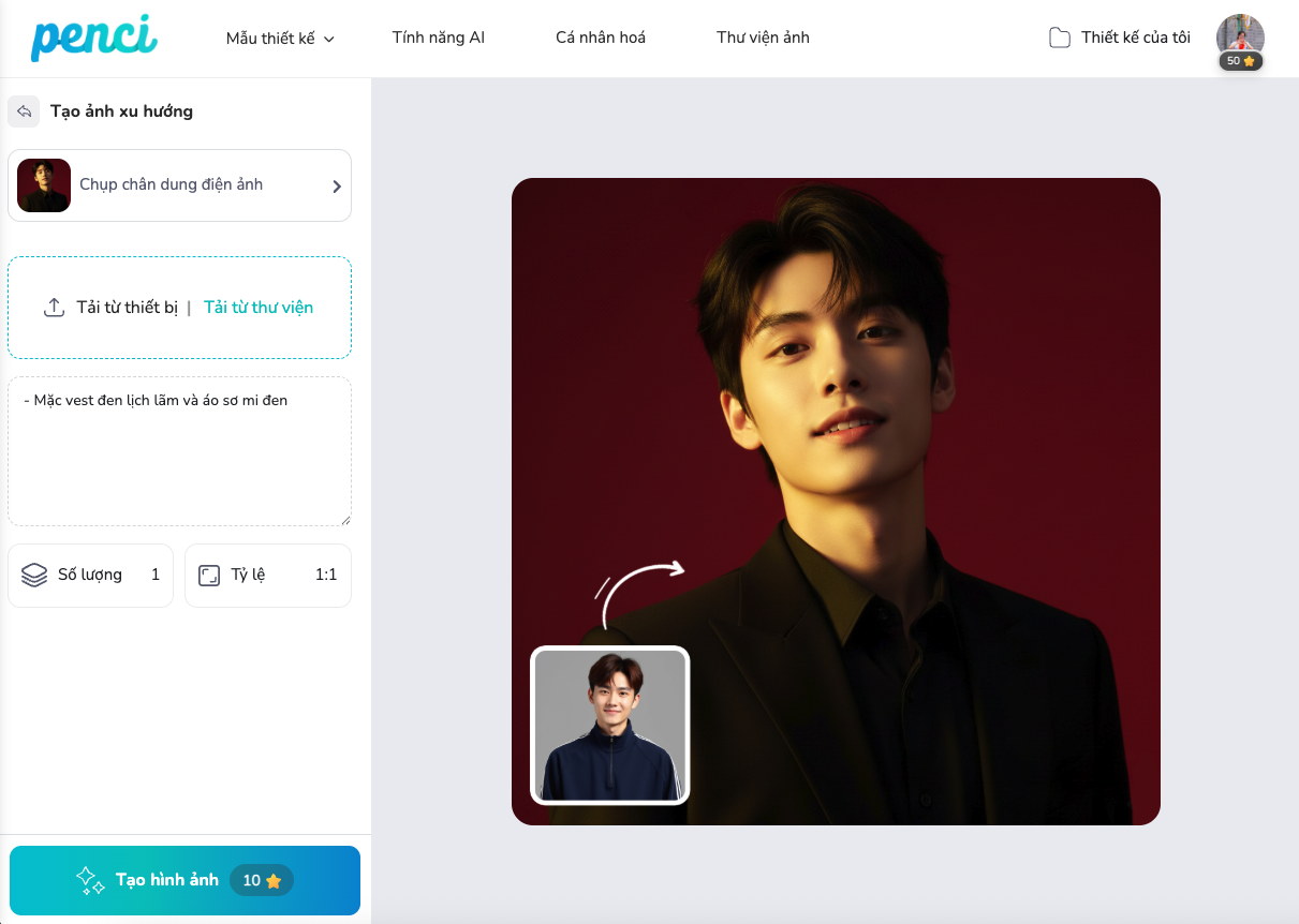 thieke thuvien Phong cách tạo ảnh AI, mô hình 3D xu hướng mà không cần prompt, câu lệnh By admin | 27 tháng 09 năm 2025 356 đã đọc Bạn đã từng nhìn thấy một bức ảnh trending được tạo từ AI và bạn tự hỏi: “Làm sao để tạo ra một tác phẩm tương tự, hoặc thậm chí còn độc đáo hơn?" Với sự phát triển không ngừng của trí tuệ nhân tạo, việc tạo ra những bức ảnh chỉ bằng vài dòng mô tả (prompt) đã trở nên dễ dàng hơn bao giờ hết. Nhưng làm thế nào để bạn có được hình ảnh chất lượng mà không biết cấu trúc prompt, câu lệnh tạo ra chúng? 👉 Bắt đầu: Tạo hình ảnh AI, mô hình 3D xu hướng mà không cần prompt, câu lệnh Nếu bạn đang muốn tạo ra những bức ảnh AI độc đáo, sáng tạo hay hình ảnh anime đẹp mắt nhưng chưa biết bắt đầu từ đâu, thì bài viết này chính là dành cho bạn. Bài viết này tổng hợp các phong cách tạo ảnh AI, mô hình 3D xu hướng, giúp bạn dễ dàng bắt trend chỉ với vài cú click. Tham khảo ngay để áp dụng và khám phá thế giới hình ảnh cực kỳ sống động từ AI nhé. 1. Tổng hợp các phong cách tạo ảnh AI, mô hình 3D xu hướng mà không cần prompt, câu lệnh Tạo ảnh chân dung điện ảnh nền đỏ Bạn chỉ cần tải ảnh chân dung của mình lên vả nhập mô tả trang phục mà bạn muốn. Sau đó hệ thống sẽ tự động áp dụng hiệu ứng nền đỏ đô phong cách điện ảnh, giúp gương mặt nổi bật và chuyên nghiệp. Đợi khoảng 10 giây để nhận kết quả, có thể chỉnh sửa nhiều lần đến khi ưng ý. 👉 Bắt đầu Tạo ảnh chân dung điện ảnh nền đỏ Tạo ảnh trong bảo tàng Bạn chỉ cần tải ảnh lên và nhập mô tả trang phục bạn mong muốn. Công cụ sẽ ghép bạn vào không gian triển lãm, với những bức tranh trên tường chính là chân dung của bạn. Một trải nghiệm thú vị và “ảo” nhưng cực kỳ chân thực. 👉 Bắt đầu Tạo ảnh trong bảo tàng Tạo ảnh Polaroid gặp bản thân lúc nhỏ Để tạo ảnh kỷ niệm độc đáo, bạn chỉ cần tải ảnh hiện tại của mình lên. Công cụ sẽ ghép bạn với phiên bản “chính mình” lúc nhỏ, tạo cảm giác xúc động và thú vị. Nhấn “Tạo ảnh” và kết quả sẽ xuất hiện sau vài giây. 👉 Bắt đầu Tạo ảnh Polaroid gặp bản thân lúc nhỏ Tạo ảnh thẻ (ID Photo) Bạn chỉ cần tải ảnh lên, nhập lại mô tả trang phục, chọn kích thước chuẩn quốc tế hoặc theo nhu cầu. Penci AI sẽ tự động xử lý nền, chỉnh ánh sáng và bố cục đúng quy chuẩn ảnh thẻ. Kết quả sẽ có ngay trong 10 giây. 👉 Bắt đầu Tạo ảnh thẻ (ID Photo) Tạo ảnh Profile nghệ thuật hiệu ứng điện ảnh trắng đen Chỉ cần tải ảnh bạn muốn, hệ thống sẽ biến đổi thành cảnh phim trắng đen, nhân vật đứng trong góc tường với ánh sáng hắt qua cửa sổ. Bạn có thể thử nhiều lần để chọn ra tấm ưng ý nhất. 👉 Bắt đầu Tạo ảnh Profile nghệ thuật hiệu ứng điện ảnh trắng đen Tạo ảnh bản thân ngắm mưa trên xe như phim Hàn Quốc Bạn chỉ cần tải ảnh của mình lên và nhập mô tả trang phục. Công cụ sẽ ghép bạn vào bối cảnh cinematic, ngồi trong xe ngắm mưa như trong phim Hàn. Kết quả được tạo tự động, chỉ mất khoảng 10 giây. 👉 Bắt đầu Tạo ảnh bản thân ngắm mưa trên xe như phim Hàn Quốc Tạo ảnh vẽ tranh chính mình Tải ảnh lên, Penci AI sẽ biến bạn thành họa sĩ, ghép hình ảnh bạn đang vẽ bức tranh màu nước chính chân dung của mình. Một concept sáng tạo và rất nghệ thuật. 👉 Bắt đầu Tạo ảnh vẽ tranh chính mình Tạo ảnh phác thảo chân dung bản thân nét bút chì Tải ảnh chân dung của bạn lên, hệ thống sẽ tự động chuyển đổi thành bản phác thảo chì nghệ thuật, giữ nguyên thần thái và chi tiết. Có thể lặp lại nhiều lần để chọn bản đẹp nhất. 👉 Bắt đầu Tạo ảnh phác thảo chân dung bản thân nét bút chì Tạo ảnh người khổng lồ trong thành phố nhỏ vui nhộn Bạn chỉ cần tải ảnh của mình lên và nhập mô tả thành phố mà bạn muốn “xuất hiện”, công cụ sẽ biến bạn thành nhân vật khổng lồ giữa thành phố tí hon. Hiệu ứng này tạo cảm giác viễn tưởng và ấn tượng thị giác mạnh mẽ. 👉 Bắt đầu Tạo ảnh người khổng lồ trong thành phố nhỏ vui nhộn Ghép ảnh trang phục tốt nghiệp Tải ảnh của bạn lên rồi chọn mẫu áo, mũ tốt nghiệp và mô tả phông nền mà bạn muốn chụp. Penci AI sẽ tự động ghép chỉnh sửa, tạo ảnh kỷ niệm như thật mà không cần thuê máy cơ. 👉 Bắt đầu Ghép ảnh trang phục tốt nghiệp Ghép ảnh bản thân vào concept chụp sinh nhật ở studio Bạn chỉ cần tải ảnh chân dung lên, nhập mô tả bằng tiếng Việt theo gợi ý. Công cụ sẽ ghép bạn vào các concept sinh nhật với bánh, bóng bay, background lung linh. Kết quả trông như chụp tại studio. 👉 Bắt đầu Ghép ảnh bản thân vào concept chụp sinh nhật ở studio 👉 Bắt đầu: Tạo hình ảnh AI, mô hình 3D xu hướng mà không cần prompt, câu lệnh 2. Hướng dẫn tạo ảnh AI, mô hình 3D xu hướng mà không cần prompt, câu lệnh Muốn có một b