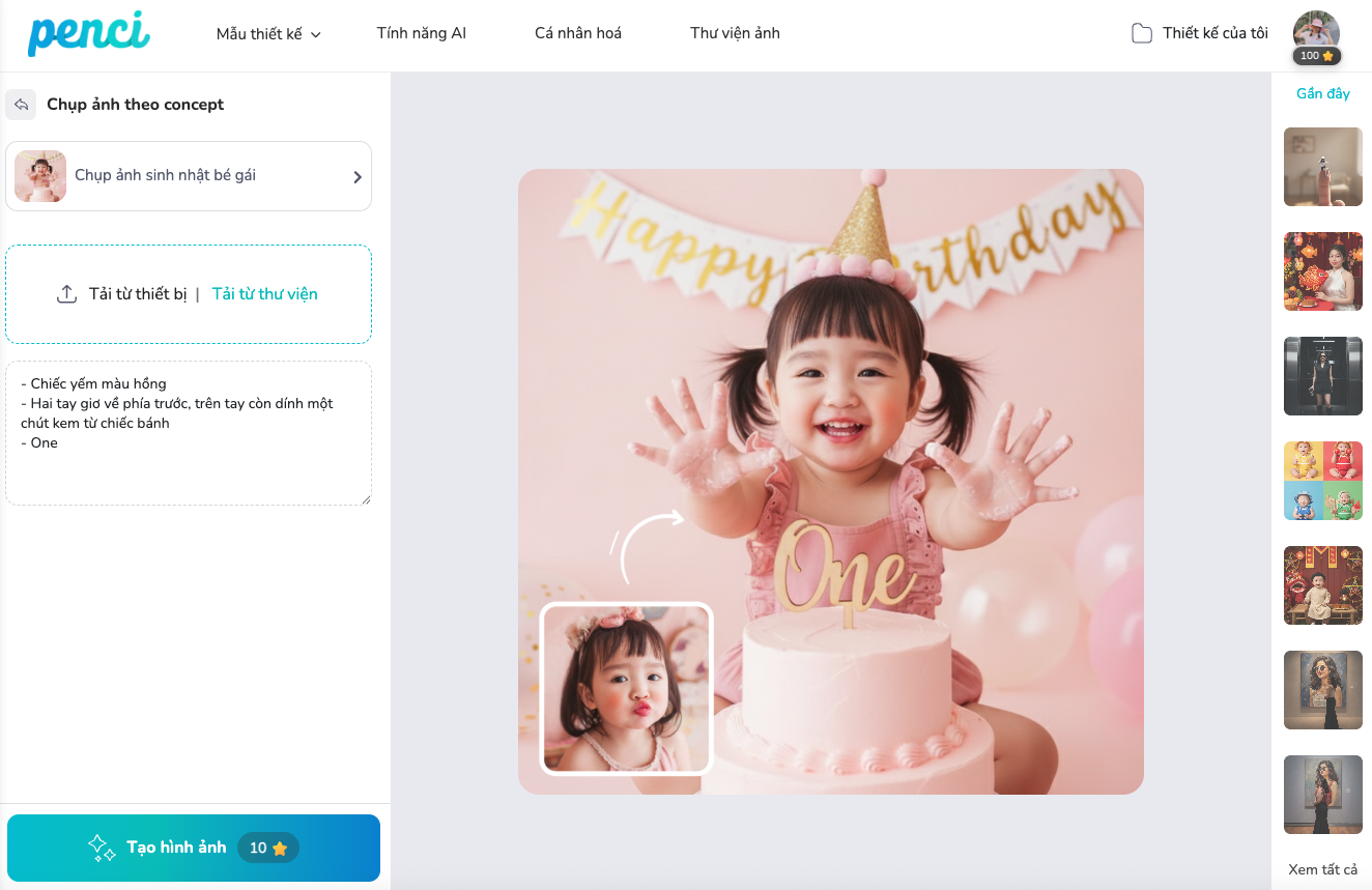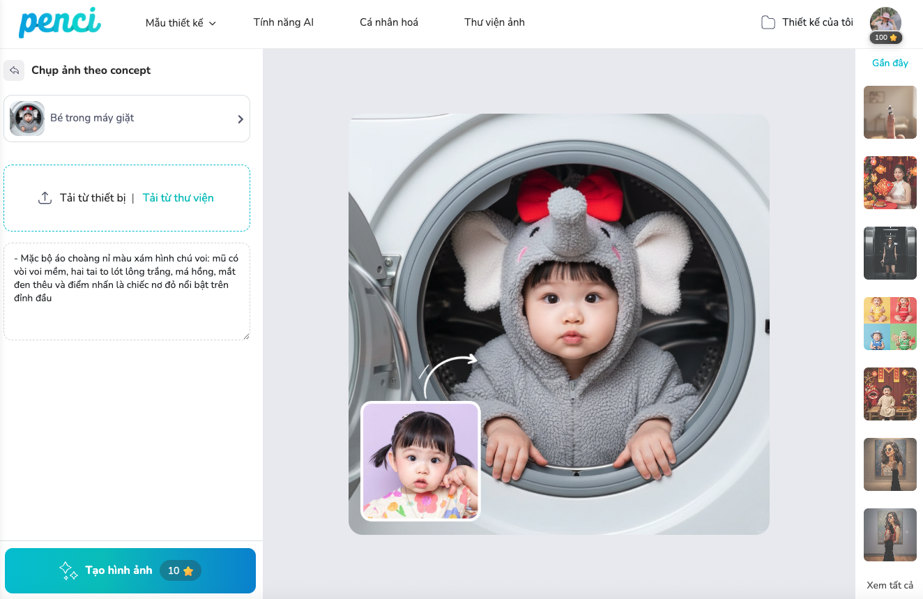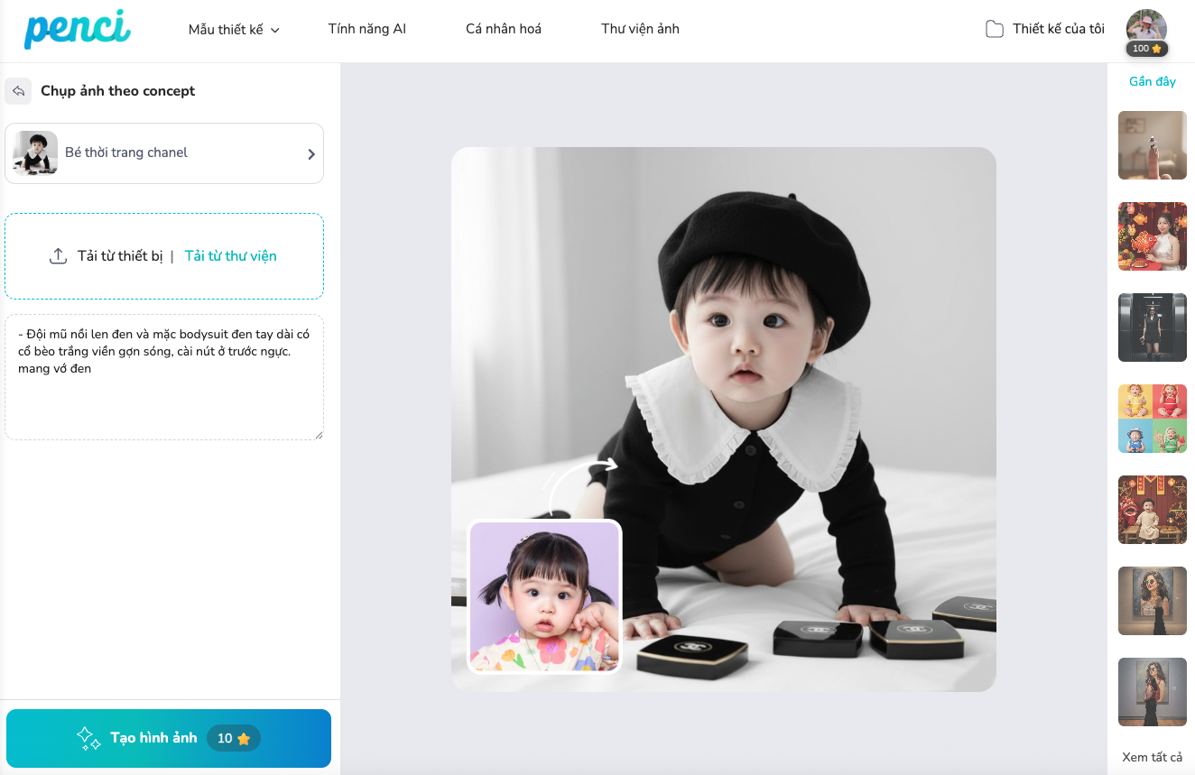 thieke thuvien Tạo ảnh cho bé bằng AI, xu hướng mới cho bố mẹ sáng tạo kỷ niệm By admin | 07 tháng 10 năm 2025 44 đã đọc Trong thời đại công nghệ 5.0, việc lưu giữ khoảnh khắc đáng yêu của con không chỉ gói gọn trong những bức ảnh chụp thông thường. Với công cụ tạo ảnh cho bé bằng AI trên Penci, bố mẹ có thể biến tấm ảnh đời thường thành concept chụp studio chuyên nghiệp, độc đáo và đầy sáng tạo. Đặc biệt, mọi phong cách đã được cài đặt sẵn prompt câu lệnh, bố mẹ không cần phải viết câu lệnh phức tạp. Chỉ cần truy cập vào AI Tools Penci, chọn phong cách rồi tải ảnh bé lên, nhập mô tả (nếu có) và nhận kết quả chỉ sau vài giây. 1. Vì sao nên thử tạo ảnh cho bé bằng AI? Trong vài năm trở lại đây, ảnh AI không chỉ là xu hướng cho người lớn mà còn trở thành lựa chọn thú vị cho các bậc phụ huynh muốn lưu giữ khoảnh khắc tuổi thơ của con. Nếu như trước đây bạn phải dẫn bé ra studio, chuẩn bị trang phục, trang điểm và chụp hàng trăm kiểu để chọn ra vài tấm đẹp, thì nay chỉ cần một bức ảnh chân dung đơn giản là đã có thể tạo ra hàng chục concept độc đáo. Hình ảnh bé được tạo từ Penci AI Một vài điểm cộng nổi bật: Tiết kiệm chi phí: Chỉ bằng vài thao tác, bạn có bộ ảnh “chuẩn studio” mà không cần thuê ekip chuyên nghiệp. An toàn, tiện lợi: Bé không phải di chuyển, không bị mệt khi chụp lâu, bố mẹ có thể chủ động chỉnh sửa nhiều lần. Đa dạng phong cách: Từ sinh nhật lung linh, thời trang cá tính cho tới những concept hài hước như “bé trong máy giặt”, tất cả đều có sẵn để thử nghiệm. Ứng dụng linh hoạt: Ảnh AI không chỉ để ngắm mà còn có thể in thành thiệp mừng sinh nhật, photobook, lịch treo tường, hoặc đơn giản là làm avatar, ảnh bìa Facebook. So với ảnh chụp truyền thống, ảnh AI có lợi thế ở sự sáng tạo không giới hạn. Bạn có thể cho bé “đứng cạnh chú vịt vàng đáng yêu” hay “hóa thân thành đầu bếp nhí trong căn bếp xinh xắn” những concept mà bé yêu khó lòng phối hợp cùng studio để thực hiện. Với Penci AI, mọi thao tác đã được đơn giản hóa. Các câu lệnh (prompt) đều được cài đặt sẵn, bố mẹ chỉ cần tải ảnh bé lên, nhập thêm một số chi tiết như trang phục hay nhân vật yêu thích nếu muốn, và nhấn “Tạo ảnh”. Chỉ sau 10 giây, bộ ảnh mới đã sẵn sàng để lưu giữ hoặc chia sẻ cùng bạn bè. 2. Gợi ý các phong cách tạo ảnh cho bé bằng AI thông minh tích hợp tại Penci.vn Bố mẹ cùng tham khảo các phong cách tạo ảnh với AI dưới đây để tạo nên bộ sưu tập ảnh kỷ niệm tuyệt đẹp cho bé yêu nha. Tạo ảnh chụp sinh nhật bé gái Với phong cách này, ảnh của bé sẽ được ghép vào concept sinh nhật lung linh, có bánh kem lớn, số tuổi nổi bật trong không gian studio sang trọng. Bố mẹ chỉ cần nhập mô tả về trang phục, cử chỉ của bé và số tuổi trên bánh kem, sau đó nhấn tạo ảnh. Kết quả sẽ mang lại bộ ảnh kỷ niệm sinh nhật độc đáo, như được chụp tại studio chuyên nghiệp. 👉 Bắt đầu Tạo ảnh chụp sinh nhật bé gái Tạo ảnh bé cùng quả ngọt Nếu bạn muốn những bức hình đơn giản nhưng đáng yêu, hãy thử phong cách này. AI sẽ tự động tạo 4 bức ảnh bé cùng 4 loại quả khác nhau với màu nền tương ứng. Bố mẹ không cần nhập mô tả, chỉ cần tải ảnh bé lên là có ngay loạt ảnh rực rỡ, ngọt ngào. 👉 Bắt đầu Tạo ảnh bé cùng quả ngọt Tạo ảnh bé làm đầu bếp nhí Hãy để bé trở thành một đầu bếp nhí dễ thương. Chỉ cần nhập mô tả trang phục (ví dụ: áo bếp, mũ bếp), công cụ sẽ ghép bé vào khung bếp với đồ ăn xinh xắn đầy màu sắc. Đây sẽ là concept tuyệt vời cho bố mẹ muốn tạo kỷ niệm vui nhộn. 👉 Bắt đầu Tạo ảnh bé làm đầu bếp nhí Tạo ảnh bé với vịt vàng Ảnh bé sẽ được ghép vào bối cảnh có những chú vịt vàng đáng yêu. Bố mẹ có thể nhập mô tả trang phục để làm cho ảnh thêm hài hòa, sinh động. 👉 Bắt đầu Tạo ảnh bé với vịt vàng Tạo ảnh bé với trái cây Nếu bạn muốn bé xuất hiện trong khung cảnh vui tươi, nhiều màu sắc, hãy chọn concept bé cùng trái cây. Chỉ cần nhập mô tả trang phục, AI sẽ tự động tạo nên những bức ảnh sống động, dễ thương. 👉 Bắt đầu Tạo ảnh bé với trái cây Tạo ảnh bé thời trang Chanel Cho bé thử hóa thân thành fashionista nhí với phong cách thời trang sang trọng. Bố mẹ chỉ cần nhập mô tả trang phục, AI sẽ ghép ảnh bé vào concept thời trang Chanel độc đáo và cá tính. 👉 Bắt đầu Tạo ảnh bé thời trang Chanel Tạo ảnh bé trong vai Ajuma Phong cách này mang lại sự hài hước và đáng yêu khi bé được hóa thân thành Ajuma Hàn Quốc. Chỉ cần nhập mô tả trang phục, công cụ sẽ tạo ngay loạt ảnh thú vị, khiến bố mẹ không khỏi bật cười. 👉 Bắt đầu Tạo ảnh bé trong vai Ajuma Tạo ảnh bé trong máy giặt Một concept độc đáo và đầy sáng tạo: bé xuất hiện trong chiếc máy giặt với nhiều chi tiết