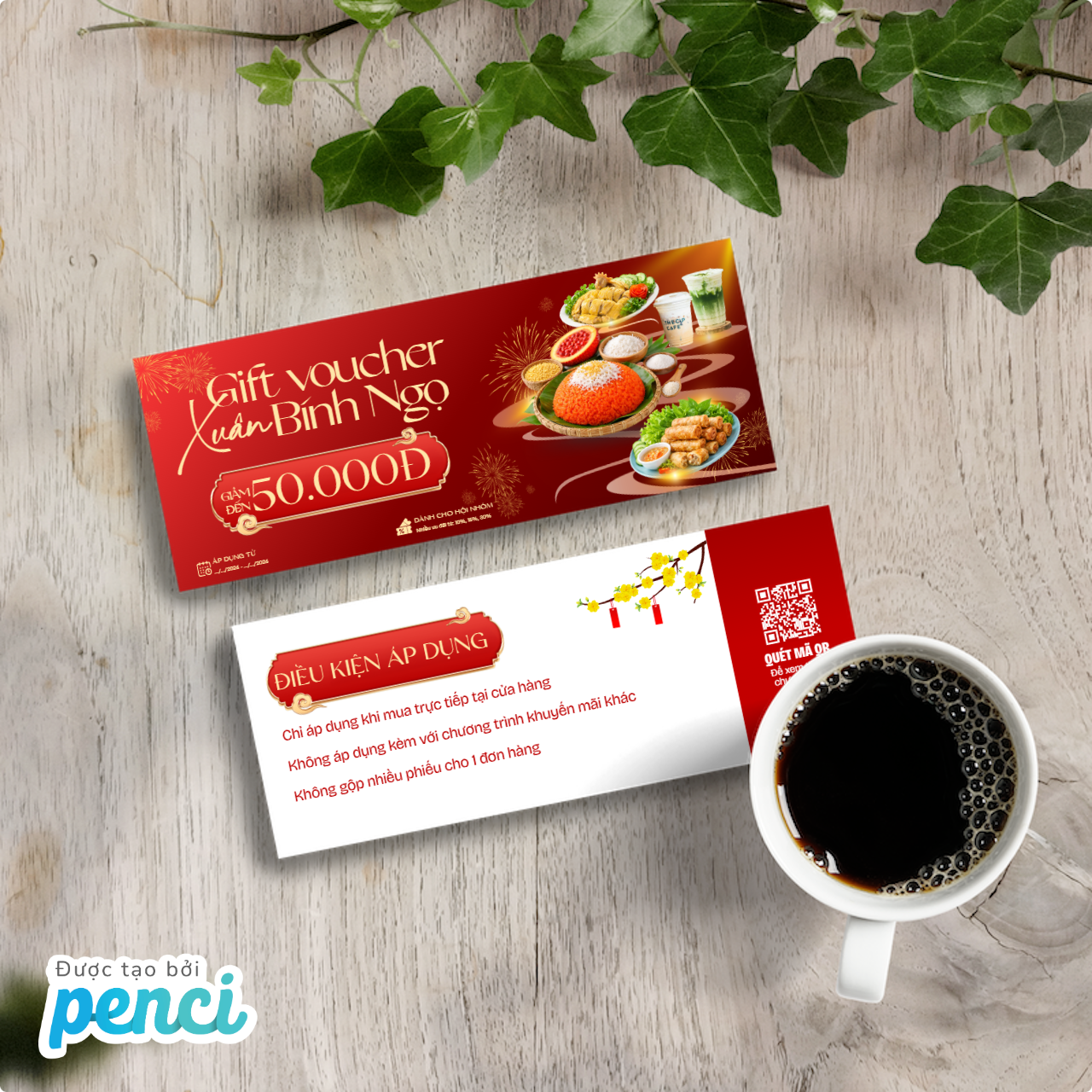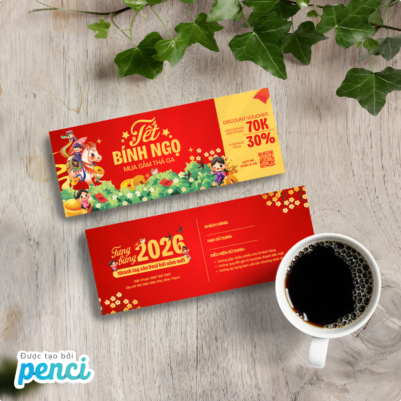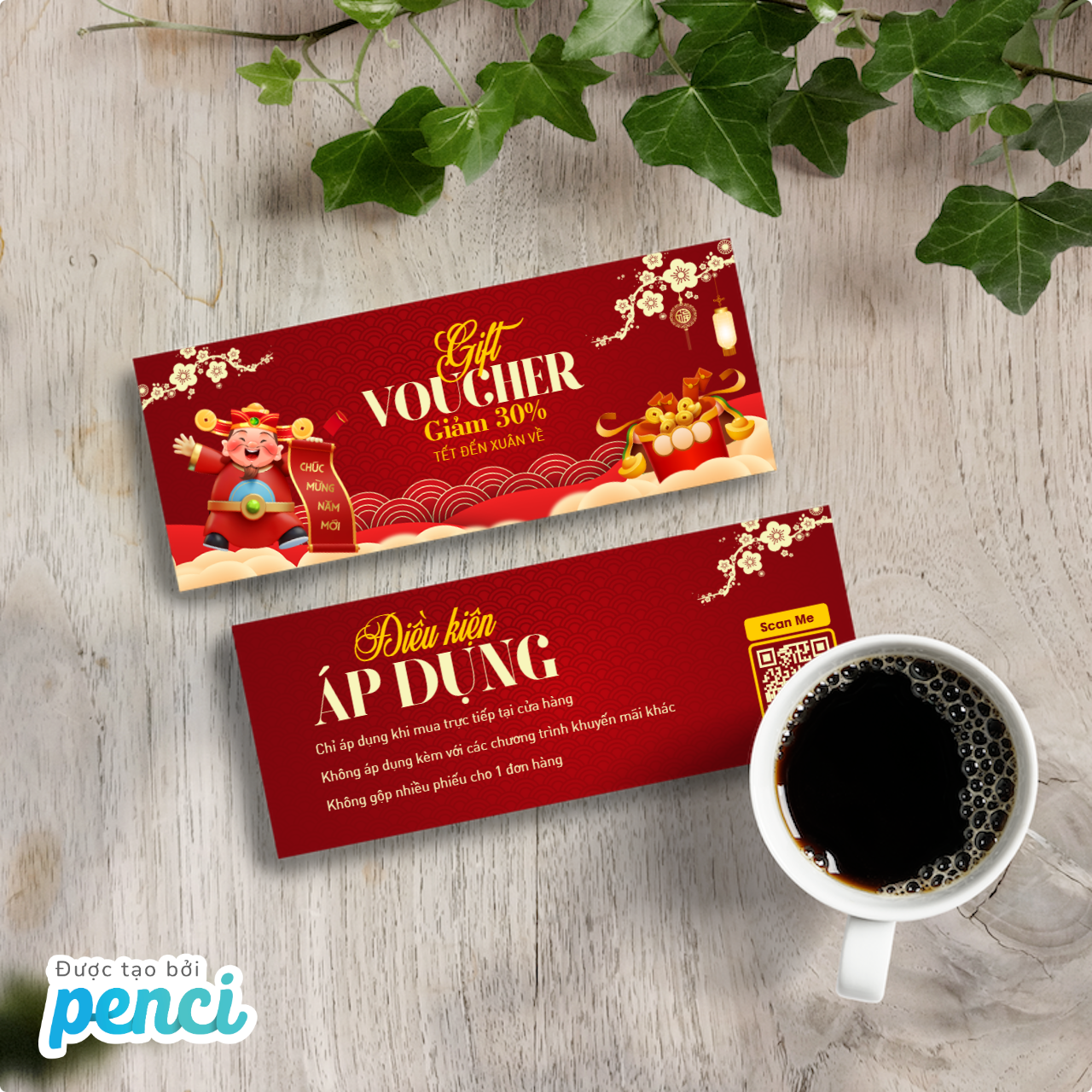thieke thuvien Tổng hợp 29+ mẫu Voucher giảm giá, Phiếu quà tặng Tết 2026 đẹp, ấn tượng cho mọi ngành hàng, tải xuống miễn phí By admin | 08 tháng 01 năm 2026 32 đã đọc Nếu bạn đang tìm mẫu voucher giảm giá Tết 2026 để triển khai chương trình khuyến mãi Tết hiệu quả? Tham khảo ngay bộ phiếu quà tặng Tết, gift voucher cho năm mới ngay trong bài viết này. Các mẫu voucher Tết được thiết kế sẵn miễn phí, phù hợp cho mọi lĩnh vực như siêu thị, nhà hàng, quán cafe, quán ăn, spa, khách sạn, du lịch, shop quần áo cũng như các voucher doanh nghiệp cho dịp Tết. Bạn có thể thiết kế voucher Tết online, tùy chỉnh cá nhân hóa nội dung dễ dàng, chỉnh sửa trực tiếp theo nhu cầu và đặt in voucher Tết theo yêu cầu với số lượng nhiều hoặc ít tùy nhu cầu. Hãy cùng Penci tham khảo ngay mẫu voucher Tết bên dưới! >> Tham khảo thêm các mẫu nhãn dán decal, tem dán sản phẩm cho dịp Tết Bính Ngọ 2026 1. Vì sao doanh nghiệp nên dùng voucher giảm giá Tết 2026 cho chương trình khuyến mãi? Trong chương trình khuyến mãi Tết Bính Ngọ, người tiêu dùng thường có xu hướng chi tiêu mạnh tay hơn, đặc biệt cho các nhu cầu ăn uống, làm đẹp và mua sắm dịp Tết. Thay vì áp dụng hình thức giảm giá trực tiếp, nhiều doanh nghiệp hiện nay ưu tiên sử dụng voucher quà Tết, voucher giảm giá Tết hoặc phiếu quà tặng Tết như một giải pháp khuyến mãi thông minh và linh hoạt hơn. Việc triển khai voucher giảm giá Tết 2026 mang lại nhiều lợi ích như: - Kích thích khách hàng quay lại mua sắm nhiều lần, từ đó gia tăng tần suất sử dụng dịch vụ hoặc sản phẩm- Tạo động lực gia tăng giá trị đơn hàng trung bình, khi khách hàng có xu hướng mua thêm để tận dụng voucher- Dễ dàng kiểm soát chi phí khuyến mãi, phù hợp cho cả cửa hàng nhỏ lẫn voucher doanh nghiệp Tết Voucher giảm giá thường được sử dụng rộng rãi trong các chương trình khuyến mãi Tết >> Xem thêm các mẫu standee Tết 2026 ấn tượng và thu hút khách từ cái nhìn đầu tiên Không chỉ dừng lại ở giá trị ưu đãi, các thẻ quà tặng Tết hay voucher lì lì Tết cho khách hàng còn mang ý nghĩa tri ân khách hàng dịp Tết, góp phần xây dựng mối quan hệ lâu dài với khách hàng và các đối tác lâu năm. Đây cũng là lý do vì sao mẫu gift voucher, mẫu phiếu quà tặng hay các mẫu voucher giảm giá Tết 2026 ngày càng được nhiều doanh nghiệp lựa chọn trong mùa Tết năm nay. 2. Tổng hợp các mẫu Voucher giảm giá, Phiếu quà tặng Tết 2026 đẹp nhất cho mọi ngành hàng Dưới đây là bộ mẫu voucher giảm giá Tết 2026, phiếu quà tặng Tết và gift voucher Tết được thiết kế sẵn, phù hợp cho nhiều ngành hàng khác nhau như cửa hàng bán lẻ, quán ăn, quán cà phê, spa, dịch vụ làm đẹp và voucher doanh nghiệp Tết. Các mẫu voucher Tết thiết kế sẵn có thể chỉnh sửa online, cá nhân hóa nội dung nhanh chóng và sử dụng ngay cho chương trình khuyến mãi Tết Bính Ngọ, giúp doanh nghiệp tiết kiệm thời gian mà vẫn đảm bảo tính chuyên nghiệp. Mẫu voucher giảm giá Tết 2026 cho chương trình khuyến mãi Tết Gift voucher Tết sang trọng cho nhà hàng, quán ăn Voucher giảm giá Tết cho shop thời trang cho hoạt động khuyến mãi Tết Bính Ngọ Phiếu quà tặng Tết doanh nghiệp dùng tri ân khách hàng Voucher lì lì Tết cho khách hàng với thiết kế đẹp, ấn tượng Mẫu gift voucher Tết 2026 cho spa và dịch vụ làm đẹp thu hút Thiết kế Phiếu giảm giá Tết 2026 đẹp, đơn giản Mẫu Voucher Tết giảm giá theo phần trăm cho cửa hàng Gift voucher Tết sang trọng, nổi bật cho dịp Tết Bính Ngọ 2026 >> Xem ngay toàn bộ mẫu Gift Voucher Tết 2026 đặc sắc và độc quyền của Penci 3. Hướng dẫn thiết kế & in Voucher giảm giá Tết 2026 nhanh gọn chỉ với Penci Để triển khai các chương trình khuyến mãi với voucher giảm giá Tết 2026, phiếu quà tặng hay gift voucher Tết, bạn không cần kỹ năng thiết kế chuyên nghiệp hay phải làm việc với nhiều bên khác nhau. Với Penci, toàn bộ quy trình từ chọn mẫu > thiết kế > in ấn đều được thực hiện trên cùng một nền tảng, giúp tiết kiệm thời gian và đảm bảo tính đồng bộ cho voucher doanh nghiệp Tết và voucher Tết cho cửa hàng. Bước 1: Truy cập penci.vn và chọn mẫu Gift Voucher Tết phù hợp Truy cập nền tảng penci.vn, chọn danh mục Gift Voucher Tại đây, bạn có thể dễ dàng tìm thấy mẫu gift voucher Tết 2026, mẫu voucher giảm giá và phiếu quà tặng Tết Bính Ngọ đẹp được thiết kế sẵn phù hợp với từng ngành hàng như cửa hàng bán lẻ, quán ăn, quán cà phê, spa, dịch vụ làm đẹp hay doanh nghiệp. Các mẫu Gift Voucher Tết 2026 sinh động phù hợp cho mọi ngành hàng Bước 2: Thiết kế và cá nhân hóa thông tin cửa hàng, doanh nghiệp Sau khi chọn mẫu, bạn có thể thiết kế voucher Tết online, chỉnh sửa trực tiếp các nội dung quan trọng như: - Tên cửa hàng hoặc doanh nghiệp- Logo, màu sắc thương hiệu- Giá trị voucher, điều kiện sử dụng- Thông điệp và lời chúc Tết Quá trình cá nhân hóa, chỉnh sửa mẫu thiết kế voucher online được tối 