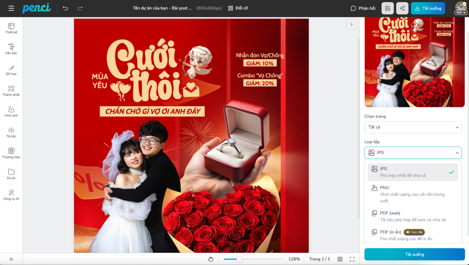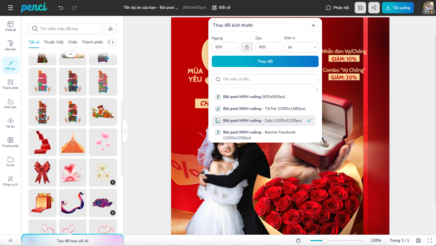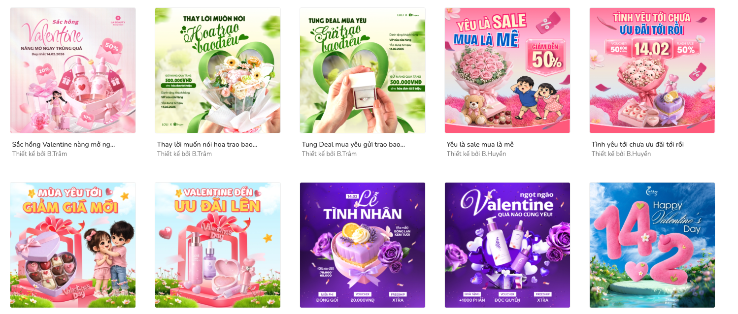 thieke thuvien Tổng hợp các mẫu poster Valentine online đẹp, sáng tạo nhất 2026 By admin | 29 tháng 01 năm 2026 181 đã đọc Valentine 14/2 là một trong những mùa cao điểm truyền thông quan trọng đối với cửa hàng, thương hiệu và doanh nghiệp ở nhiều lĩnh vực khác nhau. Từ bán lẻ, F&B, quà tặng đến dịch vụ, việc chuẩn bị poster online cho Valentine phù hợp không chỉ giúp thu hút sự chú ý mà còn góp phần truyền tải thông điệp khuyến mãi, sản phẩm và cảm xúc của mùa lễ tình nhân. Trong bài viết này, bạn sẽ tìm hiểu tổng quan về nguồn gốc và ý nghĩa của ngày Valentine 14/2, những lợi ích khi sử dụng poster Valentine trong hoạt động kinh doanh, đồng thời tham khảo các mẫu poster Valentine dùng cho in ấn và đăng online. Cuối bài là hướng dẫn chi tiết cách chỉnh sửa poster Valentine trực tiếp trên Penci để bạn có thể sử dụng ngay cho chiến dịch năm 2026. 1. Nguồn gốc và ý nghĩa của ngày Lễ Tình Nhân 14/2 Ngày Lễ Tình Nhân 14/2, hay còn gọi là Valentine’s Day, là dịp để mọi người bày tỏ tình cảm với người yêu, bạn đời hoặc những người quan trọng trong cuộc sống. Theo nhiều tài liệu, ngày Valentine gắn liền với câu chuyện về Thánh Valentine, Người là biểu tượng cho sự hy sinh và tình yêu chân thành. Trải qua thời gian, Valentine không chỉ dành cho các cặp đôi mà còn mở rộng ý nghĩa sang sự quan tâm, trân trọng và kết nối. Chính vì vậy, đây cũng là dịp nhiều cửa hàng và doanh nghiệp triển khai các hoạt động truyền thông, khuyến mãi và quà tặng nhằm gắn kết khách hàng. 👉 Tìm hiểu thêm về Ngày lễ Tình nhân, Valentine 14/2 2. Poster mùa Valentine đem lại những lợi ích gì cho cửa hàng, doanh nghiệp? Poster Valentine là một trong những ấn phẩm truyền thông dễ làm mà còn mang lại hiệu quả rõ rệt nếu được sử dụng đúng thời điểm. Đối với poster dạng bảng đặt tại cửa hàng Poster in đặt tại cửa hàng giúp thu hút sự chú ý của khách hàng ngay từ điểm chạm đầu tiên. Thông qua poster, cửa hàng có thể truyền tải thông tin về chương trình khuyến mãi, sản phẩm nổi bật hoặc thông điệp dành riêng cho mùa lễ tình nhân. Poster đặt ở cửa hàng Việc sử dụng poster còn giúp không gian bán hàng trở nên đồng bộ với không khí mùa lễ, tạo cảm giác chuyên nghiệp và chỉn chu hơn trong mắt khách hàng. Đối với poster dạng đăng online Poster Valentine đăng online giúp thương hiệu tiếp cận khách hàng nhanh chóng thông qua mạng xã hội, website hoặc các nền tảng truyền thông khác. Đây là cách hiệu quả để thông báo chương trình ưu đãi, giới thiệu sản phẩm hoặc duy trì sự hiện diện của thương hiệu trong mùa cao điểm. Poster online giúp tiếp cận khách hàng tiềm năng So với in ấn, poster online dễ chỉnh sửa, dễ thay đổi nội dung và phù hợp với nhiều kênh truyền thông khác nhau. 3. Tổng hợp các mẫu poster Valentine online, social post phổ biến Poster Valentine online thường được sử dụng trên mạng xã hội, website hoặc các kênh truyền thông số. Các mẫu này ưu tiên sự linh hoạt và khả năng chỉnh sửa nhanh. Mẫu poster Valentine dùng để đăng tải trên các nền tảng trực tuyến Poster phù hợp sử dụng trong các bài đăng truyền thông mùa lễ tình nhân Mẫu poster cho phép thay đổi nội dung để phù hợp từng kênh đăng Poster Valentine hỗ trợ truyền tải thông điệp ngắn gọn và dễ hiểu Mẫu poster có thể sử dụng cho nhiều mục đích truyền thông khác nhau Poster Valentine dễ chỉnh sửa và sử dụng ngay Mẫu poster phù hợp cho các chiến dịch online ngắn hạn 👉 Xem thêm các mẫu poster Valentine online dễ tùy chỉnh tại thư viện Penci. 4. Cách chỉnh sửa mẫu poster Valentine online ngay trên Penci Việc chỉnh sửa poster Valentine online giúp cửa hàng và doanh nghiệp chủ động hơn trong quá trình triển khai chiến dịch mùa lễ tình nhân. Thay vì mất thời gian thiết kế từ đầu hoặc phụ thuộc vào bên thứ ba, bạn có thể tự tạo poster phù hợp chỉ trong vài bước đơn giản, đồng thời linh hoạt điều chỉnh nội dung theo từng kênh sử dụng. Bước 1: Chọn mẫu poster Valentine phù hợp Truy cập thư viện poster Valentine trên Penci, tại đây các mẫu poster đã được thiết kế sẵn theo nhiều mục đích sử dụng khác nhau như trưng bày tại cửa hàng, truyền thông mạng xã hội hoặc quảng bá chương trình ưu đãi. Việc lựa chọn mẫu phù hợp với nội dung cần truyền thông sẽ giúp bạn tiết kiệm thời gian chỉnh sửa và đảm bảo bố cục chuẩn với hình thức in ấn hoặc đăng online. Chọn mẫu có sẵn trong thư viện Bước 2: Tùy chỉnh nội dung chữ và hình ảnh Sau khi chọn mẫu, bạn có thể chỉnh sửa toàn bộ nội dung chữ trên poster như thông điệp Valentine, tên chương trình, thời gian áp dụng hoặc thông tin cửa hàng. Nếu cần, bạn cũng có thể thay thế hình ảnh sẵn có bằng hình ảnh sản phẩm hoặc hình ảnh thương hiệu để poster mang dấu ấn riêng. Cá nhân hóa nội dung giúp poster không bị rập khuôn, đồng thời phù hợp hơn với từng chiến dịch, từng cửa h