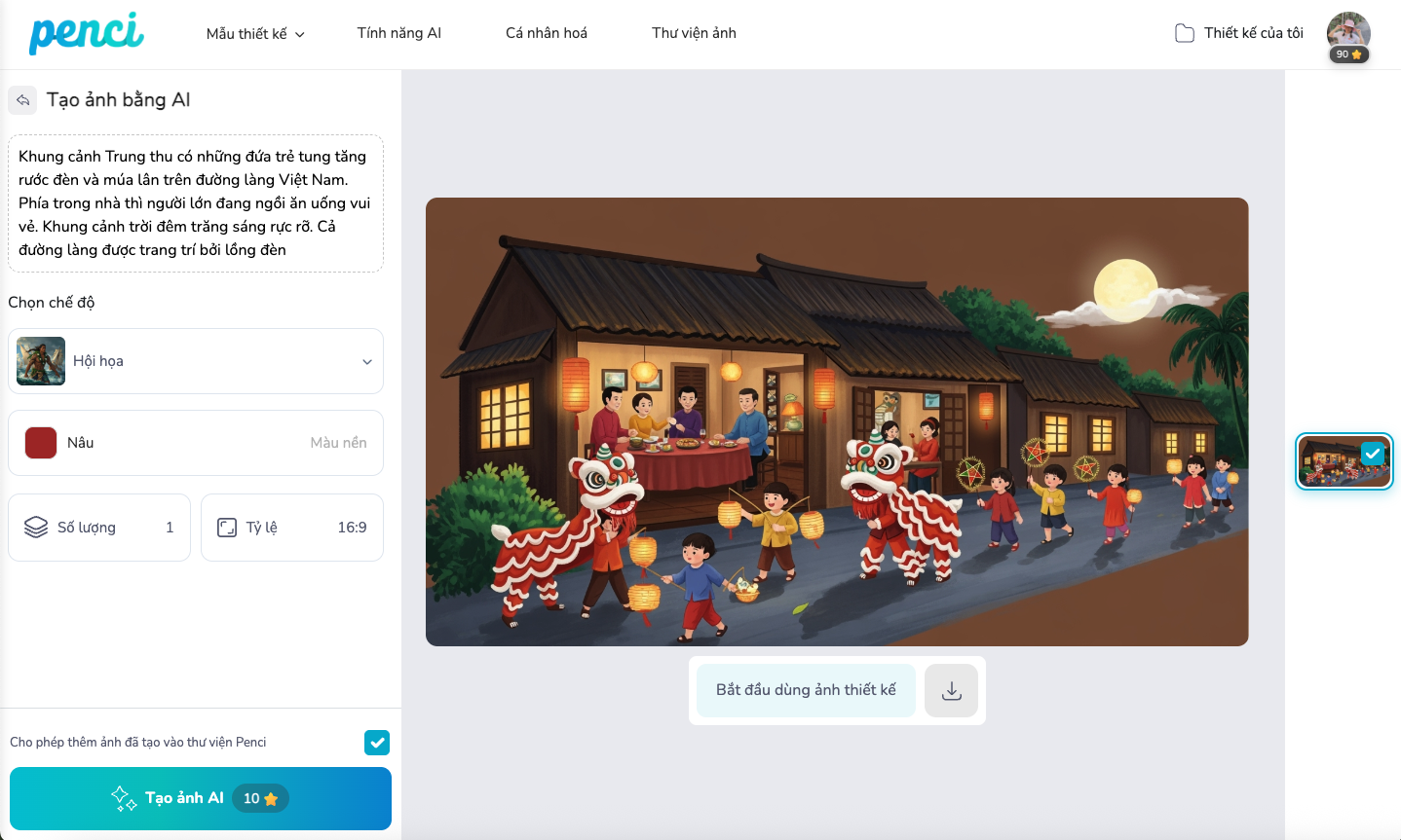 thieke thuvien Tổng hợp hình ảnh Tết Trung thu đẹp, chất lượng và mới nhất năm 2025 By admin | 02 tháng 10 năm 2025 1691 đã đọc Tết Trung thu 2025 đang đến gần, đây là dịp mà mọi gia đình Việt đều mong chờ để cùng nhau sum vầy bên ánh trăng rằm, mâm cỗ, bánh nướng và tiếng trống lân rộn ràng. Để bạn có thể sáng tạo, trang trí và truyền tải tinh thần Trung thu theo cách riêng, Penci mang đến bộ sưu tập hình ảnh và đồ hoạ Trung thu đẹp, chất lượng cao và mới nhất. Từ đồ hoạ Trung thu vẽ tay độc quyền, hình ảnh chụp sưu tầm gợi không khí Trung thu truyền thống cho đến hình ảnh Trung thu tạo từ AI đầy sáng tạo, hợp xu hướng đều được tổng hợp trong bài viết này. 1. Đồ hoạ vẽ tay độc quyền bởi hoạ sĩ nhà Penci Điểm nhấn lớn nhất trong kho mẫu thiết kế Trung thu tại Penci chính là đồ hoạ vẽ tay được thực hiện bởi đội ngũ hoạ sĩ Việt. Từng nét vẽ đều mang phong vị truyền thống, từ lồng đèn ngôi sao, múa lân, trăng rằm đến mâm cỗ. Tìm và sử dụng đồ hoạ Trung thu vẽ tay tại đây. Xem thêm đồ hoạ Trung thu vẽ tay 👉 Vì là mẫu độc quyền, số mẫu giới hạn, nên bạn hoàn toàn yên tâm khi sử dụng trong thiết kế poster, banner, thiệp chúc mừng hay ấn phẩm in ấn cá nhân, đảm bảo không trùng lặp với bất kỳ nguồn ảnh stock nào. Đây chính là chất liệu lý tưởng để các thương hiệu tạo ra thiết kế đậm chất Việt, riêng biệt và chuyên nghiệp. 2. Hình ảnh chụp sưu tầm Trung thu Bên cạnh đồ hoạ vẽ tay, Penci cũng gợi ý cho bạn bộ hình ảnh chụp Trung thu được sưu tầm chọn lọc từ Thư viện ảnh Penci. Hình ảnh về những con phố treo đèn lồng rực rỡ, cảnh trẻ nhỏ rước đèn, cho tới hình ảnh mâm cỗ gia đình ấm áp. Xem thêm và tải hình ảnh Trung thu sắc nét, chất lượng cao tại đây. 👉 Đây là nguồn hình ảnh chân thực, gần gũi, phù hợp làm nền cho thiết kế, ảnh minh hoạ bài viết, hay sử dụng trong ấn phẩm truyền thông cần sự sống động và giàu cảm xúc. 3. Hình ảnh Trung thu được tạo từ AI Xu hướng thiết kế năm 2025 không thể thiếu sự góp mặt của AI tạo hình ảnh. Với Penci, bạn có thể dễ dàng tạo ra những hình ảnh Trung thu độc đáo từ phong cách tranh vẽ hoạt họa đáng yêu, cảnh phố cổ Hội An lung linh dưới trăng, cho tới những ý tưởng sáng tạo “không có ngoài đời thực” nhưng lại cực hút mắt. Tạo ảnh Thu thu với AI bằng câu lệnh mô tả tiếng Việt tại đây. 👉 Hình ảnh tạo từ AI giúp bạn có thêm chất liệu mới mẻ, linh hoạt trong thiết kế social post, minigame, thư mời online hay bộ nhận diện sự kiện online. Kết hợp cùng đồ hoạ vẽ tay và ảnh chụp sưu tầm, bạn sẽ có một kho ý tưởng Trung thu vừa hiện đại vừa giàu bản sắc. Tạo ảnh Trung thu từ AI vô cùng đơn giản Trên đây là bộ sưu tập hình ảnh và đồ hoạ Trung thu 2025 mà Penci đã tổng hợp từ độc quyền vẽ tay, ảnh chụp chân thực cho tới hình ảnh AI sáng tạo. Mỗi nhóm đều có ưu điểm riêng, giúp bạn dễ dàng ứng dụng cho mục đích cá nhân hoặc thương hiệu. Trung thu này, đừng chỉ sưu tầm ảnh hãy để Penci giúp bạn biến hình ảnh thành thiết kế độc quyền, tinh tế và sẵn sàng để in ấn với tính năng tạo ảnh AI bằng câu lệnh tiếng Việt. Khám phá ngay kho mẫu thiết kế Trung thu tại Penci.vn và bắt đầu tạo ấn phẩm cho riêng bạn. Penci - Thiết kế dễ dàng, đậm chất Việt Đã sao chép