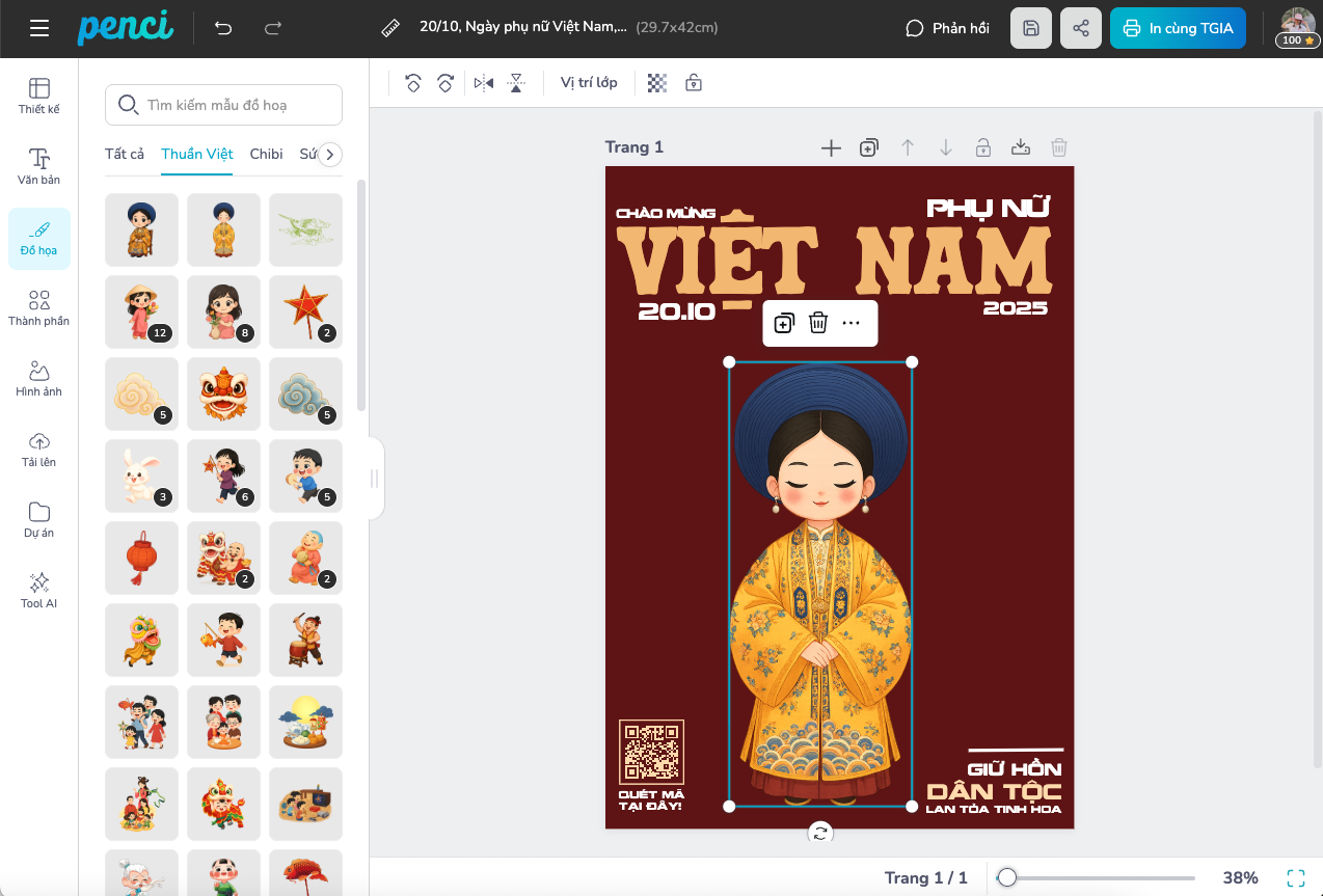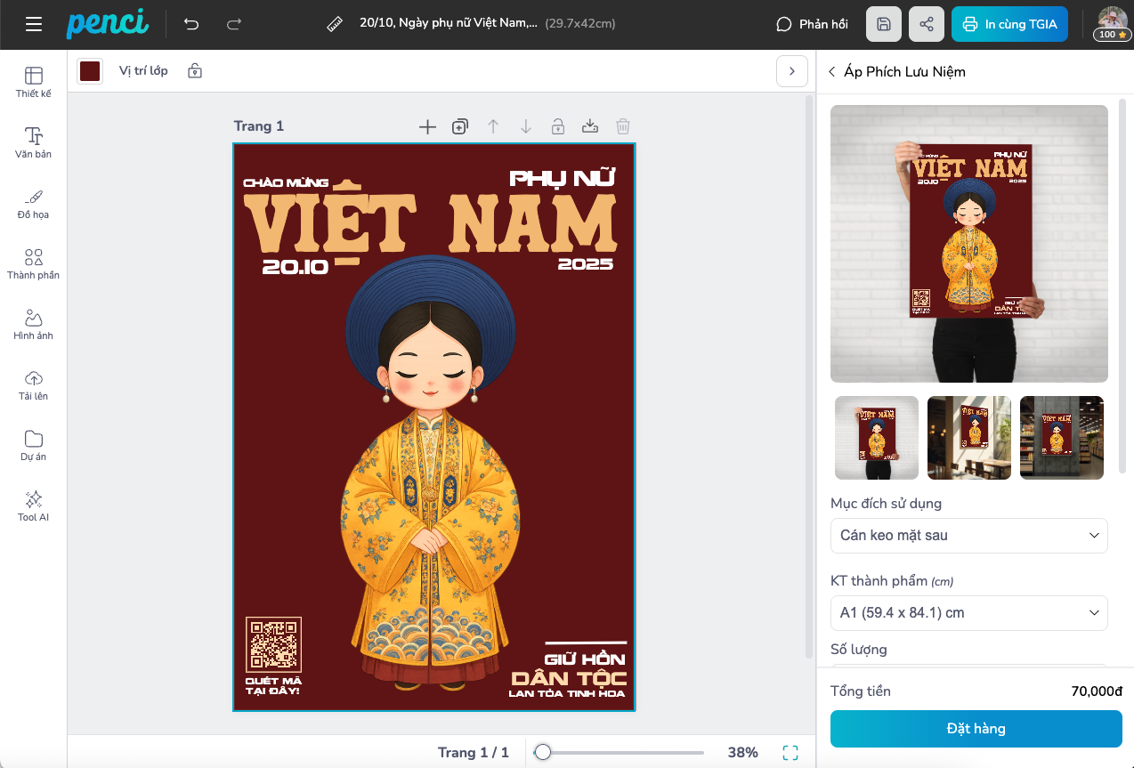 thieke thuvien Tổng hợp mẫu Poster 20/10 sáng tạo, Social Post ngày Phụ nữ Việt Nam ấn tượng bạn nên tham khảo By admin | 14 tháng 10 năm 2025 2126 đã đọc Poster 20/10 không chỉ là một ấn phẩm trang trí hay truyền thông, mà còn là cách để mỗi cá nhân, tổ chức gửi gắm lời tri ân đến những người phụ nữ xung quanh mình. Dù bạn là chủ cửa hàng muốn thiết kế poster ưu đãi, doanh nghiệp cần làm poster chúc mừng nhân viên, hay chỉ đơn giản muốn chia sẻ social post 20/10 lên mạng xã hội. Tại Penci.vn có hàng trăm mẫu sáng tạo, đậm bản sắc Việt Nam để bạn chọn lựa. Điểm đặc biệt của Penci không nằm ở số lượng mẫu, mà ở tinh thần “thiết kế thuần Việt”. Mỗi poster được đội ngũ thiết kế Penci sáng tạo, sử dụng màu sắc, hoa văn, phông chữ mang cảm hứng từ văn hoá Việt từ tà áo dài, nón lá, đến sắc hồng phấn nhẹ nhàng của mùa thu Hà Nội. Bộ sưu tập poster 20/10 mới nhất 2025 vì thế vừa hiện đại, vừa gần gũi, phù hợp cho mọi mục đích sử dụng: in ấn, trưng bày, hoặc truyền thông online. 1. Mẫu Poster chúc mừng 20/10 sáng tạo cho cửa hàng Ngày Phụ nữ Việt Nam là dịp tuyệt vời để các cửa hàng, thương hiệu nhỏ thể hiện sự tri ân đến khách hàng nữ, là những người luôn góp phần làm nên doanh thu, niềm vui và sự gắn kết. Một tấm poster chúc mừng 20/10 đẹp và đúng tinh thần thương hiệu không chỉ giúp lan tỏa thông điệp tích cực mà còn khiến không gian cửa hàng thêm sinh động, cuốn hút. Penci cung cấp nhiều mẫu poster 20/10 mang phong cách đa dạng: từ nhẹ nhàng nữ tính, sang trọng thanh lịch đến tươi sáng, hiện đại. Chỉ cần mở Penci.vn, bạn có thể chọn mẫu phù hợp với tông màu cửa hàng, logo hoặc không gian trang trí sẵn có, và dễ dàng tùy chỉnh chỉ trong vài phút. Tùy chỉnh mẫu này Tùy chỉnh mẫu này Tùy chỉnh mẫu này Tùy chỉnh mẫu này Tùy chỉnh mẫu này Tùy chỉnh mẫu này Xem thêm: Mẫu thiết kế Poster chúc mừng 20/10 sáng tạo cho cửa hàng 2. Mẫu Poster giảm giá, khuyến mãi 20/10 độc đáo Nếu bạn đang chuẩn bị cho chương trình ưu đãi hoặc sale mừng ngày 20/10, poster giảm giá là công cụ marketing hiệu quả nhất. Một thiết kế bắt mắt, rõ ràng thông tin khuyến mãi và mang sắc thái tôn vinh phụ nữ sẽ giúp chiến dịch của bạn nổi bật hơn giữa hàng loạt thương hiệu khác. Tại Penci, các mẫu poster khuyến mãi 20/10 được thiết kế chuẩn layout quảng cáo, giúp bạn chỉ cần thay nội dung, giữ nguyên bố cục, vẫn đảm bảo tính thẩm mỹ và thu hút ánh nhìn. Dù là “Sale 20/10 - Tặng quà cho nàng”, hay “Mua 1 tặng 1 - Tri ân phái đẹp Việt”, mọi thứ đều sẵn sàng chỉ với vài thao tác kéo thả. Tùy chỉnh mẫu này Tùy chỉnh mẫu này Tùy chỉnh mẫu này Tùy chỉnh mẫu này Tùy chỉnh mẫu này Xem thêm: Mẫu thiết kế Poster giảm giá, khuyến mãi 20/10 độc đáo 3. Mẫu Social Post 20/10 đẹp, tùy chỉnh dễ dàng, kích thước phù hợp đăng MXH Không cần phải là dân thiết kế chuyên nghiệp, bạn vẫn có thể tạo nên một social post chúc mừng 20/10 đẹp chuẩn studio. Bộ sưu tập của Penci gồm hàng trăm thiết kế linh hoạt, phù hợp nhiều tông màu thương hiệu, định dạng (dọc, ngang, vuông) và phong cách từ sang trọng dành cho công ty đến dễ thương, trẻ trung dành cho cá nhân đăng mạng xã hội. Mỗi mẫu đều có thể tùy chỉnh dễ dàng: đổi phông chữ, chỉnh màu, thêm ảnh người thân hoặc logo. Đây cũng là điểm mạnh giúp Penci trở thành nền tảng thiết kế online dễ dùng nhất cho người Việt. Tùy chỉnh mẫu này Tùy chỉnh mẫu này Tùy chỉnh mẫu này Tùy chỉnh mẫu này Tùy chỉnh mẫu này Xem thêm: Mẫu thiết kế Social Post 20/10 đẹp, tùy chỉnh dễ dàng, kích thước phù hợp đăng MXH 4. Cách làm Poster 20/10 nhanh, miễn phí với 3 bước đơn giản Đây là phần được người dùng Penci yêu thích nhất vì chỉ cần 3 bước, bạn đã có thể tự tay thiết kế poster 20/10 sáng tạo, mà không tốn một xu hay mất thời gian chờ đợi. Bước 1: Truy cập Penci.vn và chọn danh mục thiết kế Truy cập Penci.vn, chọn danh mục Poster chuẩn in ấn hoặc tùy chọn ấn phẩm 20/10 theo nhu cầu và mục đích sử dụng hình ảnh. Nếu bạn muốn thiết kế để in và trưng bày tại cửa hàng, chọn danh mục Poster chuẩn. Còn nếu chỉ muốn đăng online, hãy chọn danh mục Facebook, nơi các mẫu được resize sẵn theo tỷ lệ bài đăng vuông, story, banner hoặc reels. Điểm tiện là mọi giao diện đều bằng tiếng Việt, bố cục trực quan, dễ thao tác dù bạn chưa từng thiết kế bao giờ cũng có thể tự tin bắt đầu. Chọn danh mục ấn phẩm cần thiết kế Bước 2: Chọn mẫu và tùy chỉnh theo phong cách riêng Sau khi chọn danh mục, bạn sẽ thấy hàng trăm mẫu được gợi ý. Mỗi mẫu là một “khung trời sáng tạo” mà bạn có thể kéo thả, đổi chữ, đổi màu, chèn ảnh cá nhân hoặc logo thương hiệu. Dễ dàng tuỳ chỉnh thiết kế bằng các tính năng kéo thả thông minh Ví dụ, nếu bạn làm poster cho cửa hàng mỹ phẩm, có thể chọn tông hồng p