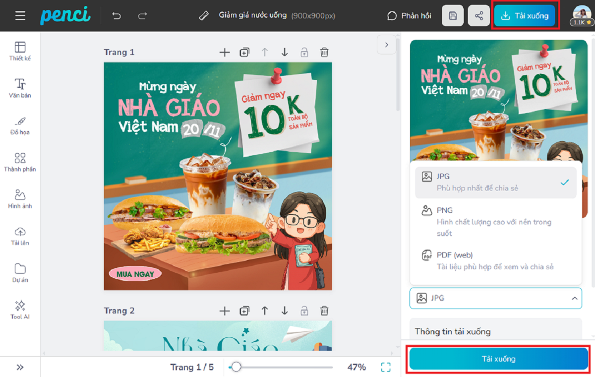 thieke thuvien Tổng hợp mẫu poster 20/11 ấn tượng nhất, các mẫu social post chào mừng ngày Nhà giáo Việt Nam đa dạng phong cách, chỉnh sửa miễn phí By admin | 10 tháng 11 năm 2025 2787 đã đọc Ngày 20/11 – Ngày Nhà giáo Việt Nam không chỉ là dịp để gửi lời cảm ơn đến những người đã “ươm mầm tri thức”, mà còn là cơ hội để mỗi cá nhân, trường học, doanh nghiệp lan tỏa thông điệp tri ân bằng những poster 20/11 và bài đăng mạng xã hội thật ấn tượng. Thay vì thiết kế từ đầu, bạn hoàn toàn có thể chọn ngay mẫu poster 20/11 đẹp, đa dạng phong cách và chỉnh sửa miễn phí trên nền tảng thiết kế trực tuyến penci.vn. Penci có sẵn hàng trăm template 20/11 Thuần Việt được thiết kế riêng ấn tượng, cho phép bạn tùy chỉnh và tải về dùng ngay. >> TẠO NGAY poster 20/11 và social post chúc mừng ngày Nhà giáo Việt Nam miễn phí trên Penci >> Xem thêm các mẫu hashtag cầm tay 20/11 đẹp, thiết kế miễn phí 1/ Tổng hợp các mẫu thiết kế poster chào mừng 20/11 online đẹp, ý nghĩa và ấn tượng nhất Các mẫu poster chúc mừng 20/11 luôn là lựa chọn hàng đầu để tri ân thầy cô và lan tỏa thông điệp tôn sư trọng đạo. Dưới đây là tổng hợp mẫu template poster 20/11 đẹp, ý nghĩa và chuyên nghiệp nhất, giúp bạn dễ dàng thiết kế poster chào mừng ngày Nhà giáo Việt Nam chỉ trong vài phút. >> Tham khảo các mẫu thiệp chúc mừng 20/11 đẹp, độc quyền tại Penci Tùy chỉnh mẫu poster chúc mừng 20/11 ấn tượng này Chỉnh sửa ngay poster 20/11 ấn tượng để tạo dấu ấn riêng cho social post tri ân thầy cô Tùy chỉnh mẫu poster chúc mừng ngày Nhà giáo Việt Nam. Sử dụng ngay mẫu poster 20/11 để thiết kế social post chào mừng 20/11 đẹp mắt và chuyên nghiệp. Tạo poster chào mừng 20/11 độc đáo với logo, hình ảnh và thông điệp riêng chỉ trong vài phút. >> Xem thêm các mẫu poster chúc mừng ngày Nhà giáo Việt Nam tri ân thầy cô ý nghĩa *Mẹo Thiết Kế Giúp Poster chào mừng ngày Nhà giáo Việt Nam 20/11 Chuyên Nghiệp Hơn - Phối Màu Chủ Đạo: Ưu tiên tông màu ấm (Vàng/ Nâu/Xanh) cho sự trang trọng, hoặc tông Pastel cho sự hiện đại, trẻ trung.- Typography: Chọn font chữ Việt hóa trang trọng cho tri ân và rõ ràng, in đậm cho thông tin quan trọng - Biểu Tượng Ý Nghĩa: Sử dụng các hình ảnh mang tính biểu tượng như sách, ngọn đèn, hoặc hình ảnh người lái đò để truyền tải thông điệp sâu sắc hơn. 2/ Top mẫu poster, banner và social post khuyến mãi 20/11 đẹp, Thiết kế đa phong cách cho mọi ngành hàng Bên cạnh những bài đăng tri ân 20/11, các doanh nghiệp, cửa hàng, quán cà phê hay trung tâm giáo dục có thể tận dụng dịp này để triển khai các chương trình khuyến mãi 20/11, tri ân khách hàng và thầy cô thật ấn tượng. Các mẫu poster khuyến mãi 20/11, banner, social post ngày Nhà giáo Việt Nam sẽ giúp bạn thu hút sự chú ý, tăng tương tác và truyền tải thông điệp tri ân, ưu đãi một cách hiệu quả. Penci gợi ý top các mẫu social post khuyến mãi 20/11 chuyên nghiệp, dễ dàng chỉnh sửa miễn phí, thêm logo, hình ảnh hoặc lời chúc riêng để tạo bài đăng ngày Nhà giáo Việt Nam, poster 20/11, banner khuyến mãi 20/11 cho doanh nghiệp phù hợp với mọi phong cách và ngành hàng. Chỉnh sửa và sử dụng ngay mẫu poster khuyến mãi 20/11 dành cho các cửa hàng đồ ăn thức uống đẹp này Chỉnh sửa ngay poster 20/11 và tạo social post khuyến mãi chào mừng ngày Nhà giáo Việt Nam. Sử dụng banner 20/11 giảm giá này và tạo poster 20/11 chuyên nghiệp cho mọi ngành hàng. Thiết kế 20/11 sáng tạo với mẫu poster livestream 20/11 cho doanh nghiệp đẹp và ấn tượng này Tùy chỉnh ngay mẫu thiết kế poster chào mừng 20/11 online này miễn phí >> Tham khảo tổng hợp các mẫu social post 20/11 đẹp và ấn tượng *Gợi Ý Kích Thước Poster 20/11 Phổ Biến Theo Mục Đích Việc chọn đúng kích thước sẽ giúp thông điệp của bạn hiển thị rõ ràng và không bị cắt xén: In ấn (Treo, Dán): - A1 (594 x 841 mm): Thường dùng cho các banner, poster lớn treo ở sảnh trường hoặc cửa hàng.- A2 (420 x 594 mm) và A3 (297 x 420 mm): Phổ biến dùng để dán trong lớp học, phòng họp hoặc thông báo nội bộ. Social Post 20/11 (Đăng Online): - Vuông (900 x 900 px): Kích thước lý tưởng cho Facebook Feed và Instagram.- Ngang (940 x 788 px): Thường dùng trong đăng bài website, banner facebook. - Story (1080 x 1920 px): Tối ưu cho Facebook/Instagram ở dạng tin 24h. 3/ Hướng dẫn cách thiết kế poster 20/11, social post khuyễn mãi 20/11 nhanh, đẹp và miễn phí cùng Penci Penci là nền tảng thiết kế online dành cho người Việt giúp bạn tự thiết kế poster 20/11, banner khuyến mãi 20/11, social post chúc mừng ngày Nhà giáo Việt Nam 20/11 miễn phí chỉ trong vài phút mà không cần kỹ năng thiết kế chuyên nghiệp. >> Xem thêm cách thiết kế quà tặng 20/11 dành cho thầy cô độc đáo, ý nghĩa Bạn có thể tự thiết kế thiết kế poster chào mừng 20/11 online mới hoặc tùy chỉnh các mẫu poster 20/11, bài đăng khuyến mãi 20/11 hay social post chào mừng ngày Nhà giáo Việt Nam có sẵn, được thiết kế riêng bởi Penci c