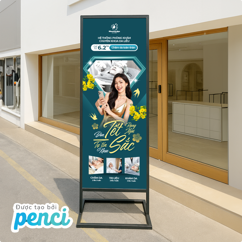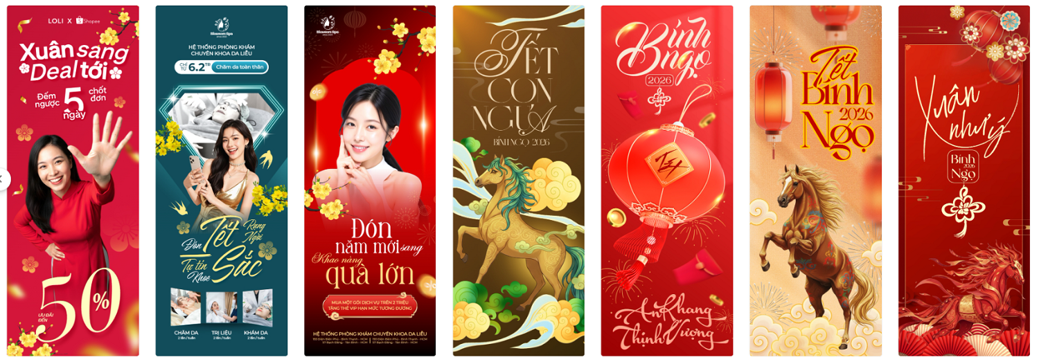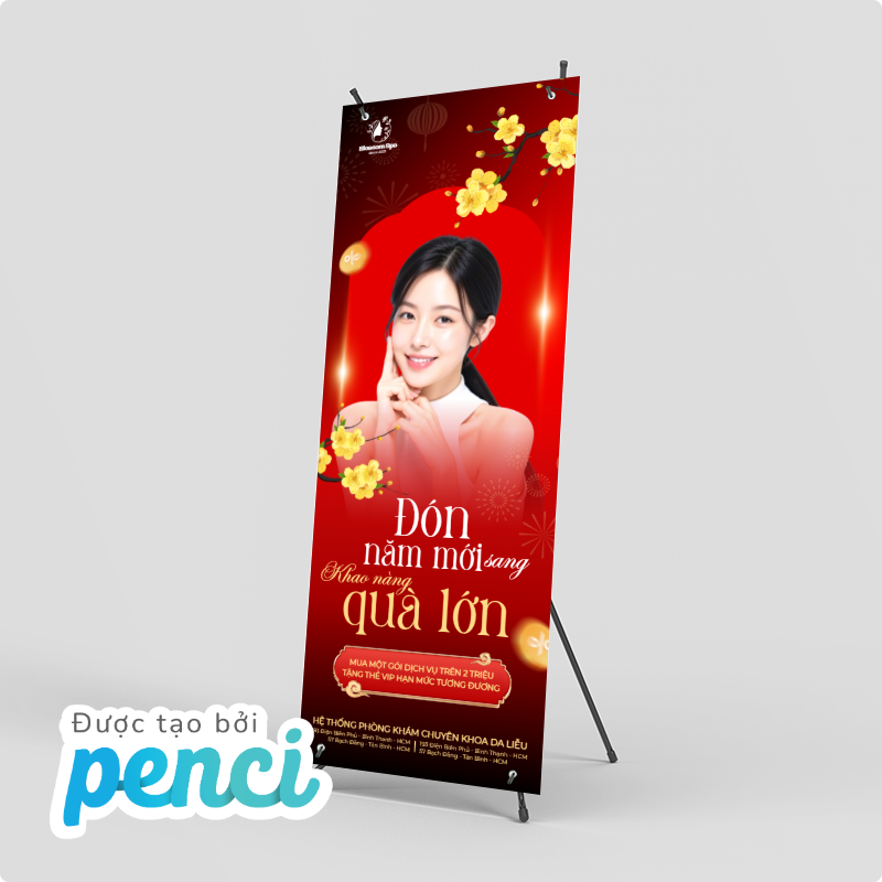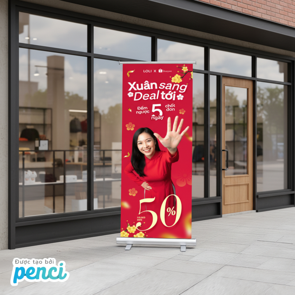 thieke thuvien Tổng hợp mẫu Standee Tết 2026 ấn tượng, Standee chúc mừng năm mới cho các sự kiện, cửa hàng, công ty dịp Tết Bính Ngọ By admin | 31 tháng 12 năm 2025 332 đã đọc Tết luôn là thời điểm “vàng” để doanh nghiệp, cửa hàng và tổ chức sự kiện tăng độ nhận diện thương hiệu, thu hút khách hàng và tạo ấn tượng. Trong đó, standee tết 2026, Standee chúc mừng năm mới được xem là ấn phẩm quảng bá không thể thiếu, xuất hiện ở hầu hết các không gian từ cửa hàng bán lẻ, trung tâm thương mại đến văn phòng công ty, hội chợ, sự kiện tất niên. Bài viết này sẽ giúp bạn tổng hợp mẫu standee Tết 2026 đẹp và ấn tượng, phù hợp cho trang trí cửa hàng, văn phòng công ty hay các sự kiện tất niên, khai xuân dịp Tết. Với các mẫu thiết kế standee Tết 2026 online và tải file thiết kế standee miễn phí của Penci sẽ giúp tiết kiệm thời gian, chi phí mà vẫn đảm bảo tính thẩm mỹ và hiệu quả truyền thông trong mùa Tết Bính Ngọ. Tổng hợp mẫu Standee Tết 2026 nổi bật, ấn tượng thu hút sự chú ý >> Tham khảo ngay các mẫu backdrop, banner cho sự kiện cuối năm 1. Các loại Standee Tết 2026 phổ biến nhất & nên chọn loại standee nào cho cửa hàng, sự kiện, công ty? Để triển khai hiệu quả các chiến dịch trang trí và truyền thông dịp Tết, việc lựa chọn đúng loại standee Tết 2026 là yếu tố rất quan trọng. Mỗi loại standee sẽ phù hợp với từng không gian, mục đích sử dụng và ngân sách khác nhau. Dưới đây là ba loại standee được sử dụng phổ biến nhất hiện nay: 1.1 Standee cuốn (Roll-up Standee) – Phổ biến nhất trong mùa Tết 2026 Standee cuốn là loại standee được sử dụng rộng rãi nhất trong các chiến dịch standee Tết 2026 nhờ thiết kế gọn nhẹ, tính thẩm mỹ cao. Nội dung standee được cuộn gọn bên trong hộp nhôm, giúp việc bảo quản trở nên dễ dàng hơn. Standee cuốn mang tính thẩm mỹ cao cho dịp tết 2026 Ưu điểm khi sử dụng Standee cuốn cho dịp Tết 2026: - Dễ lắp đặt, gọn nhẹ, thuận tiện di chuyển- Có thể tái sử dụng cho nhiều chương trình, sự kiện- Phù hợp với cả standee Tết truyền thống và standee Tết hiện đại- Mang lại cảm giác chuyên nghiệp, sang trọng cho không gian trưng bày Standee cuốn thường được sử dụng làm standee chào mừng năm mới, standee chúc Tết công ty hoặc standee sự kiện Tết như tất niên, khai xuân, hội chợ đầu năm. Loại standee này cũng rất phù hợp để đặt tại sảnh văn phòng, showroom hoặc khu vực tiếp khách nhằm tạo điểm nhấn trang trọng trong dịp Tết. >> Xem ngay các mẫu hashtag chủ đề Tết 2026 bắt trend mới nhất 1.2 Standee chữ X – Giải pháp tiết kiệm cho cửa hàng dịp Tết Standee chữ X là dòng standee có cấu tạo đơn giản với khung chữ X phía sau, được nhiều cửa hàng lựa chọn trong mùa standee Tết 2026 nhờ chi phí thấp và dễ triển khai. Standee chữ X được sử dụng rộng rãi trong dịp Tết Bính Ngọ 2026 Ưu điểm khi sử dụng Standee chữ X chào mừng Tết Bính Ngọ 2026: - Giá thành tiết kiệm, phù hợp ngân sách nhỏ- Dễ in ấn, dễ thay đổi nội dung- Trọng lượng nhẹ, thuận tiện lắp đặt- Phù hợp cho các chiến dịch ngắn hạn Standee chữ X thường được sử dụng trong các chương trình standee sale Tết, standee khuyến mãi Tết và standee Tết cửa hàng nhằm thu hút sự chú ý của khách hàng tại điểm bán. Đây là lựa chọn phù hợp cho các chiến dịch giảm giá, ưu đãi ngắn ngày hoặc trưng bày trước cửa hàng. >> Tham khảo ngay các mẫu thiết kế ảnh sản phẩm Tết đẹp, đặc trưng và miễn phí sử dụng 1.3 Standee chân sắt – Chắc chắn, bền bỉ cho không gian trưng bày lớn Standee chân sắt là loại standee có khung kim loại chắc chắn, độ bền cao và khả năng đứng vững tốt, phù hợp với các không gian cần trưng bày trong thời gian dài dịp standee Tết 2026. Standee chân sắt chào mừng năm mới ấn tượng cho mùa Tết 2026 Ưu điểm khi sử dụng Standee chân sắt cho dịp Tết Bính Ngọ 2026: - Kết cấu vững chắc, hạn chế đổ ngã- Sử dụng lâu dài, thay đổi nội dung linh hoạt- Phù hợp không gian rộng, đông người qua lại Standee chân sắt thường được dùng làm standee chúc mừng năm mới 2026, standee trang trí Tết tại sảnh lớn, trung tâm thương mại hoặc khu vực check-in sự kiện. Loại standee này cũng rất phù hợp cho các standee sự kiện Tết kéo dài nhiều ngày, cần sự ổn định và chắc chắn trong suốt quá trình trưng bày. >> Tham khảo ngay kích thước Standee chuẩn in ấn 2. Tổng hợp mẫu Standee Tết 2026 đẹp, ấn tượng cho cửa hàng, sự kiện & doanh nghiệp Các mẫu standee Tết 2026 độc quyền của Penci được thiết kế sẵn với bố cục hoàn chỉnh, nội dung linh hoạt và phong cách đa dạng, giúp người dùng dễ dàng lựa chọn và sử dụng ngay mà không tốn nhiều thời gian thiết kế từ đầu. Chỉ với vài thao tác đơn giản, bạn đã có thể chỉnh sửa nội dung, kích thước và tải file sử dụng ngay hoặc in standee theo yêu cầu với Penci. Mẫu standee Tết 2026 phong cách truyền thống 