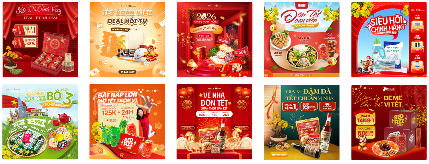 thieke thuvien Tổng hợp mẫu thiết kế ảnh sản phẩm Tết 2026 đẹp cho Shopee, TikTok Shop, website bán hàng online ấn tượng By admin | 31 tháng 12 năm 2025 238 đã đọc Trong mùa cao điểm mua sắm cuối năm, ảnh sản phẩm Tết 2026 không chỉ đơn thuần là hình minh họa sản phẩm, mà đã trở thành công cụ quảng cáo, bán hàng và xây dựng thương hiệu cực kỳ quan trọng. Dù bạn bán trên Shopee, TikTok Shop hay website bán hàng online, việc thiết kế ảnh sản phẩm Tết 2026 đẹp, đúng chuẩn và bắt trend sẽ giúp tăng tỷ lệ click, giữ chân người xem và thúc đẩy chuyển đổi mạnh mẽ. Bài viết này sẽ giúp bạn nắm rõ quy chuẩn thiết kế ảnh sản phẩm Tết 2026 chuẩn nhất, tham khảo các mẫu ảnh bán hàng Tết cho shop online hiệu quả và cách tải mẫu ảnh sản phẩm Tết độc quyền miễn phí của Penci để sử dụng ngay cho dịp Tết Bính Ngọ năm nay. Tải ngay các mẫu thiết kế ảnh sản phẩm ấn tượng và nổi bật miễn phí với Penci >> Tham khảo ngay các mẫu poster sản phẩm Tết Bính Ngọ 2026 đẹp, ấn tượng 1. Quy chuẩn thiết kế ảnh sản phẩm Tết 2026 Shopee, TikTok Shop hay website bán hàng online Để ảnh sản phẩm Tết 2026 hiển thị sắc nét, tải nhanh và không bị các sàn thương mại điện tử “bóp” tương tác, người bán cần tuân thủ đồng thời các tiêu chuẩn kỹ thuật lẫn quy tắc thiết kế thị giác. 1.1. Quy chuẩn kỹ thuật cơ bản Thiết kế ảnh sản phẩm Shopee, ảnh sản phẩm Tiktok Shop thường được hiển thị trên mobile là chủ yếu. Vì vậy, thông số kỹ thuật ảnh cần được tối ưu ngay từ đầu để đảm bảo trải nghiệm người dùng và tốc độ tải trang. Một số thông số cơ bản nhưng bắt buộc gồm: - Tỉ lệ khung hình: 1:1 (vuông) – chuẩn cho ảnh đại diện sản phẩm- Kích thước khuyến nghị: 900 × 900px- Định dạng file: .JPG (nhẹ, dễ tải) hoặc .PNG (khi cần độ nét cao)- Dung lượng ảnh: dưới 500KB để tải nhanh trên mobile Khung ảnh sản phẩm Tết được tối ưu hiển thị giúp nổi bật gian hàng 1.2. Màu sắc và concept chủ đạo Tết 2026 (Bính Ngọ) Tết 2026 là năm Bính Ngọ, thuộc mệnh Thiên Hà Thủy. Do đó, khi thiết kế ảnh sản phẩm Tết chuẩn hiển thị cho Shopee hay ảnh sản phẩm Tết bán hàng TikTok Shop thì màu sắc và biểu tượng nên được lựa chọn có chủ đích để vừa hợp phong thủy, vừa phù hợp xu hướng thẩm mỹ hiện đại. Về bảng màu chủ đạo, có thể kết hợp linh hoạt các nhóm màu sau: - Đỏ & vàng kim: màu truyền thống, tượng trưng may mắn, tài lộc và không khí lễ Tết. - Xanh dương (mệnh Thủy): tạo cảm giác hiện đại, hợp phong thủy năng lượng năm 2026 Bính Ngọ- Cam đào / hồng san hô: gam màu xu hướng, trẻ trung cho năm 2026 Thiết kế ảnh sản phẩm Tết 2026 nổi bật với các gam màu chủ đạo 1.3. Nguyên tắc bố cục giúp ảnh sản phẩm Tết 2026 dễ thu hút ánh nhìn Một thiết kế đẹp không chỉ nằm ở màu sắc mà còn ở cách sắp xếp bố cục. Với ảnh sản phẩm Tết bán hàng online, bố cục rõ ràng sẽ giúp khách hàng nhận diện sản phẩm chỉ trong vài giây đầu tiên. Một số nguyên tắc quan trọng cần áp dụng: - Quy tắc 1/3: Đặt sản phẩm tại các điểm giao nhau của lưới 1/3 để thu hút ánh nhìn tự nhiên, giúp sản phẩm trở thành điểm nhấn chính.- Tránh rối mắt: Dù là chủ đề Tết với nhiều chi tiết trang trí, bạn vẫn nên tiết chế. Sản phẩm phải luôn là “nhân vật chính”, còn khung cảnh Tết chỉ đóng vai trò làm nền.- Khoảng thở (negative space): Giữ khoảng trống hợp lý giúp ảnh trông cao cấp hơn và dễ chèn text khi cần chạy quảng cáo. Bố cục mẫu ảnh sản phẩm Tết sale chuẩn >> Tham khảo thêm các mẫu khung viền ảnh sản phẩm chủ đề Tết 2026 độc đáo 2. Tổng hợp mẫu thiết kế ảnh sản phẩm Tết 2026 đẹp, bắt trend cho Shopee, TikTok Shop hay website bán hàng online hiệu quả Làm sao để thiết kế ảnh sản phẩm Tết 2026 cho mùa bán hàng cuối năm hiệu quả? Nếu không rành thiết kế, không có thời gian để lên ý tưởng thì các template Tết 2026 hay các mẫu ảnh bán hàng dịp Tết miễn phí của Penci chính là giải pháp nhanh gọn. Kho mẫu ảnh sản phẩm Tết bán hàng 2026 được thiết kế sẵn theo chuẩn bán hàng trên các nền tảng Shopee, TikTok Shop hay website, với đa dạng phong cách, bố cục rõ ràng, màu sắc bắt trend và dễ áp dụng cho nhiều ngành hàng. Penci cho phép người dùng chỉnh sửa mẫu online và tải xuống miễn phí chỉ trong vài bước, phù hợp cho shop online hay các nhà bán lẻ. Mẫu thiết kế ảnh sản phẩm Tết 2026 miễn phí Mẫu ảnh bán hàng Tết cho shop online đẹp, bắt trend bán hàng online Mẫu ảnh sản phẩm Tết bán hàng 2026 bố cục chuẩn, dùng cho quảng cáo sản phẩm Thiết kế ảnh bán hàng dịp Tết chuyên nghiệp, tối ưu hiển thị bán hàng cho TikTok Shop Mẫu thiết kế ảnh sản phẩm Tết 2026 cho Shopee Template ảnh sản phẩm Tết 2026 sang trọng, hiện đại cho mọi ngành hàng Poster sản phẩm Tết đẹp, nổi bật và ấn tượng >> Xem ngay Thư viện mẫu thiết kế ảnh sản ph