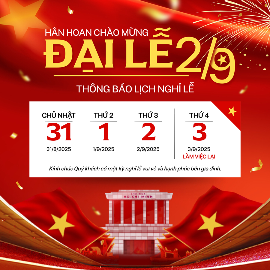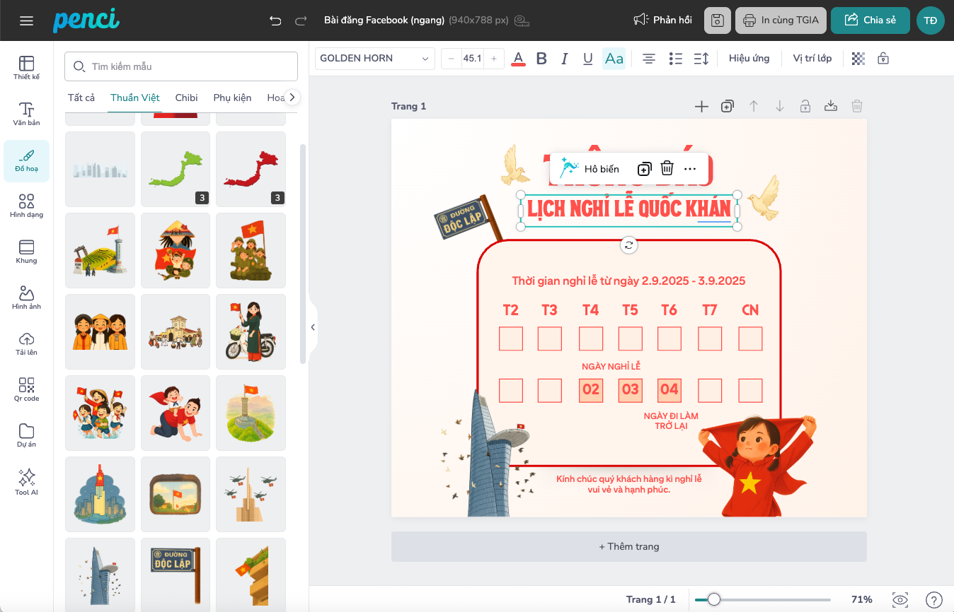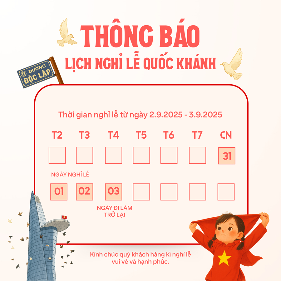 thieke thuvien Tổng hợp mẫu thông báo nghỉ lễ Quốc Khánh 2/9 mới nhất dành cho công ty, doanh nghiệp năm 2026 By admin | 13 tháng 08 năm 2025 7876 đã đọc 1. Vì sao thông báo nghỉ lễ cần đăng dạng hình ảnh? Trong thời đại mạng xã hội lên ngôi, thông báo nghỉ lễ không chỉ là văn bản khô khan mà còn là cơ hội để doanh nghiệp tạo dấu ấn thương hiệu. Một hình ảnh thông báo được thiết kế bắt mắt, đồng bộ màu sắc thương hiệu sẽ giúp thông tin nổi bật hơn, dễ ghi nhớ hơn so với dòng chữ đơn thuần. Đặc biệt, hình ảnh dễ dàng chia sẻ trên nhiều nền tảng như Facebook, Zalo, Email… mà không làm mất bố cục. Điều này vừa truyền tải thông tin nhanh chóng, vừa thể hiện sự chuyên nghiệp của công ty trong mắt khách hàng và đối tác. 2. Sử dụng mẫu có sẵn của Penci tiết kiệm thời gian Thay vì dành hàng giờ để tự thiết kế từ con số 0, bạn có thể tận dụng kho mẫu thông báo nghỉ lễ Quốc Khánh 2/9 được Penci chuẩn bị sẵn. Các mẫu này được tối ưu về bố cục, màu sắc, font chữ và hình ảnh gắn liền với tinh thần ngày lễ, giúp bạn chỉ cần vài phút chỉnh sửa là đã có thiết kế hoàn chỉnh. Bạn có thể thay logo, chỉnh thông tin ngày nghỉ, hoặc đổi màu sắc sao cho phù hợp với bộ nhận diện của doanh nghiệp. Nhờ vậy, vừa tiết kiệm thời gian, vừa đảm bảo sản phẩm cuối cùng vẫn chuyên nghiệp, bắt mắt và đúng tinh thần thương hiệu. Giao diện kéo thả trực quan của công cụ thiết kế trực tuyến Penci 3. Mẫu thông báo nghỉ lễ Quốc Khánh 2/9 của Penci Để giúp bạn dễ dàng chọn lựa, Penci đã thiết kế ra các mẫu thông báo nghỉ lễ 2/9 mới nhất, được thiết kế với nhiều phong cách khác nhau, từ trang trọng, lịch sự đến trẻ trung, hiện đại. Mỗi mẫu đều tuân theo bố cục rõ ràng, nhấn mạnh vào nội dung chính là thời gian nghỉ và đi làm lại, đồng thời kết hợp hình ảnh và màu sắc đặc trưng của Quốc Khánh Việt Nam như đỏ, vàng, sao vàng, hoặc các họa tiết mang đậm bản sắc Việt. Xem thêm: Thư viện tổng hợp mẫu thông báo nghỉ lễ Quốc Khánh 2/9 mới nhất dành cho công ty, doanh nghiệp Dưới đây là một số mẫu gợi ý mà bạn có thể sử dụng và tùy chỉnh ngay: Tùy chỉnh mẫu này Tùy chỉnh mẫu này Tùy chỉnh mẫu này Tùy chỉnh mẫu này Tùy chỉnh mẫu này Tùy chỉnh mẫu này Tùy chỉnh mẫu này Tùy chỉnh mẫu này Tùy chỉnh mẫu này Tùy chỉnh mẫu này Tùy chỉnh mẫu này Tùy chỉnh mẫu này Tùy chỉnh mẫu này Tùy chỉnh mẫu này Tùy chỉnh mẫu này Tùy chỉnh mẫu này Tùy chỉnh mẫu này Sử dụng mẫu này Sử dụng mẫu này Sử dụng mẫu này Sử dụng mẫu này Sử dụng mẫu này Xem thêm: https://penci.vn/tin-tuc/50-mau-background-quoc-khanh-29-dep-y-nghia-va-link-tai-mien-phi-2026.html Đừng để thông báo nghỉ lễ của công ty trở nên nhàm chán và bị bỏ qua. Truy cập ngay Thư viện mẫu để chọn và tùy chỉnh bài thông báo nghỉ lễ Quốc Khánh 2/9 phù hợp, chỉnh sửa chỉ trong vài phút và đăng tải lên mọi kênh truyền thông của bạn. Với Penci, bạn không chỉ tiết kiệm thời gian mà còn lan tỏa thông điệp một cách chuyên nghiệp và ấn tượng. Hãy bắt đầu thiết kế ngay hôm nay để kịp đăng thông báo trước kỳ nghỉ lễ. Penci - Công cụ thiết kế của người Việt, dành cho người Việt Đã sao chép