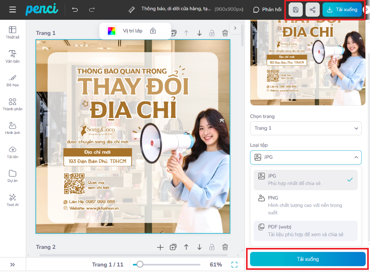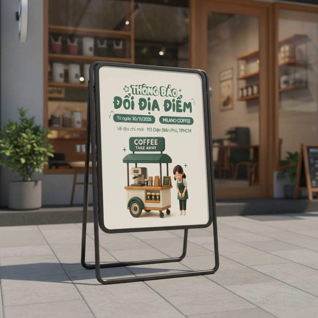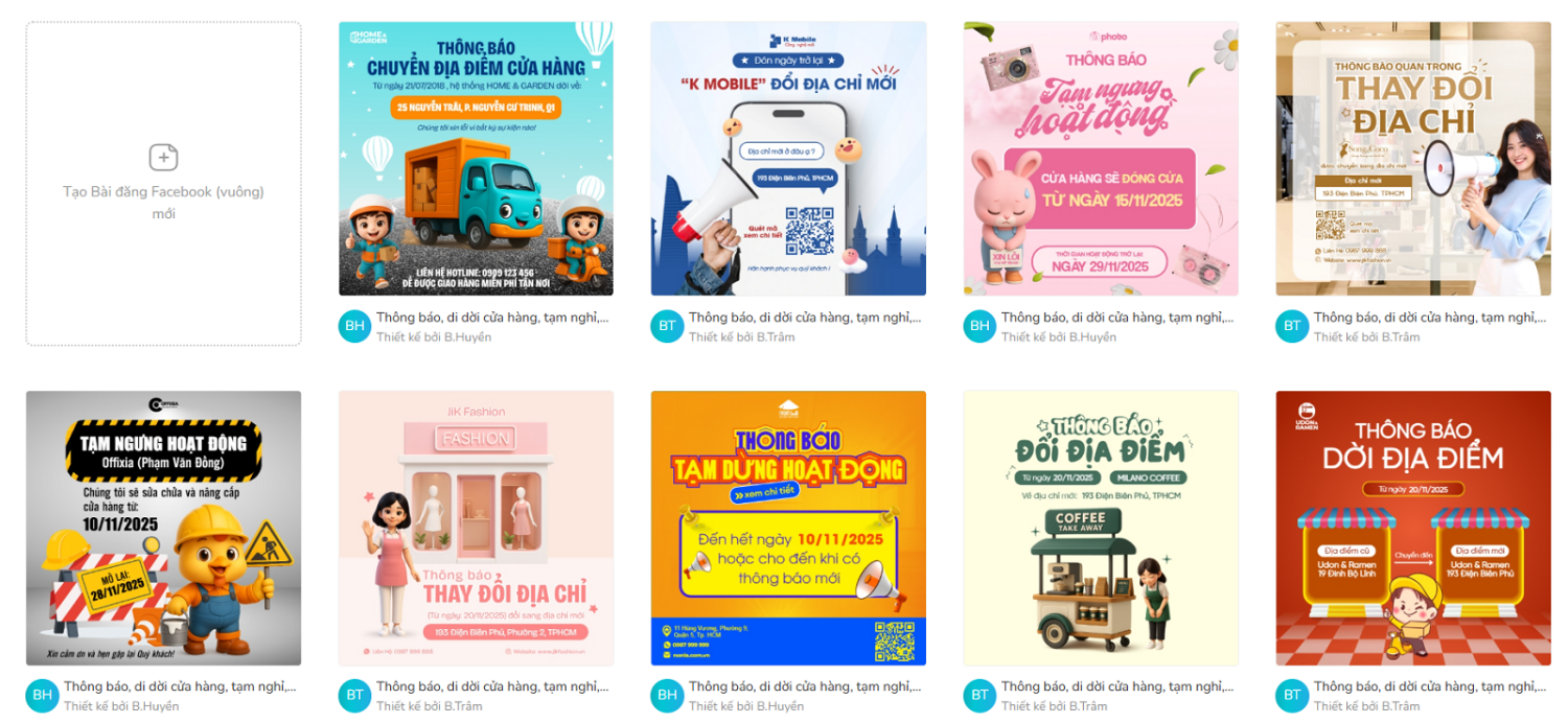 thieke thuvien Top 10 mẫu poster thông báo di dời cửa hàng, thay đổi địa chỉ công ty chuyên nghiệp, chỉnh sửa miễn phí với Penci By admin | 06 tháng 11 năm 2025 1485 đã đọc Khi một cửa hàng hay công ty chuyển địa điểm, điều đầu tiên khách hàng quan tâm chính là: “Bạn sẽ chuyển đến đâu?” Việc tạo poster thông báo di dời cửa hàng hoặc mẫu thông báo thay đổi địa chỉ công ty rõ ràng, chuyên nghiệp không chỉ giúp khách hàng dễ dàng tìm thấy bạn mà còn thể hiện hình ảnh thương hiệu đáng tin cậy và nhất quán. Dù bạn là chủ shop thời trang, quán cà phê, spa hay công ty mỹ phẩm, việc có một bài đăng thông báo chuyển địa điểm cửa hàng được thiết kế chỉn chu, đẹp mắt sẽ giúp giữ chân khách cũ, thu hút khách mới. Cùng Penci khám phá ngay Top 10 mẫu poster thông báo di dời cửa hàng, mẫu thông báo thay đổi địa chỉ công ty, mẫu thông báo chuyển văn phòng, mẫu thông báo thay đổi trụ sở công ty hay poster tạm ngưng hoạt động đẹp, cho phép bạn tự thiết kế post thông báo chuyên nghiệp chỉ trong vài phút. >> Xem thêm các mẫu poster tuyển dụng chuyên nghiệp, phù hợp nhiều ngành nghề Poster thông báo tạm ngưng hoạt động đặt trước cửa hàng để thông báo 1. Cấu trúc chuẩn của mẫu thông báo chuyển địa điểm cửa hàng, thay đổi địa chỉ công ty chuyên nghiệp Ngoài mẫu thông báo tạm ngưng hoạt động file word/ pdf, các cửa hàng còn cần mẫu bài đăng thông báo thay đổi địa chỉ công ty hoặc poster thông báo di dời cửa hàng. Cấu trúc chuẩn của 1 bài đăng thông báo chuyển địa điểm cửa hàng hiệu quả cần đảm bảo 4 yếu tố quan trọng sau: 1. Tiêu đề nổi bật và dễ nhớ Tiêu đề là phần thu hút đầu tiên, nên ngắn gọn, chứa từ khóa chính và thể hiện rõ nội dung di dời. Ví dụ: “[Tên thương hiệu] chính thức chuyển đến địa chỉ mới từ [ngày/tháng]!” “Công ty [Tên công ty] chuyển văn phòng – Hẹn gặp bạn tại địa điểm mới tiện nghi hơn!” 2. Thông tin chi tiết và rõ ràng Hãy trình bày rõ ràng, dễ đọc các thông tin quan trọng như: - Địa chỉ cũ → Địa chỉ mới - Ngày bắt đầu chuyển địa điểm, thời gian tạm ngưng hoạt động - Số hotline và bản đồ Google Maps (nếu có) Bài đăng thông báo thay đổi địa điểm cửa hàng trên các nền tảng mạng xã hội 3. Thông điệp cảm ơn và giữ kết nối Thêm lời cảm ơn khách hàng đã đồng hành, kèm lời mời ghé thăm địa điểm mới. Bên cạnh đó, bạn có thể kết hợp ưu đãi khai trương, voucher giảm giá hoặc mini game check-in để tăng tương tác là tỷ lệ quay lại. 4. Thiết kế poster thông báo thay đổi địa chỉ công ty trực quan và nhận diện thương hiệu Một poster thông báo tạm ngưng hoạt động hay poster thông báo chuyển địa điểm cửa hàng nên có: - Màu sắc nhận diện thương hiệu - Font chữ và logo đồng bộ - Hình ảnh địa điểm mới (nếu có) - Bố cục rõ ràng, dễ đọc ngay cả bản in ấn và các bài đăng trên mạng xã hội. >> Truy cập Penci để chọn từ hàng trăm mẫu poster thông báo miễn phí, chuyên nghiệp 2. Gợi ý top 10 mẫu poster thông báo di dời cửa hàng & thay đổi địa chỉ công ty đẹp, chuyên nghiệp và miễn phí Dưới đây là bộ mẫu thiết kế poster thông báo chuyển địa điểm cửa hàng, mẫu thông báo thay đổi địa chỉ công ty được thiết kế đẹp, chuẩn thương hiệu, dễ chỉnh sửa, miễn phí dành riêng cho các doanh nghiệp Việt. Bắt đầu ngay với mẫu thông báo chuyển địa điểm cửa hàng chuyên nghiệp cho công ty dịch vụ giao nhận, sửa chữa nhà cửa. Khám phá ngay mẫu thông báo chuyển địa điểm cửa hàng bắt trend, dễ chỉnh sửa, thu hút khách hàng. Tạo ngay mẫu thông báo tạm ngưng hoạt động dễ thương cho tiệm photobooth, shop mỹ phẩm và quần áo. Thiết kế ngay mẫu thông báo thay đổi địa chỉ sang trọng cho cửa hàng thời trang và mỹ phẩm cao cấp. Chỉnh sửa ngay mẫu thông báo tạm ngưng hoạt động để sửa chữa, nâng cấp cửa hàng, nhanh chóng và chuẩn chỉnh. Bắt đầu thiết kế mẫu thông báo thay đổi địa chỉ thời trang, nổi bật và đúng phong cách thương hiệu. Tùy chỉnh ngay mẫu thông báo tạm ngưng hoạt động đơn giản, dễ đọc, dễ nhớ, chuẩn nhận diện. Tạo liền tay mẫu thông báo thay đổi địa điểm cho quán cà phê, tinh tế và gần gũi khách hàng. Chọn ngay mẫu thông báo dời địa điểm đơn giản, tinh tế, dễ chỉnh sửa và in ấn chuyên nghiệp. Thiết kế ngay mẫu thông báo tạm ngưng hoạt động chuyên nghiệp, giúp khách cập nhật thông tin nhanh nhất. 3. Hướng dẫn cách thiết kế poster thông báo chuyển địa điểm cửa hàng nhanh, đẹp và miễn phí cùng Penci Penci là nền tảng thiết kế online dành cho người Việt, giúp bạn tự thiết kế poster thông báo chuyển địa điểm cửa hàng, mẫu thay đổi địa chỉ công ty hay poster tạm ngưng hoạt động chỉ trong vài phút mà hoàn toàn miễn phí và không cần kỹ năng thiết kế chuyên nghiệp. >> Xem VIDEO HƯỚNG DẪN thiết kế poster thông báo thay đổi địa điểm công ty chi tiết