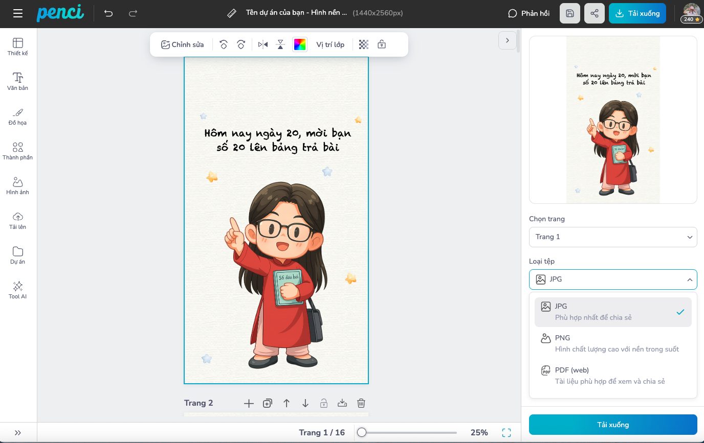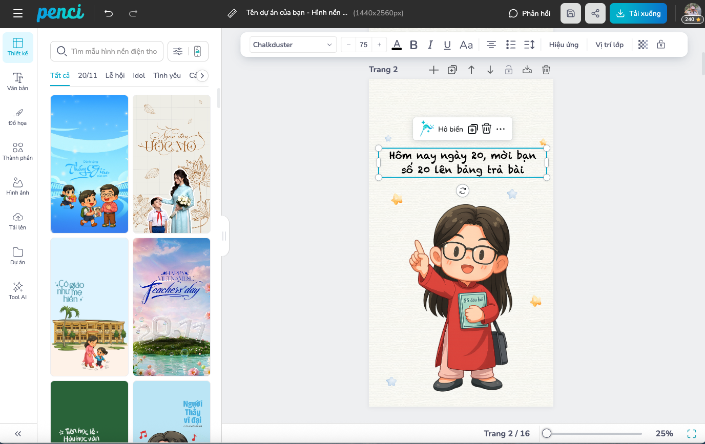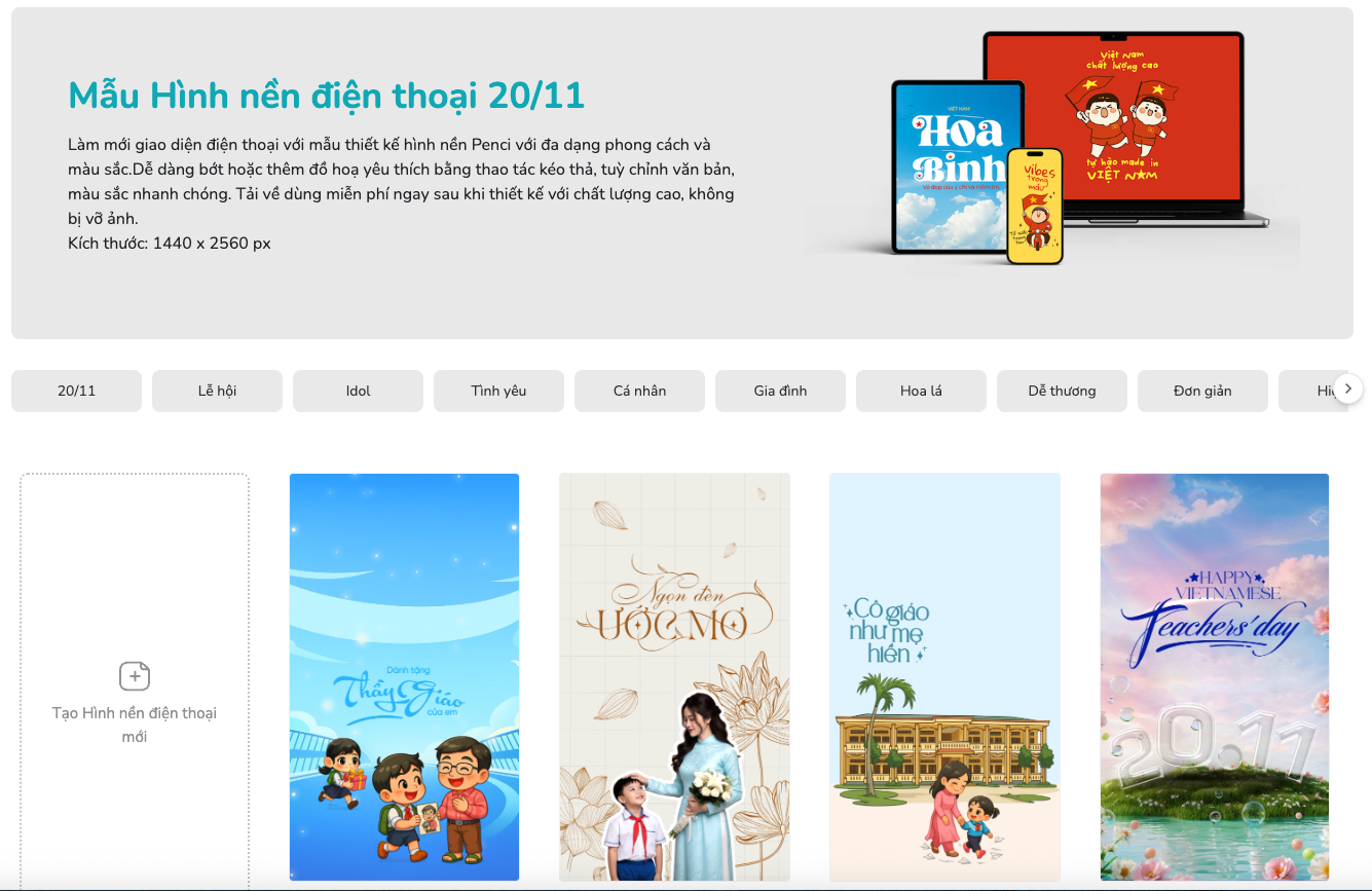 thieke thuvien Trọn bộ hình nền 20/11 ngày Nhà giáo Việt Nam được Penci thiết kế riêng để tri ân thầy cô By admin | 11 tháng 11 năm 2025 19918 đã đọc Hình nền 20/11 là cách tuyệt vời để bạn lan tỏa không khí tri ân thầy cô nhân ngày Nhà giáo Việt Nam. Bộ sưu tập hình nền 20/11 độc đáo từ Penci giúp bạn làm mới giao diện điện thoại, máy tính hay mạng xã hội. Dành cho giáo viên muốn lưu giữ niềm tự hào nghề nghiệp, hay học sinh muốn thiết kế và gửi tặng thầy cô món quà tinh thần đặc biệt. Cùng Penci khám phá ngay nhé. 1. Hình nền 20/11 cho điện thoại, miễn phí 2025 Những mẫu hình nền 20/11 được Penci thiết kế độc quyền theo phong cách chibi vẽ tay thuần Việt, dễ thương nhưng vẫn sang trọng và ý nghĩa. Bộ sưu tập giúp giáo viên lưu giữ niềm tự hào nghề giáo và học sinh dễ dàng tạo nên món quà tri ân ý nghĩa, đậm chất Việt Nam. >> Xem trọn bộ Hình nền 20/11 cho điện thoại, miễn phí Tùy chỉnh và tải hình ảnh chất lượng cao Tùy chỉnh và tải hình ảnh chất lượng cao Tùy chỉnh và tải hình ảnh chất lượng cao Tùy chỉnh và tải hình ảnh chất lượng cao Tùy chỉnh và tải hình ảnh chất lượng cao Tùy chỉnh và tải hình ảnh chất lượng cao Tùy chỉnh và tải hình ảnh chất lượng cao Tùy chỉnh và tải hình ảnh chất lượng cao Tùy chỉnh và tải hình ảnh chất lượng cao Sáng tạo hình nền ngay Sáng tạo hình nền ngay Sáng tạo hình nền ngay Với Penci, bạn có thể dễ dàng tự tạo hình nền 20/11 mang dấu ấn riêng thêm ảnh, lời chúc, hoặc nhân vật chibi mô phỏng chính mình hay thầy cô. Giáo viên dùng để lưu giữ niềm tự hào nghề giáo, còn học sinh có thể biến ý tưởng thành món quà online tri ân độc quyền, đơn giản mà ý nghĩa. >> Bắt đầu sáng tạo hình nền 20/11 tại đây. 2. Cách tải và cài đặt hình nền 20/11 đơn giản nhất Bước 1: Đến thư viện và chọn mẫu thiết kế hình nền điện thoại Truy cập thư viện thiết kế của Penci, chọn mẫu hình nền 20/11 yêu thích, đa dạng chủ đề thầy cô, bạn bè, mái trường, tri thức,… để lựa chọn. Các mẫu thiết kế đã có kích thước chuẩn HD cho điện thoại là 1440 x 2560 px. >> Xem trọn bộ Hình nền 20/11 cho điện thoại, miễn phí Bước 2: Chỉnh sửa tùy thích. Bạn có thể thêm tên, chèn lời chúc, hoặc chỉnh màu nền để tạo hình ảnh mang dấu ấn riêng. Đặc biệt, nếu là giáo viên, bạn có thể yêu cầu Penci AI tạo hình nền chibi mô phỏng chính bạn trong trang phục sư phạm, vừa vui nhộn vừa truyền cảm hứng nghề nghiệp. Còn với học sinh, đây là cơ hội tuyệt vời để tự tay thiết kế hình nền tặng thầy cô kèm lời chúc “made by chính mình”. Bước 3: Tải về và đặt làm hình nền. Sau khi hoàn tất chỉnh sửa, bạn có thể tải về miễn phí với chất lượng cao theo định dạng JPG, để dùng làm hình nền điện thoại hoặc gửi tặng thầy cô qua mạng xã hội, Facebook, Zalo. 3. Vì sao nên chọn thiết kế hình nền 20/11 tại Penci? - Kho hình nền thuần Việt, vẽ tay độc quyền: Penci sở hữu hàng triệu mẫu đồ họa chibi được hoạ sĩ Việt sáng tạo riêng cho dịp 20/11.- Dễ dùng, cá nhân hoá nhanh: Chỉ cần vài thao tác kéo thả, người dùng có thể chỉnh sửa, thêm tên, chèn hình thầy cô.- Tích hợp AI thông minh: Giúp tạo ra hình ảnh chibi, đồ hoạ 20/11 từ mô tả tiếng Việt như “cô giáo mặc áo dài cầm phấn giảng bài” hay “thầy giáo đang đọc sách dưới cây phượng”.- Phù hợp mọi đối tượng: Giáo viên muốn gợi nhớ nghề nghiệp, học sinh muốn thiết kế hình ảnh tặng thầy cô, tất cả đều dễ dàng thực hiện trên cùng một nền tảng. Hình nền 20/11 không chỉ là hình ảnh trang trí, mà còn là cách thể hiện lòng biết ơn và tự hào nghề giáo. Với Penci, bạn có thể tạo ra những hình nền mang cảm xúc thật, câu chuyện thật. Dù là giáo viên lưu giữ tinh thần “người lái đò”, hay học sinh gửi lời cảm ơn bằng món quà kỹ thuật số nhỏ bé nhưng chân thành. >> Xem trọn bộ Hình nền 20/11 cho điện thoại, miễn phí Penci - Thiết kế dễ dàng, đậm chất Việt Đã sao chép